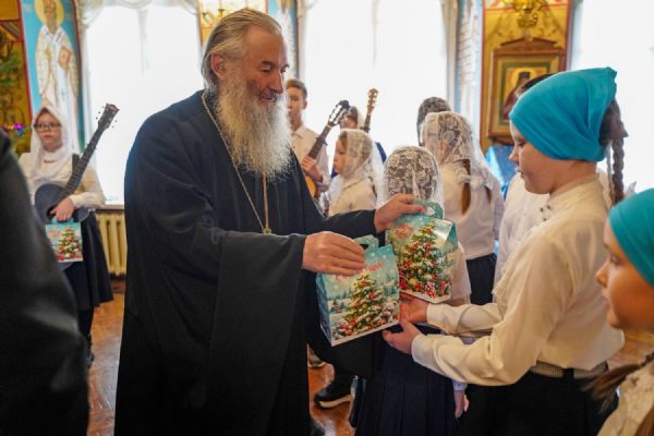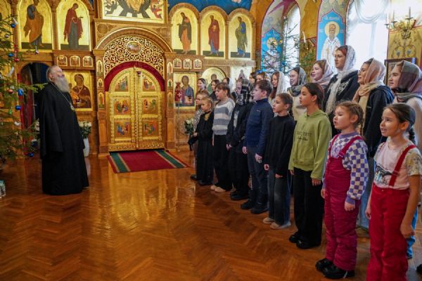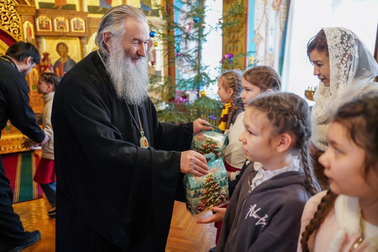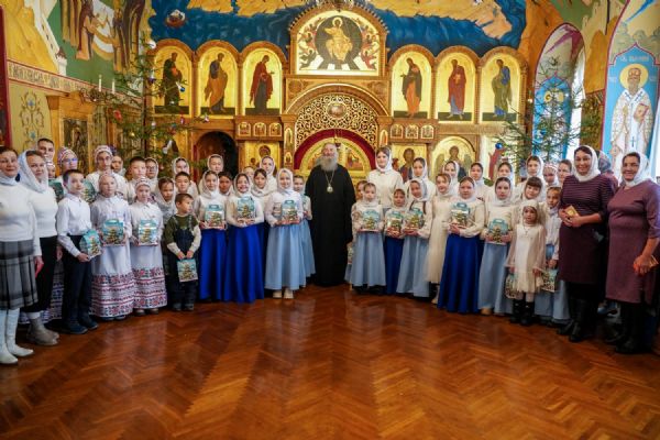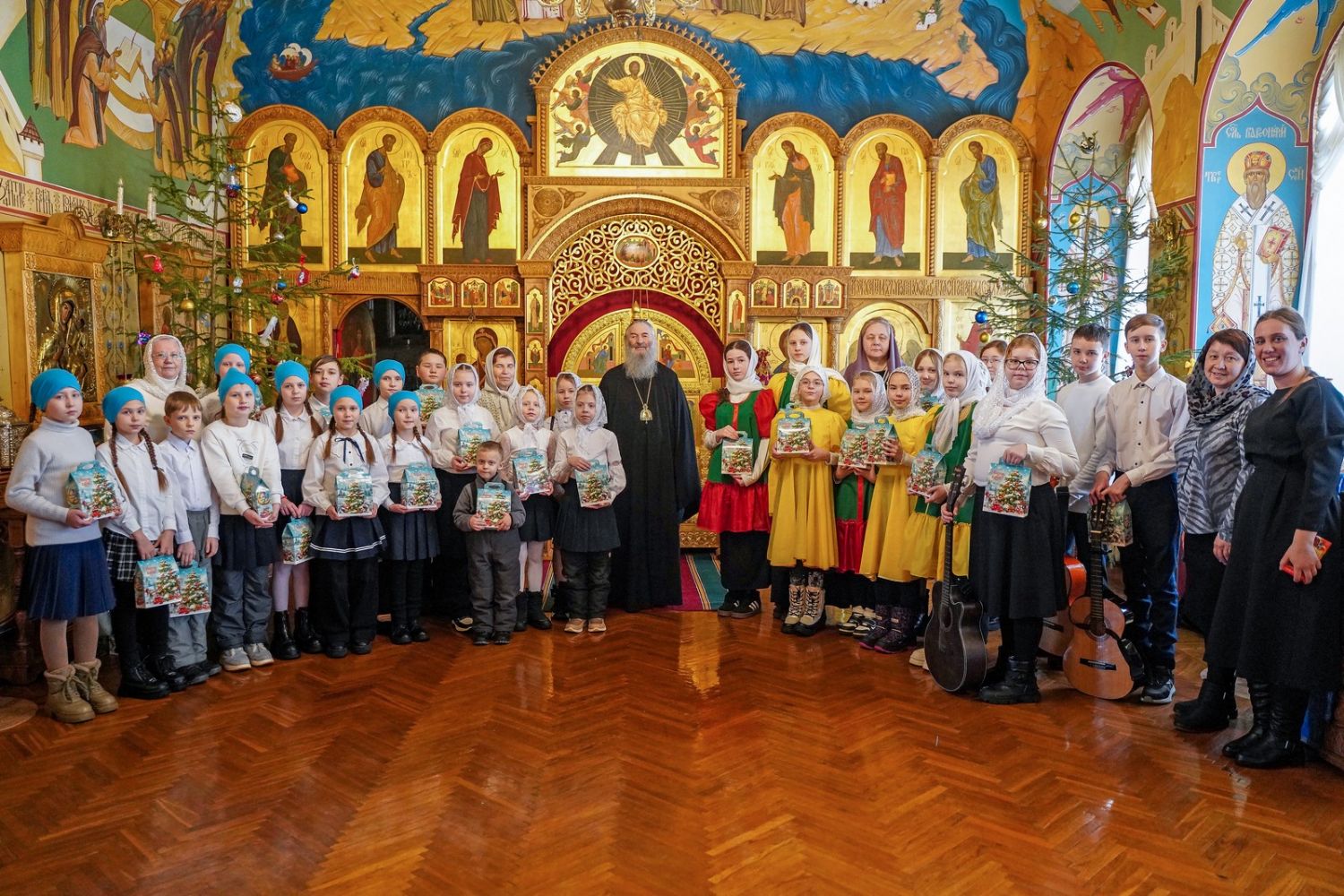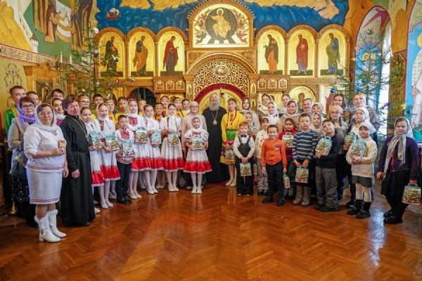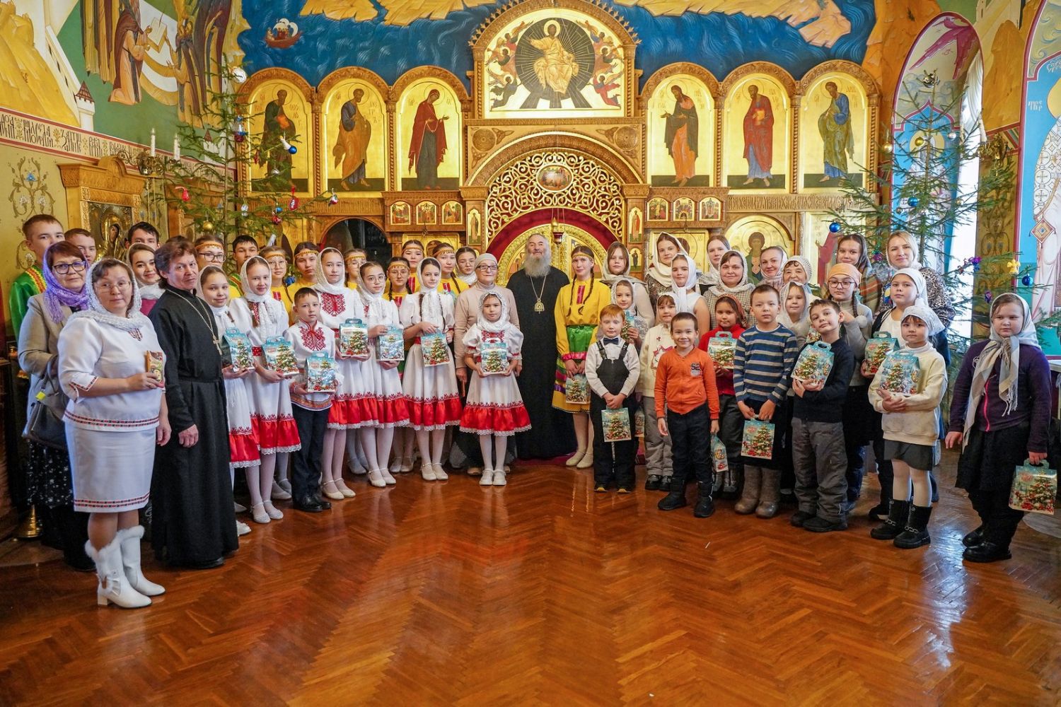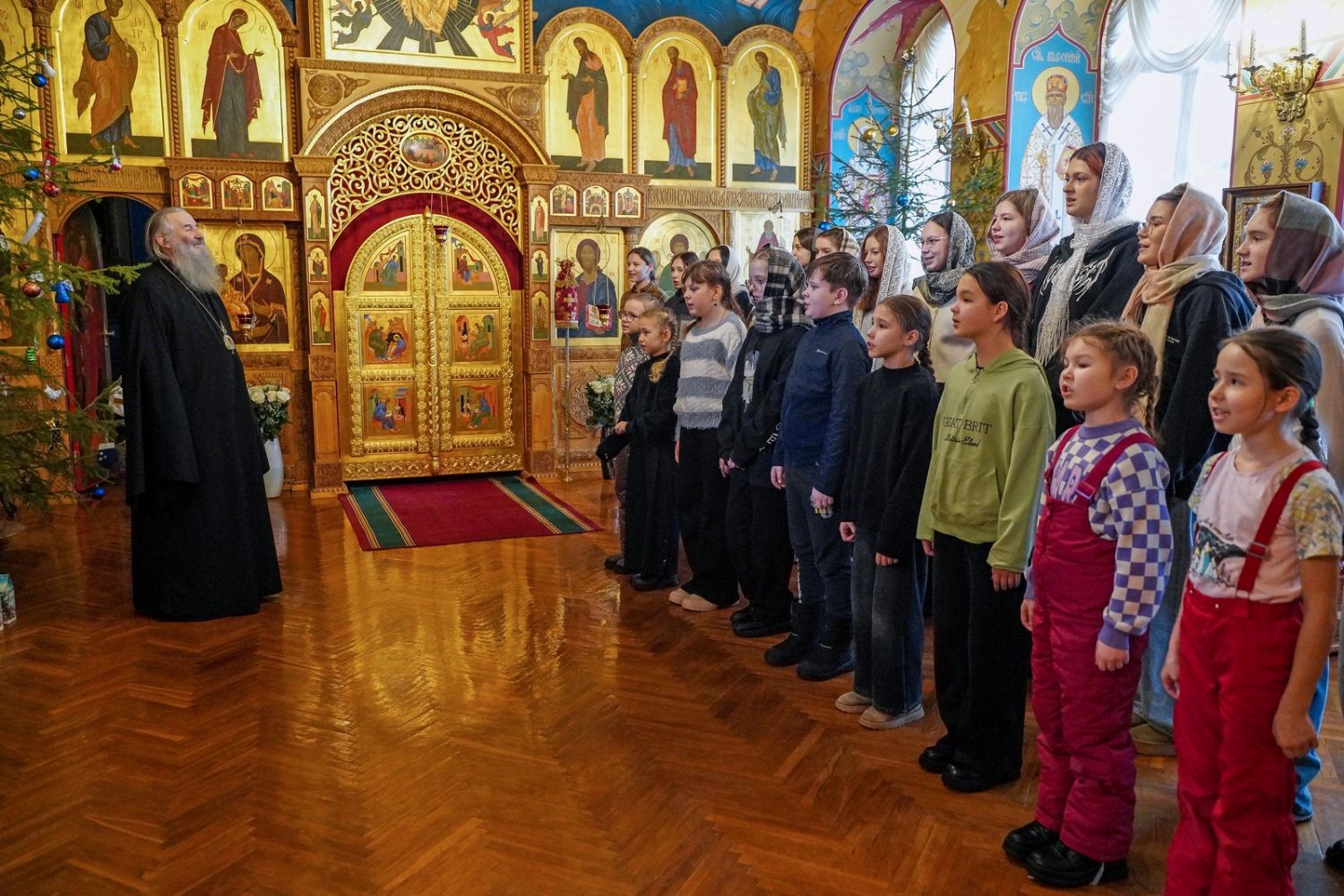 А после обеда детские коллективы с руководителями и священниками сельских храмов отправились в Йошкар-Олинское епархиальное управление поздравлять митрополита Иоанна со светлым праздником. Делясь радостью о Рождшемся Богомладенце, ребята исполнили колядки, рождественские песни и стихи, а владыка вручил детям сладкие подарки.