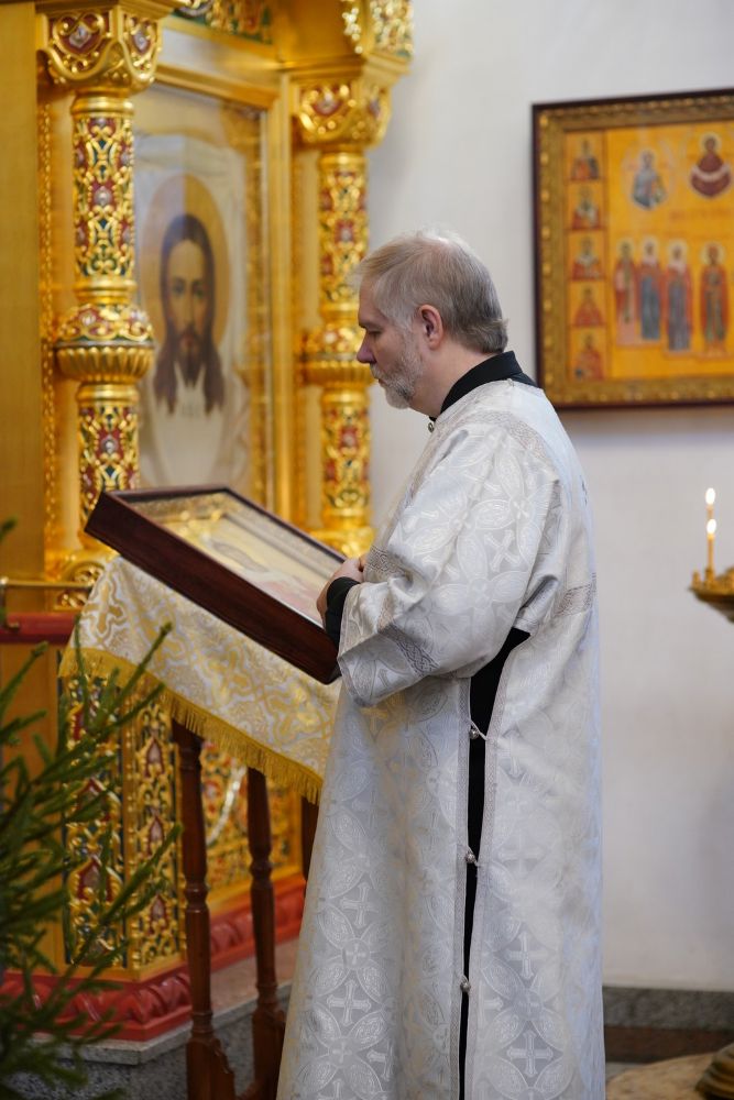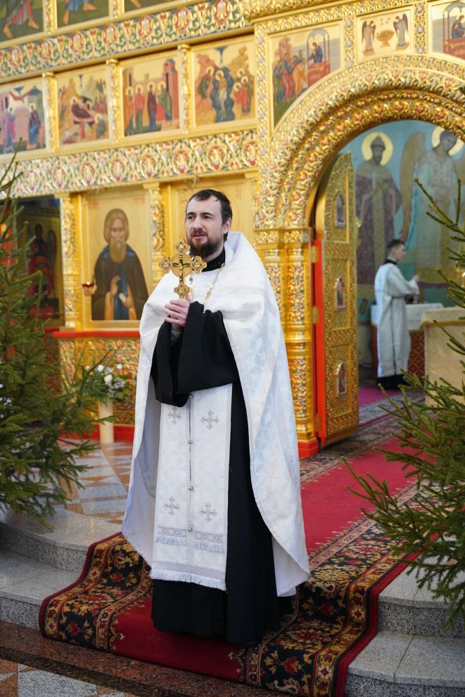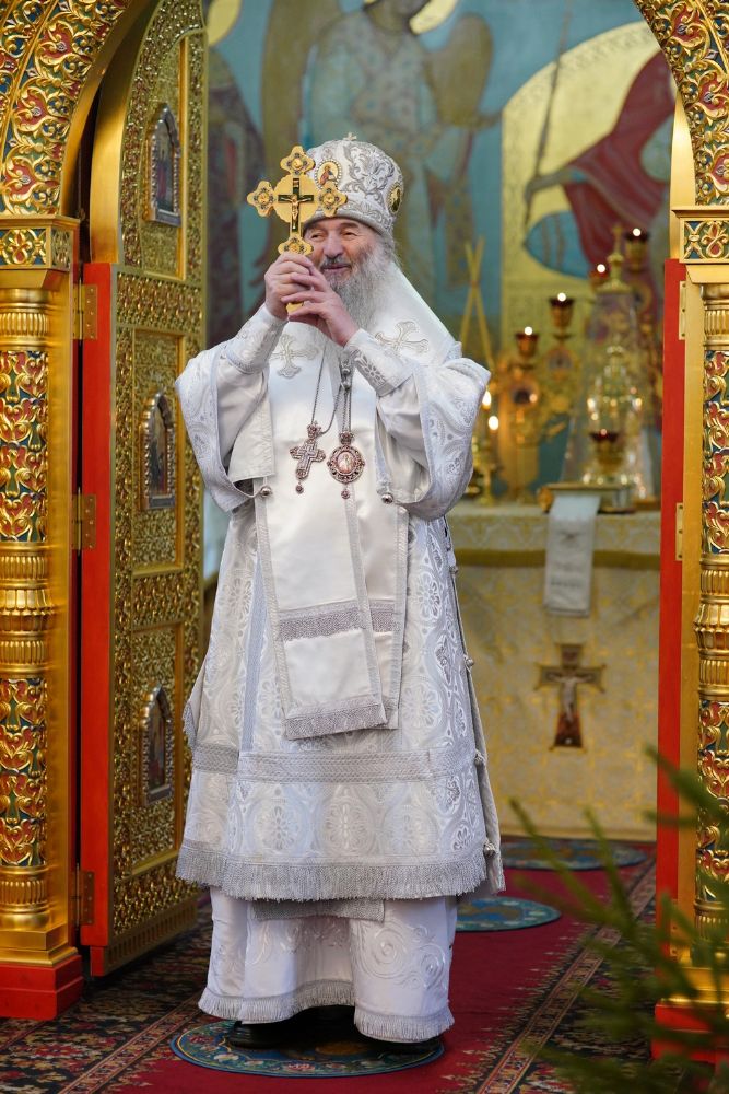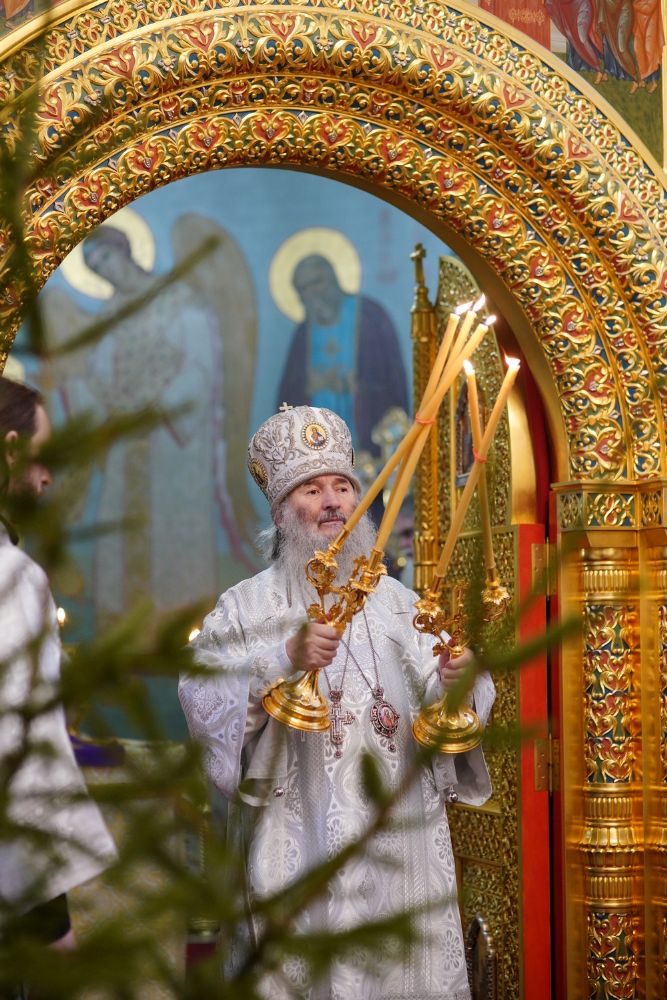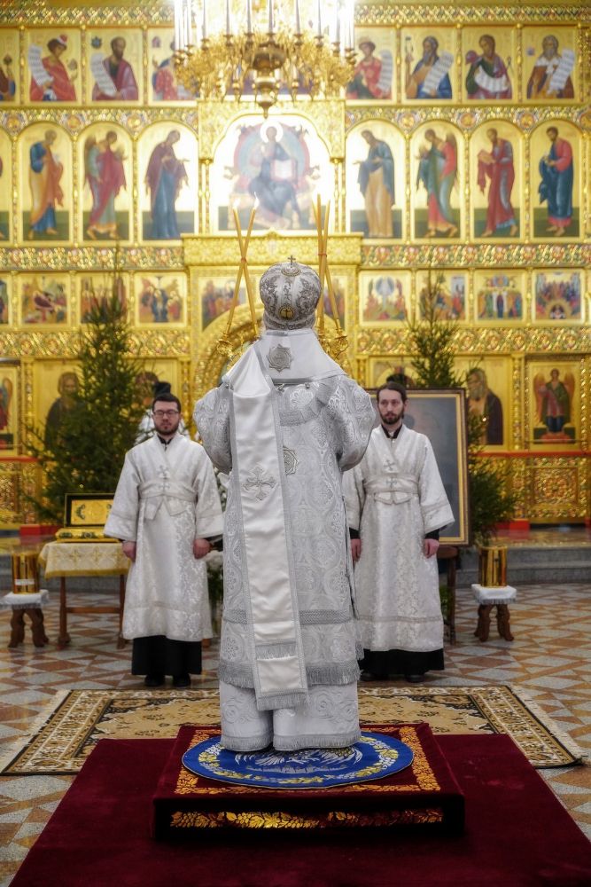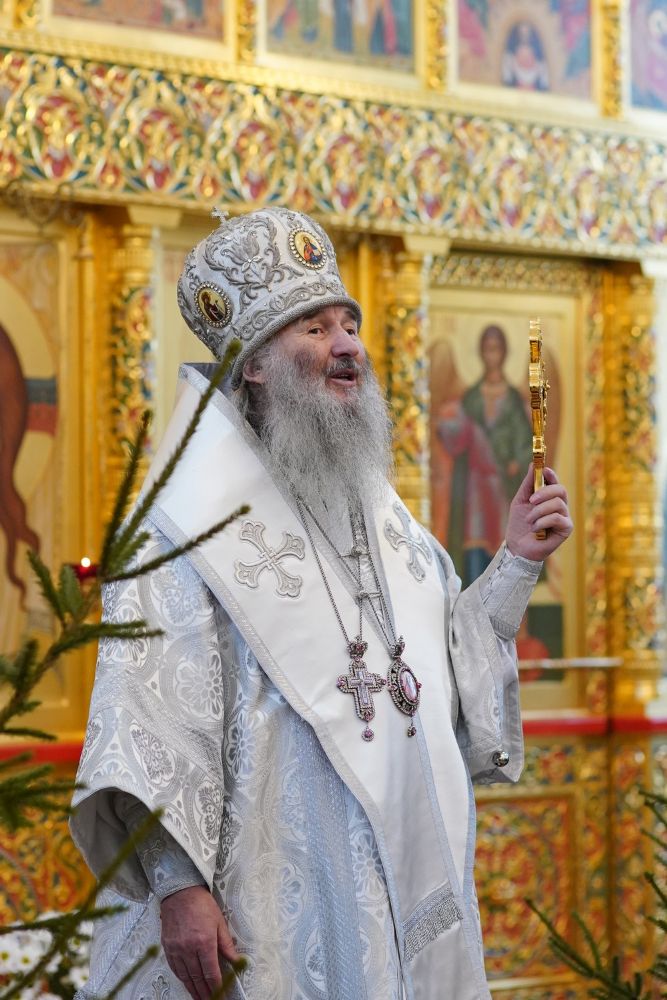 По завершении Литургии священнослужители в центре храма совершили славление Рождеству Христову и священномученику Михаилу, пресвитеру марийскому, затем митрополит Иоанн обратился к верующим с архипастырским словом.