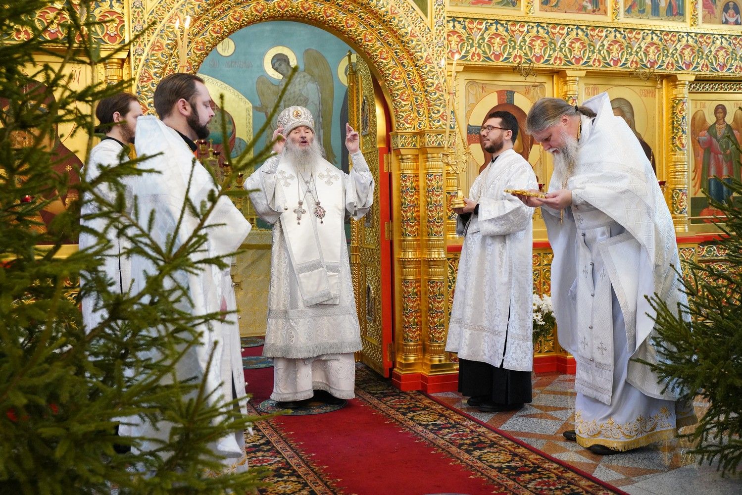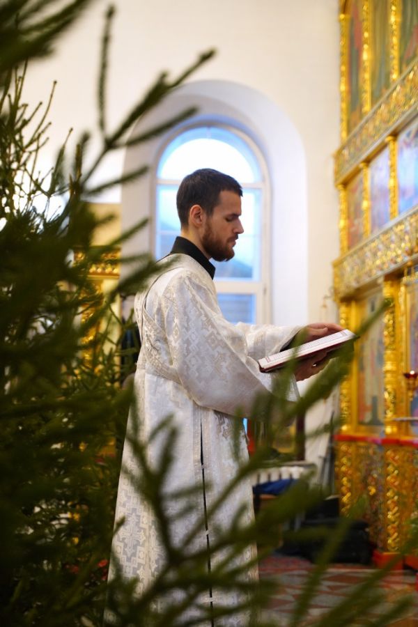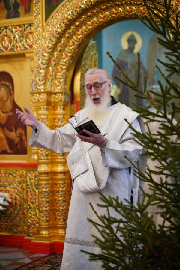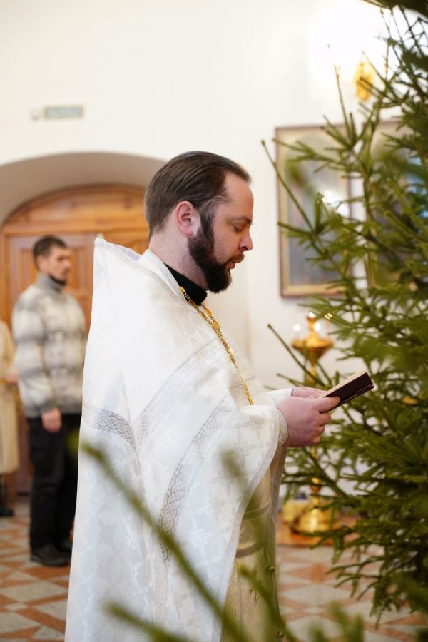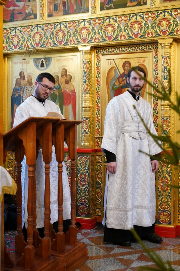 По завершении Литургии священнослужители в центре храма совершили славление Рождеству Христову и священномученику Михаилу, пресвитеру марийскому, затем митрополит Иоанн обратился к верующим с архипастырским словом.