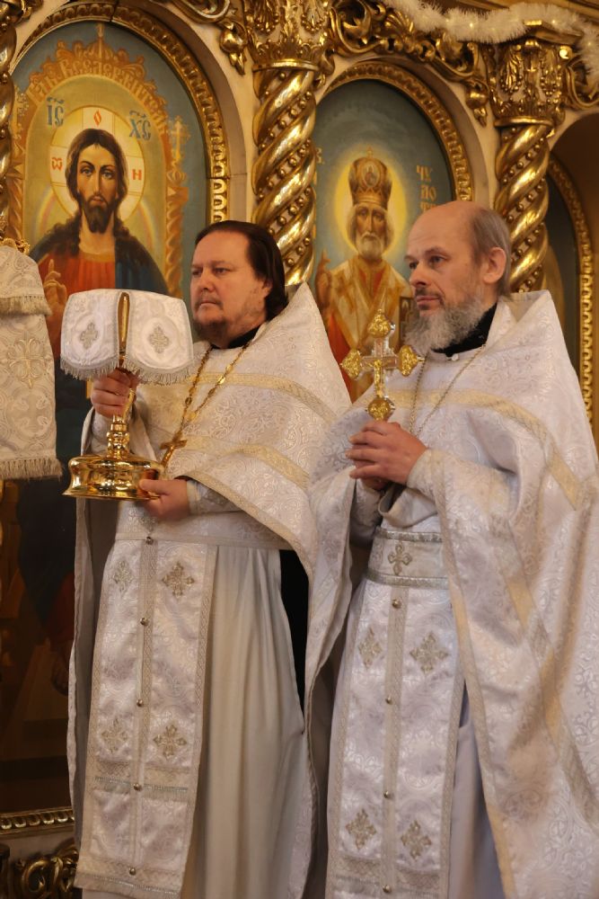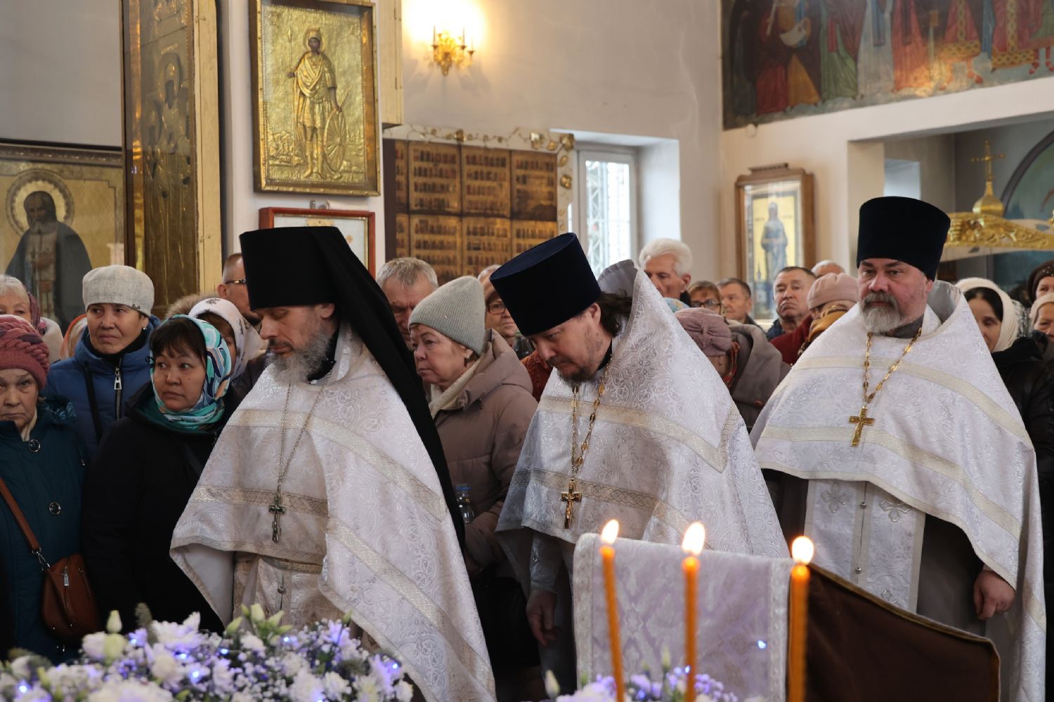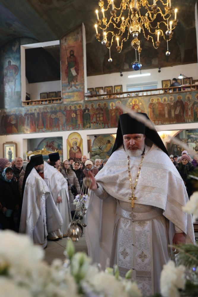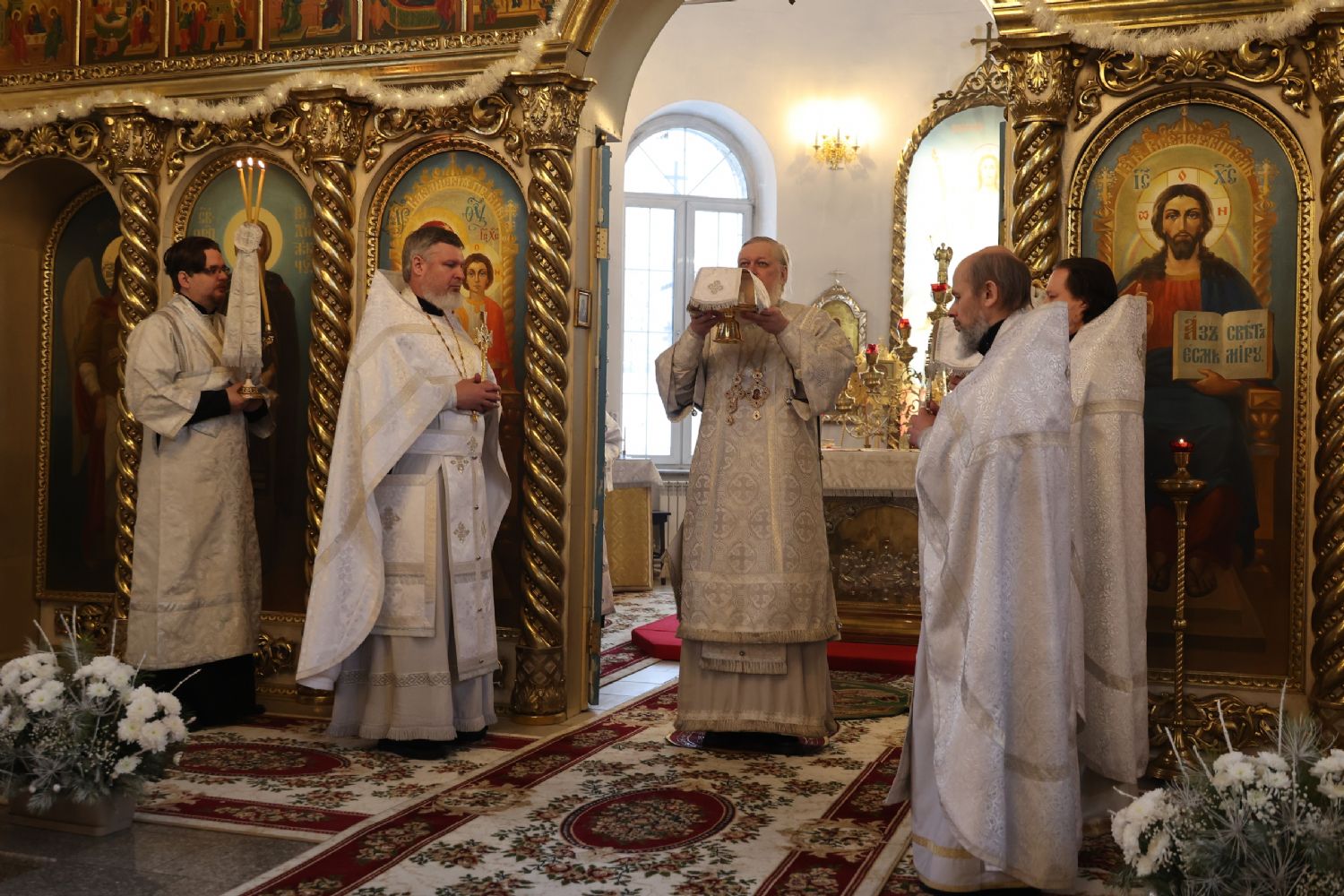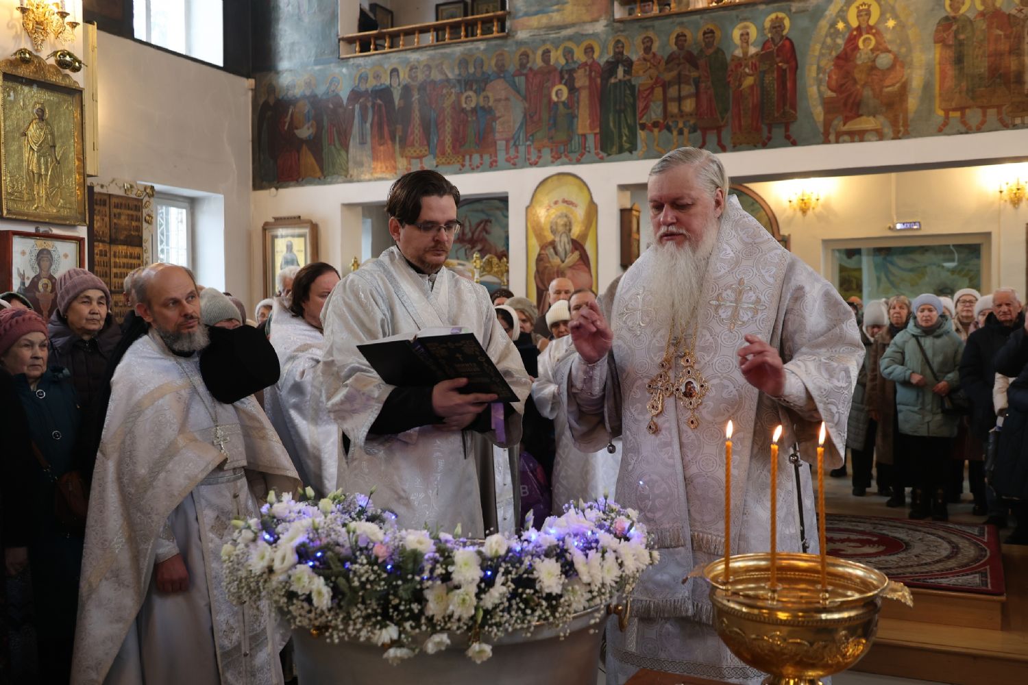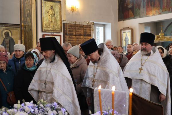 Его Преосвященству сослужили клирики собора иерей Николай Аникин, иеромонах Александр (Чеборов), иеромонах Питирим (Мосякин), диакон Иоанн Захаров и диакон Александр Викторов. Песнопения исполнял народный хор под управлением Евгения Чигарова.