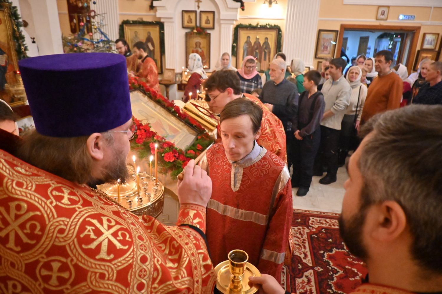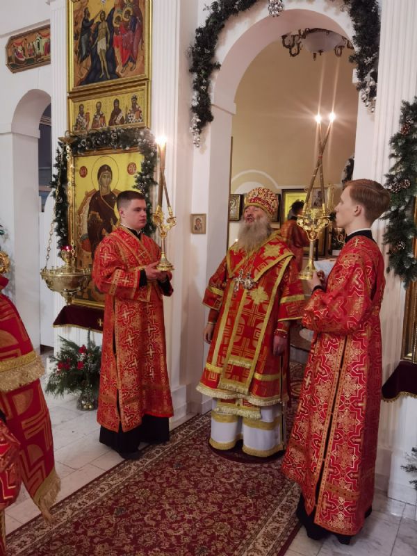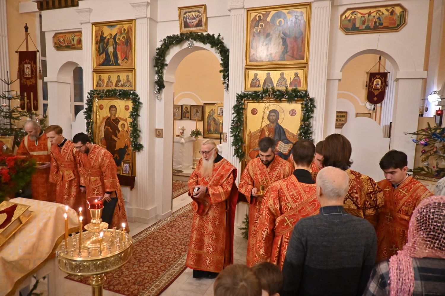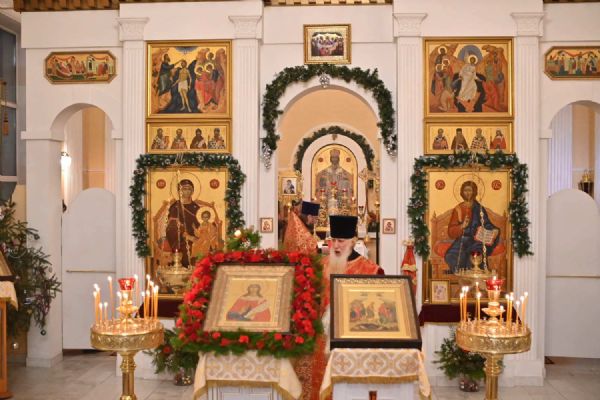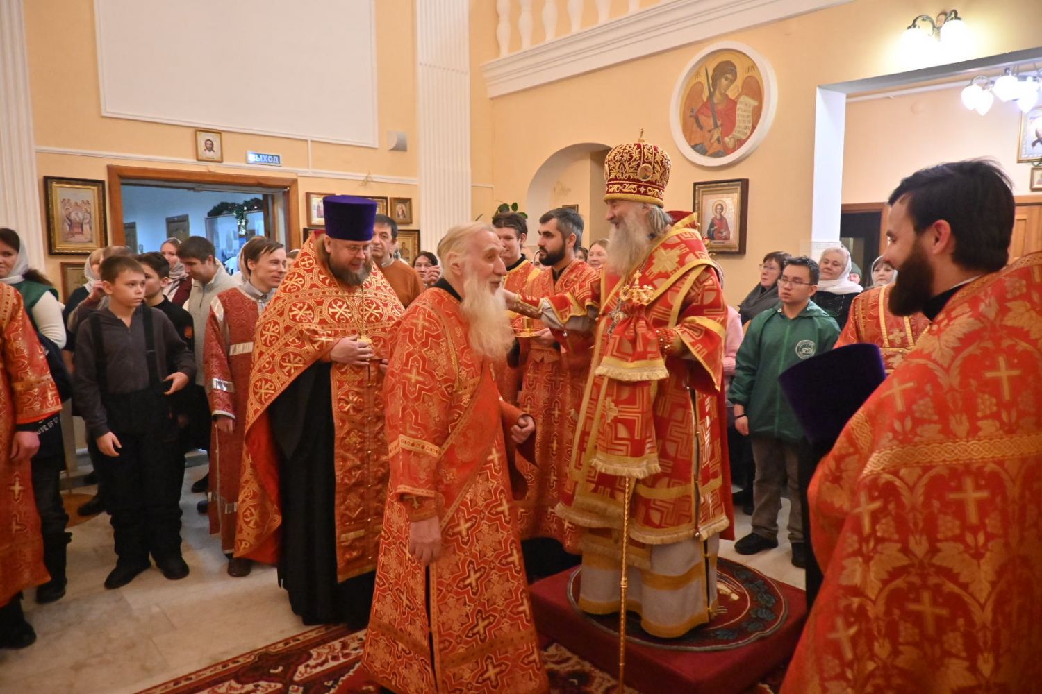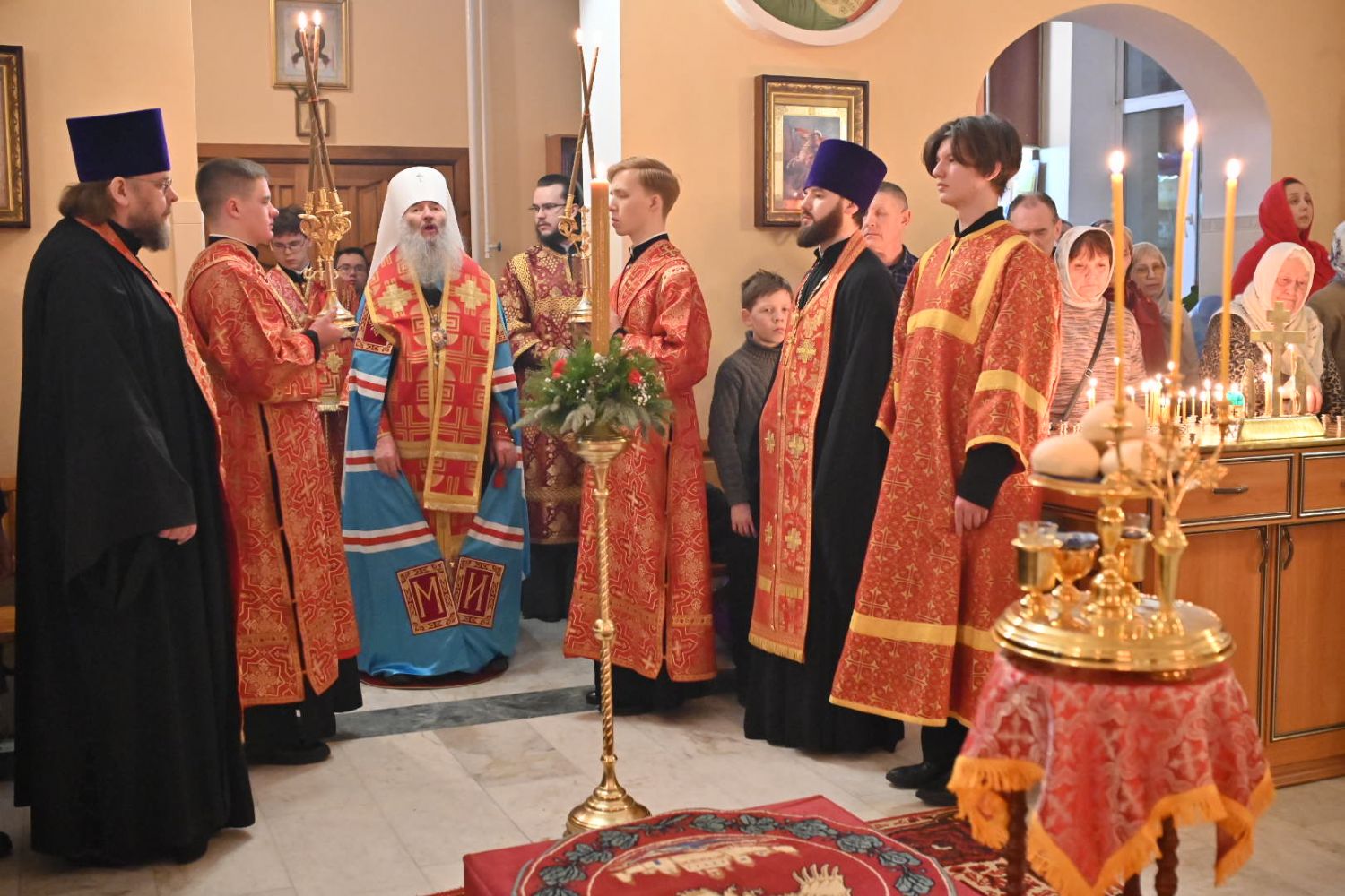 Архипастырю сослужили настоятель храма протоиерей Евгений Сурков, клирики храма иерей Андрей Иванов и диакон Никита Сурков, а также протодиакон Михаил Козловский. Песнопения исполнял хор храма под управлением регента Аллы Симаковой.