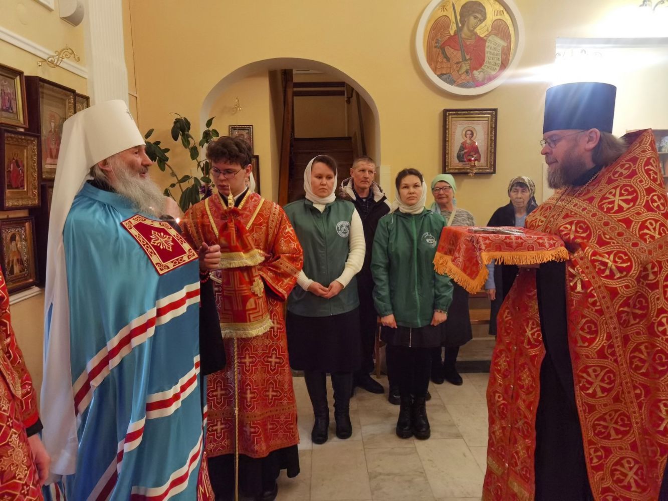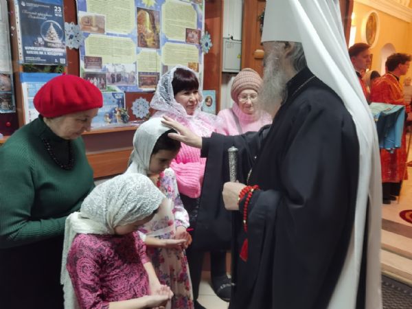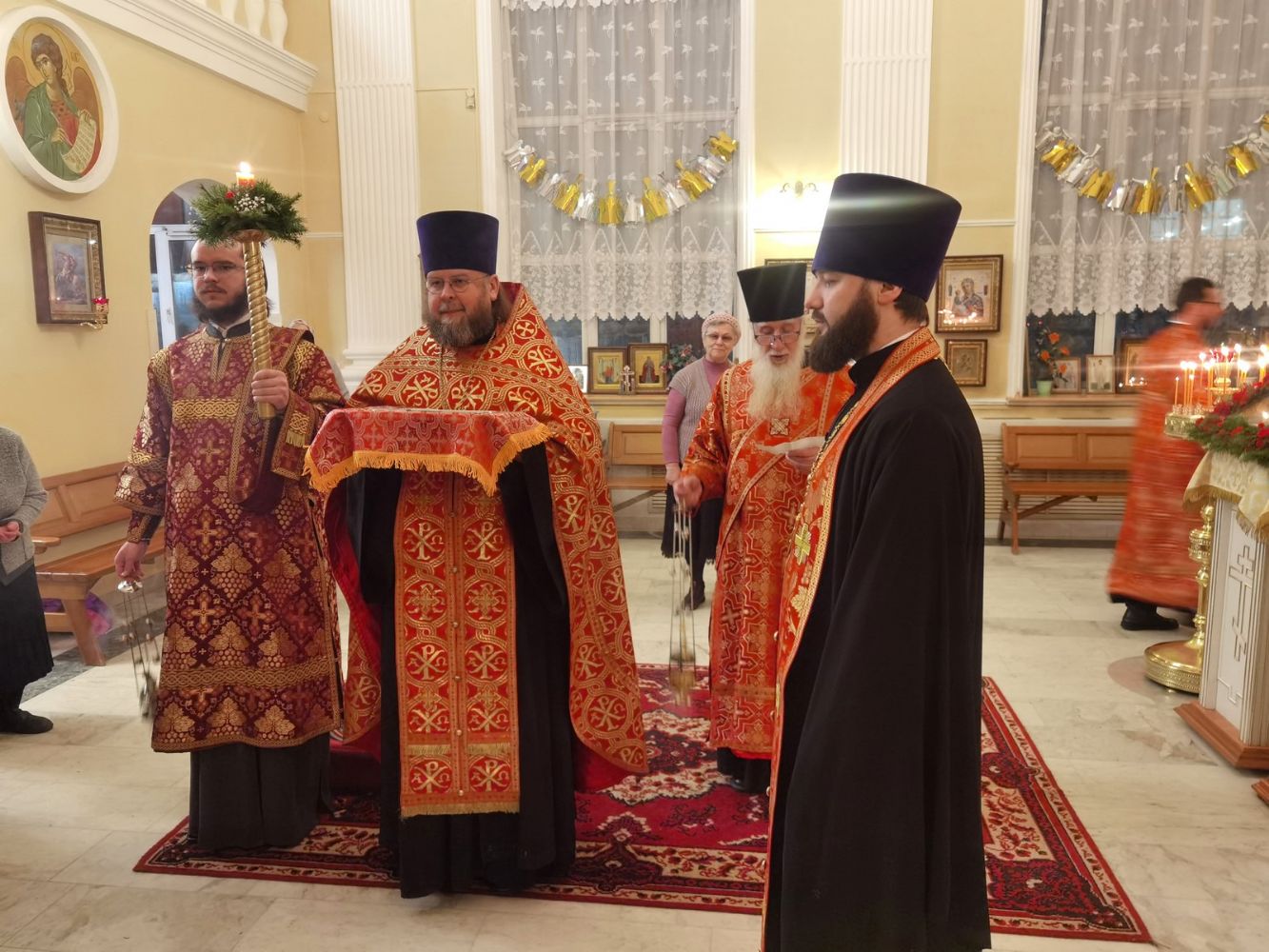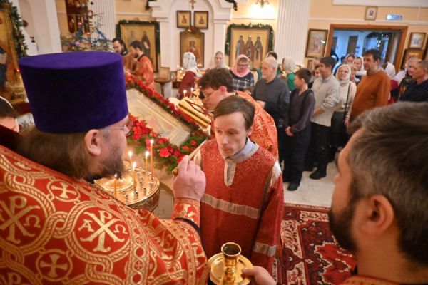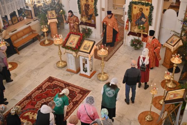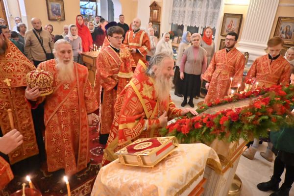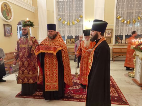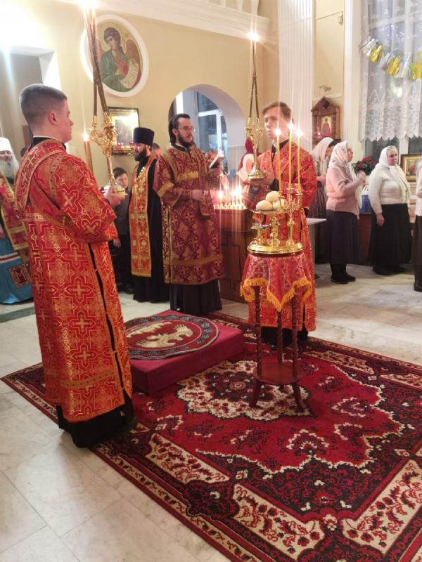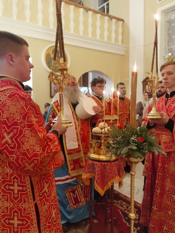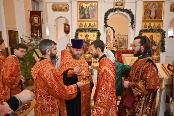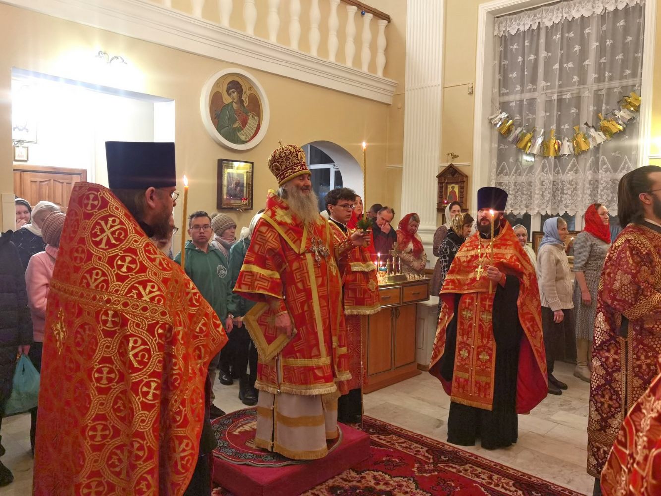 Архипастырю сослужили настоятель храма протоиерей Евгений Сурков, клирики храма иерей Андрей Иванов и диакон Никита Сурков, а также протодиакон Михаил Козловский. Песнопения исполнял хор храма под управлением регента Аллы Симаковой.