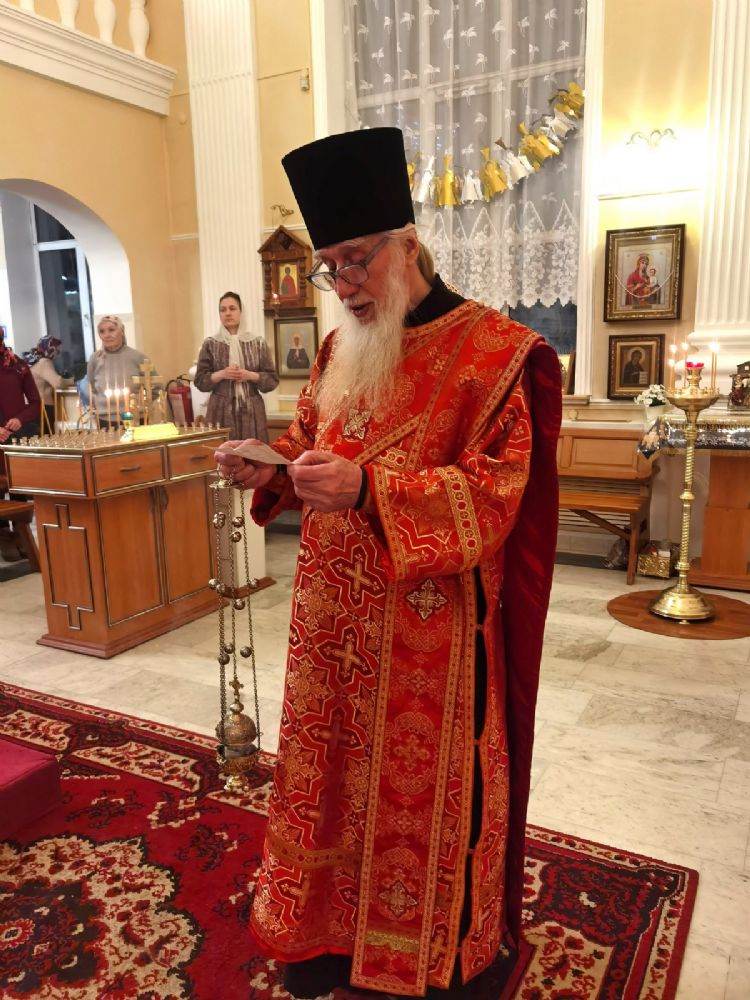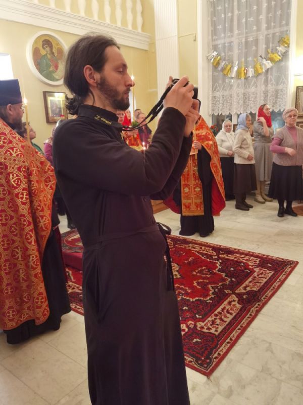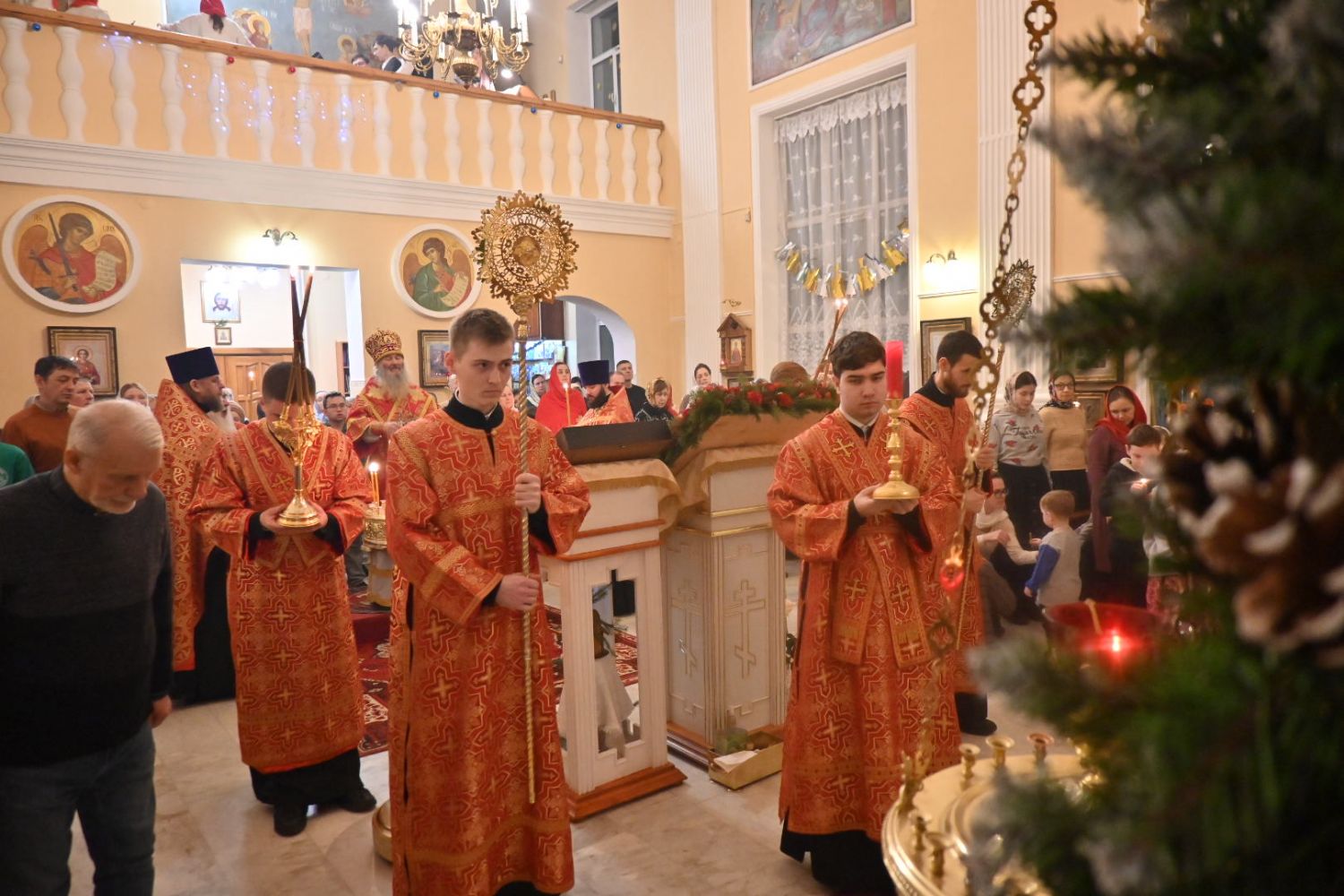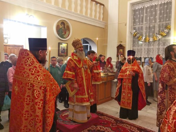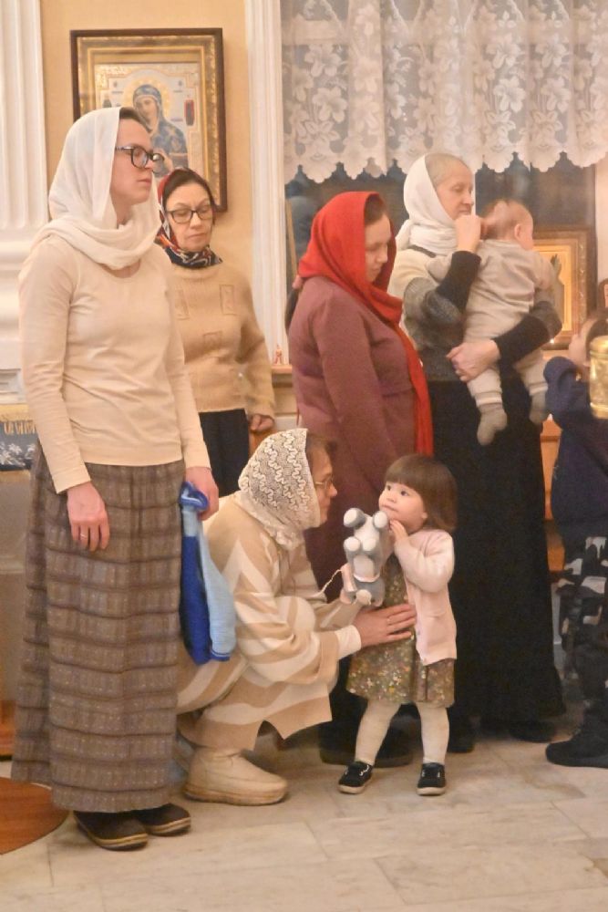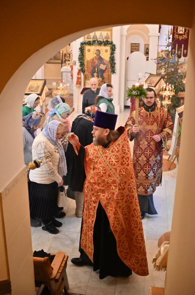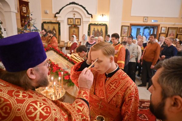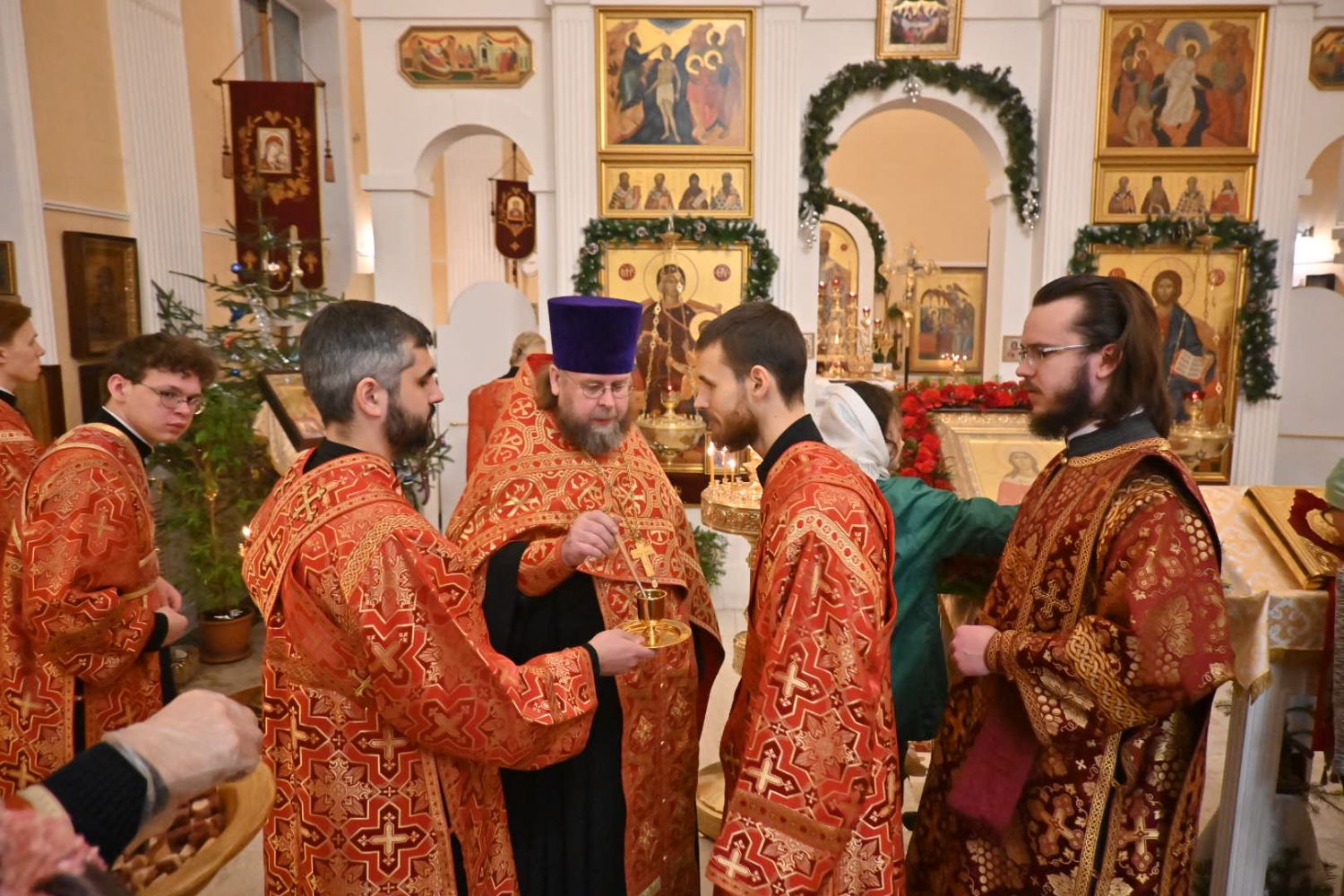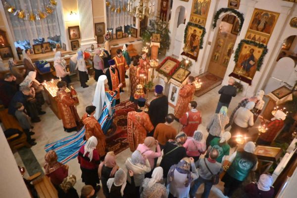 Архипастырю сослужили настоятель храма протоиерей Евгений Сурков, клирики храма иерей Андрей Иванов и диакон Никита Сурков, а также протодиакон Михаил Козловский. Песнопения исполнял хор храма под управлением регента Аллы Симаковой.