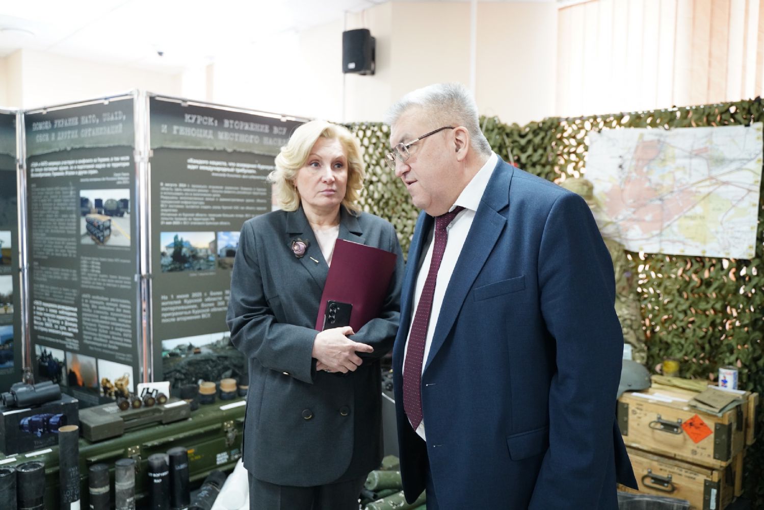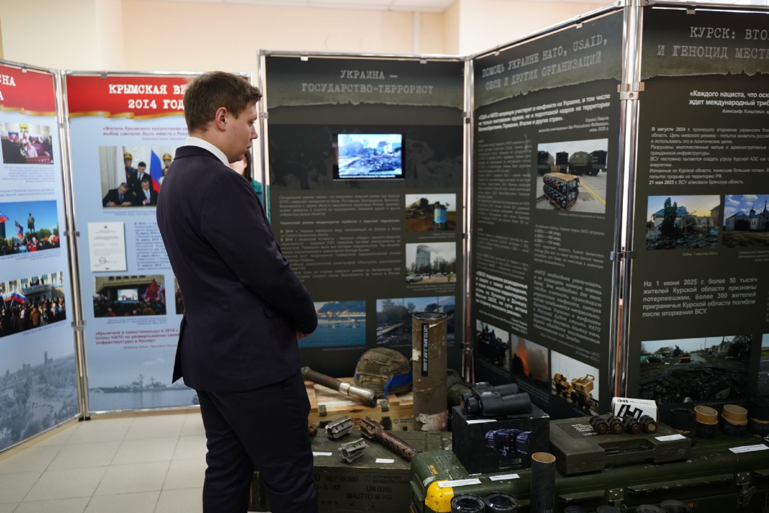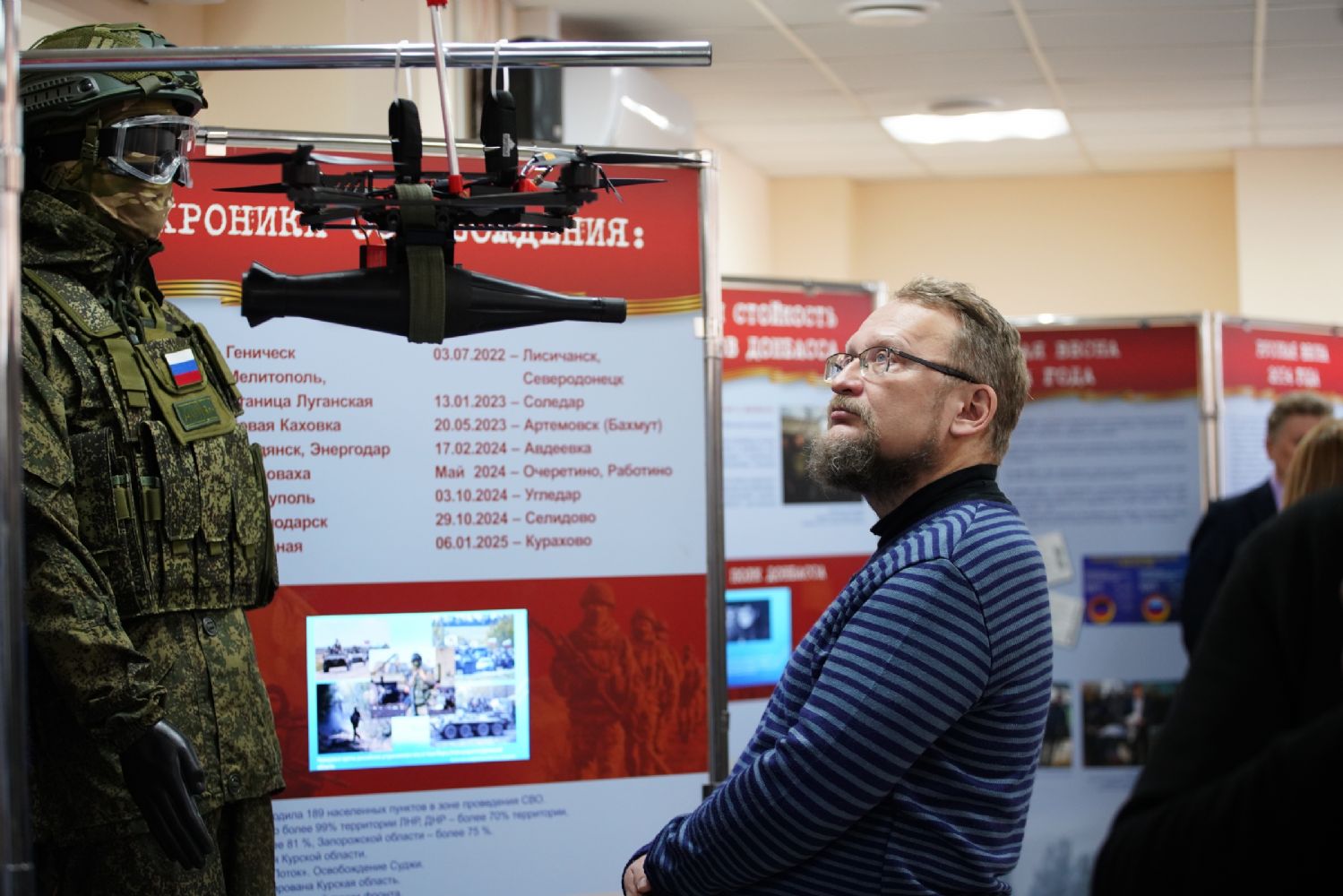 В числе наиболее примечательных экспонатов – образцы найденных на освобождённых территориях Курской области украинских FPV-дронов и БПЛА, фрагменты вооружения и боеприпасов, макеты использующихся в зоне СВО российских изобретений.