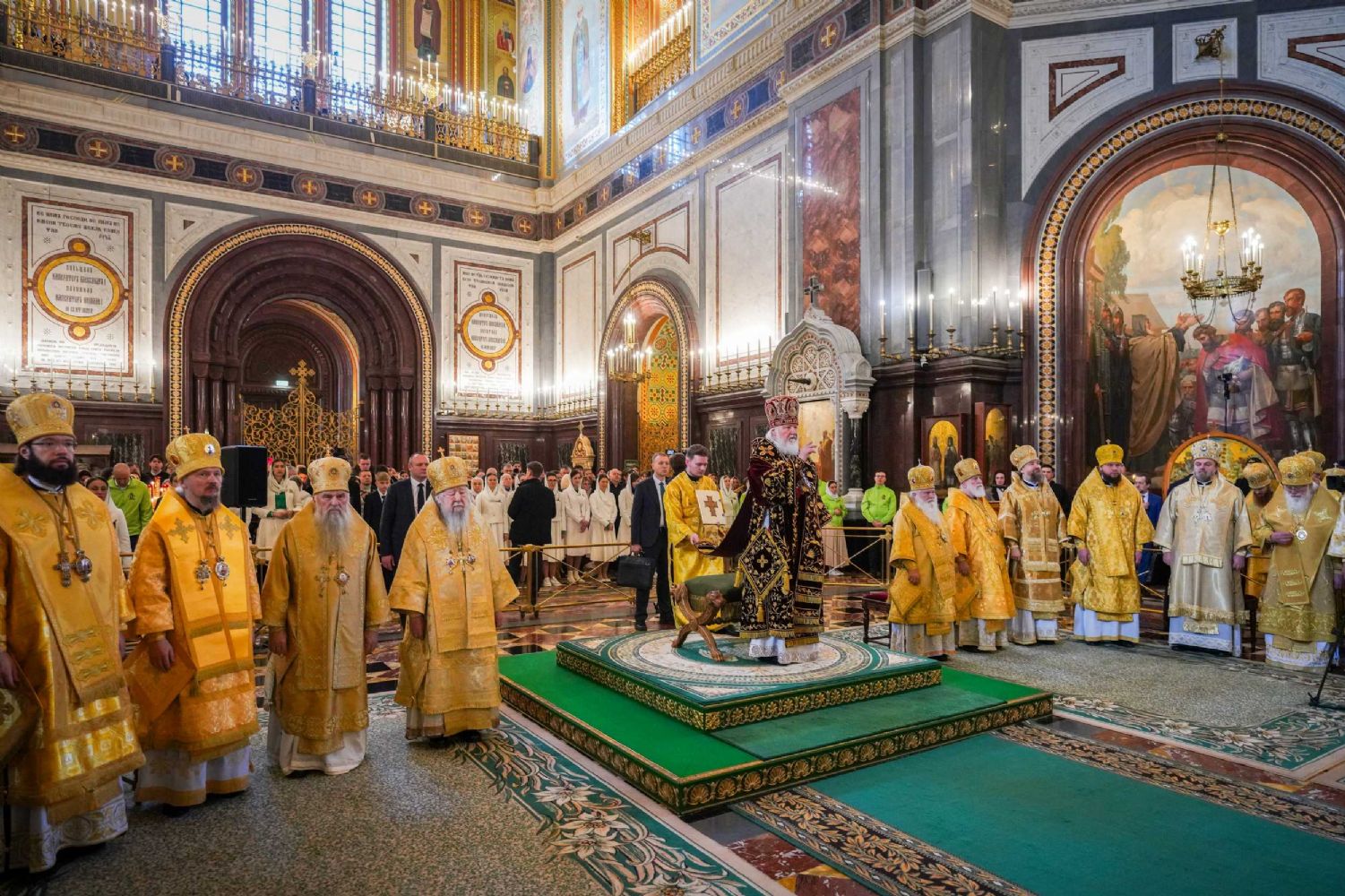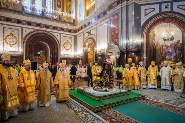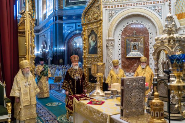 В этот знаменательный день Святейший Патриарх Кирилл совершил Божественную литургию в кафедральном соборном Храме Христа Спасителя в Москве в интронизационных облачениях и с копией жезла святителя Петра.