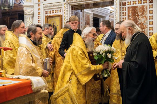 По окончании Литургии, после «Многолетия», управляющий делами Московской Патриархии, первый викарий Патриарха Московского и всея Руси по г. Москве митрополит Воскресенский Григорий огласил поздравительный адрес от членов Священного Синода Русской Православной Церкви Святейшему Патриарху Кириллу с 17-летием интронизации. В дар Его Святейшеству митрополит Григорий преподнес икону Божией Матери «Одигитрия» и букет белых роз.