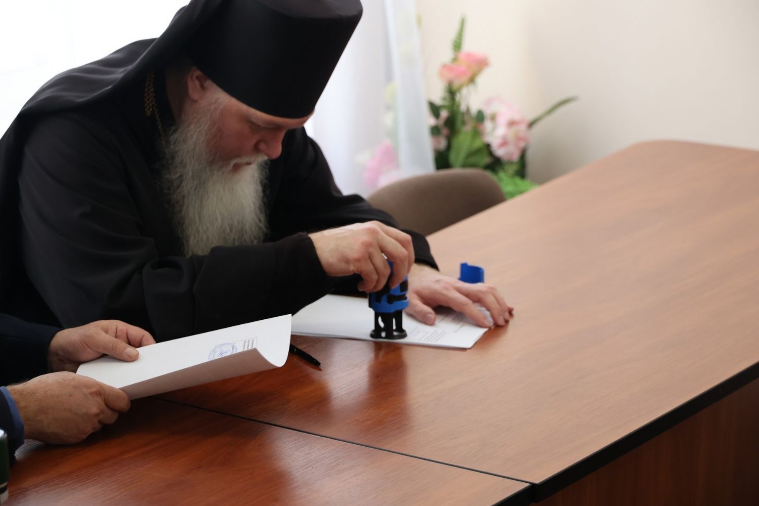 Перед подписанием документа о сотрудничестве епископ Феофан обратился к собравшимся в зале с архипастырским словом. Архипастырь поздравил присутствующих с наступившим праздником Сретения Господня и поведал о значении и духовном смысле Великого поста и подготовке к нему. Владыка также обратил внимание слушателей на то, как нужно провести последнюю неделю перед Великим постом – Сырную (Масленичную) седмицу, которая заканчивается воспоминанием изгнания Адама из рая, Прощеным воскресением, что должно особенным образом располагать верующего человека к покаянию и воздержанию от всякого зла.