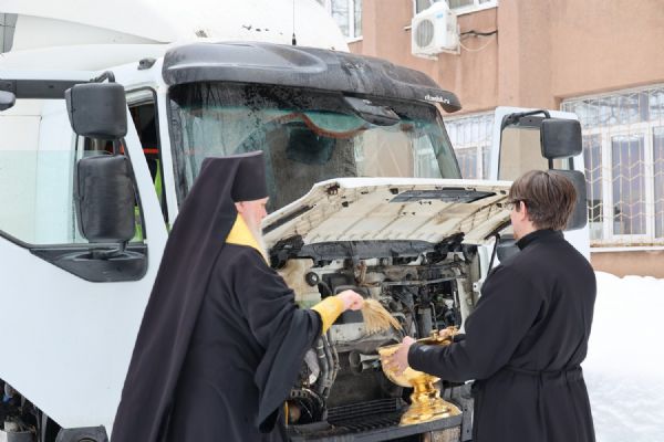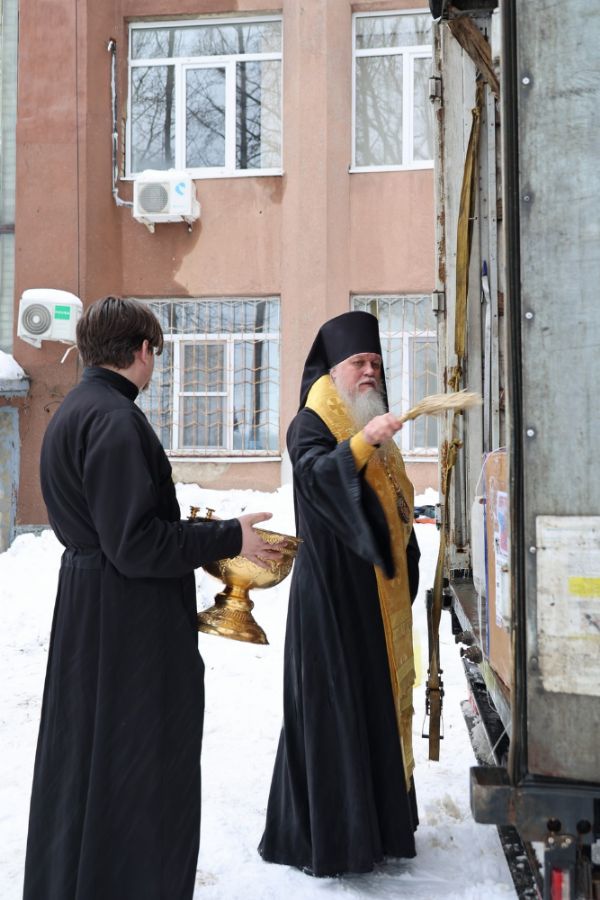 Перед отправкой груза, 1 марта, епископ Волжский и Сернурский Феофан в сослужении протоиерея Виталия Михеева совершил освящение гуманитарной помощи.