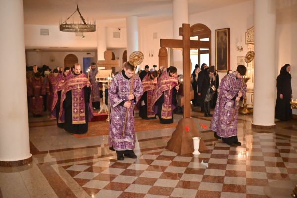 Его Высокопреосвященству сослужили клирики собора иереи Никифор Захаров, Евгений Самойлов, Александр Староверов, Иоанн Милютин и диакон Артемий Бобоч, а также протодиакон Михаил Козловский. Пел архиерейский хор «Благовест» под управлением регента Татьяны Черновой. Песнопение «Днесь висит на древе…» исполнил иерей Евгений Самойлов.