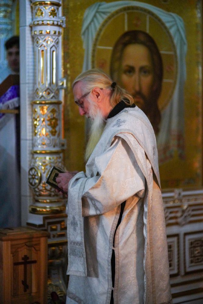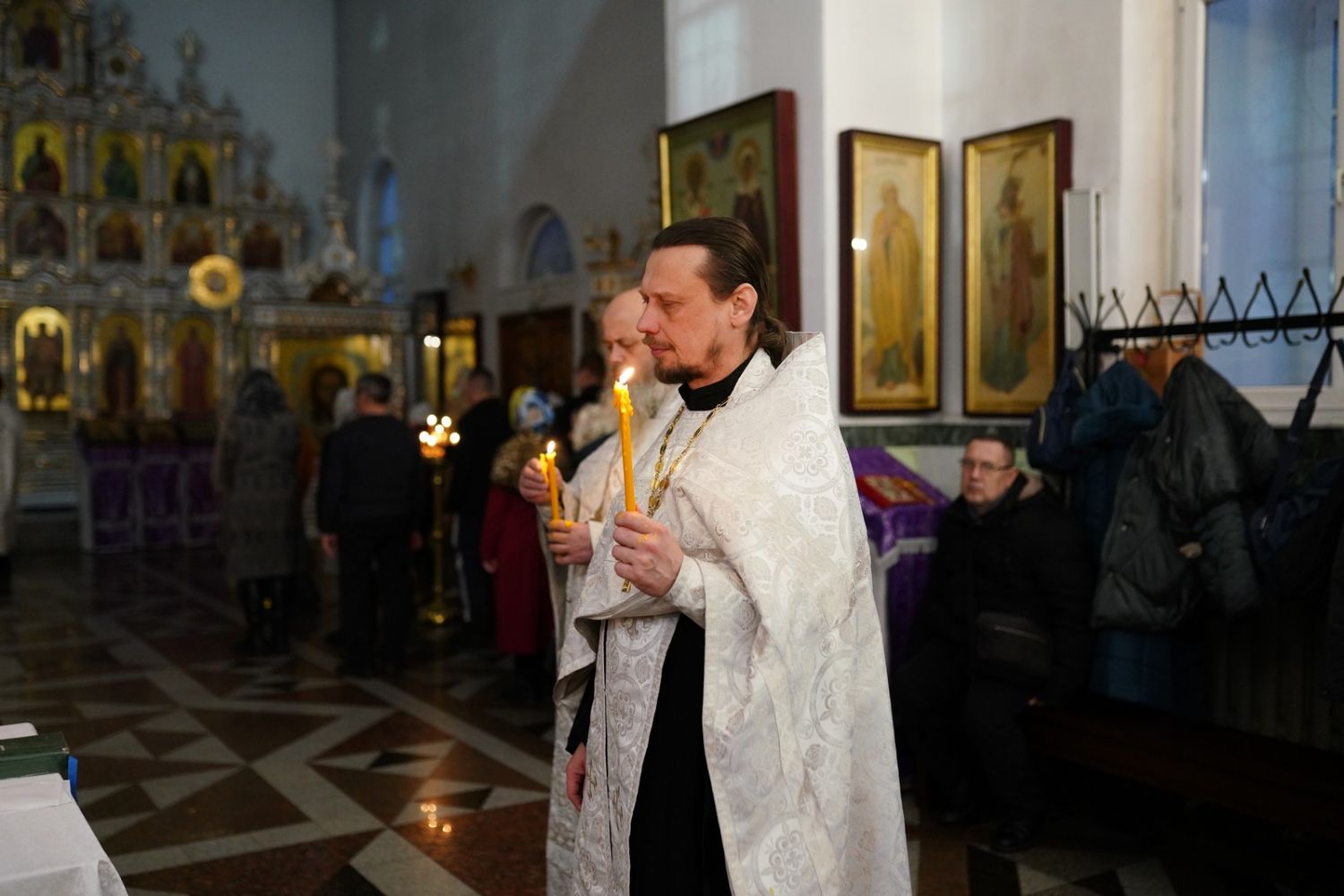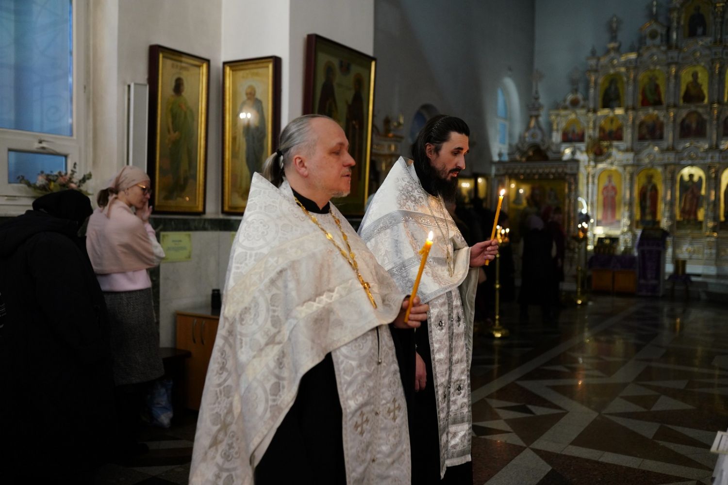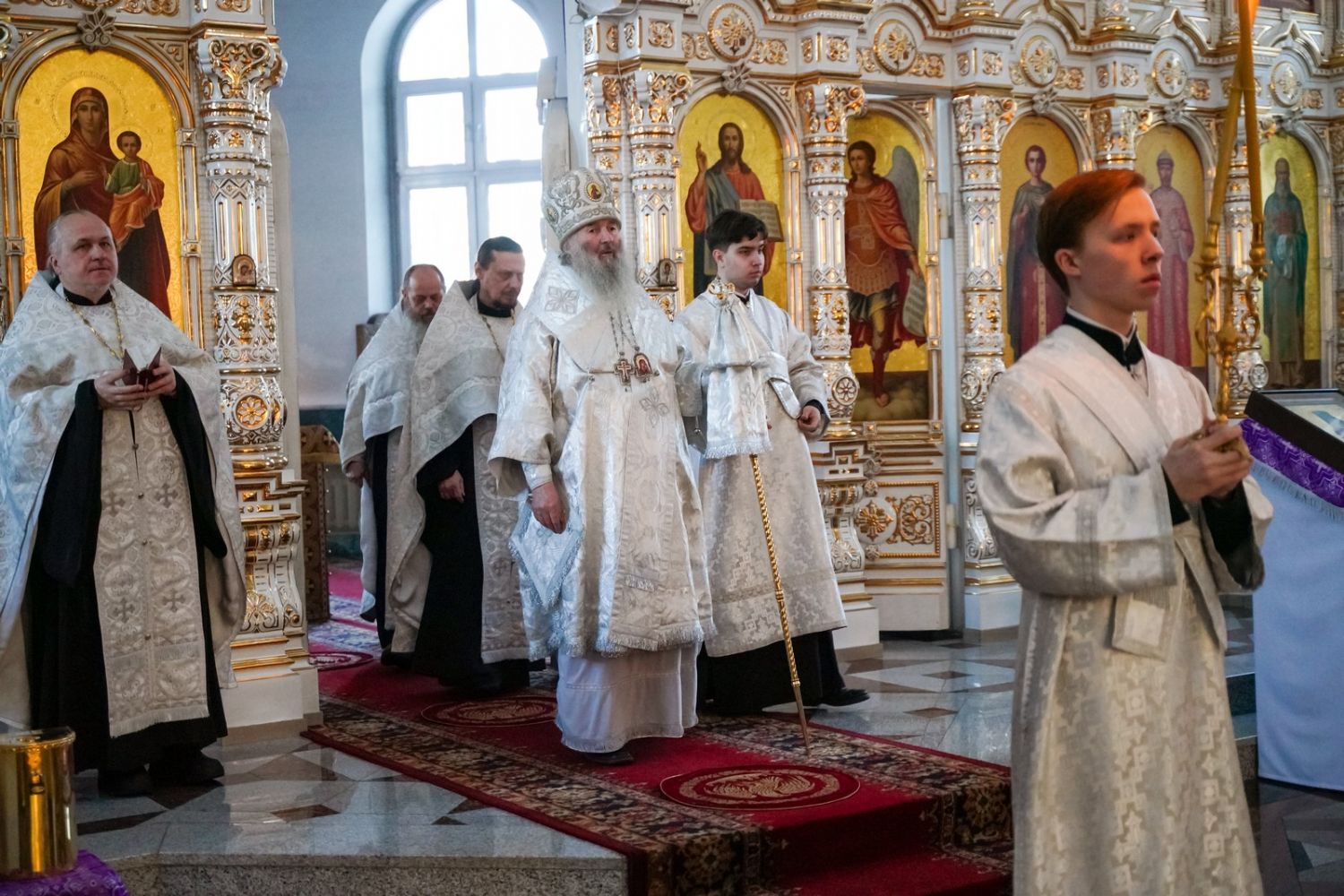 Владыке сослужили настоятель собора иерей Андрей Кочаков, клирики собора иерей Леонид Вылекжанин и диакон Алексий Кузнецов, а также настоятель Сретенского храма с. Русский Кадам иерей Владимир Каплунов, клирик храма иконы "Всех скорбящих Радость" г. Йошкар-Олы иерей Василий Пряморуков и протодиакон Михаил Козловский. Песнопения исполнял хор собора под управлением Елены Поглазовой.