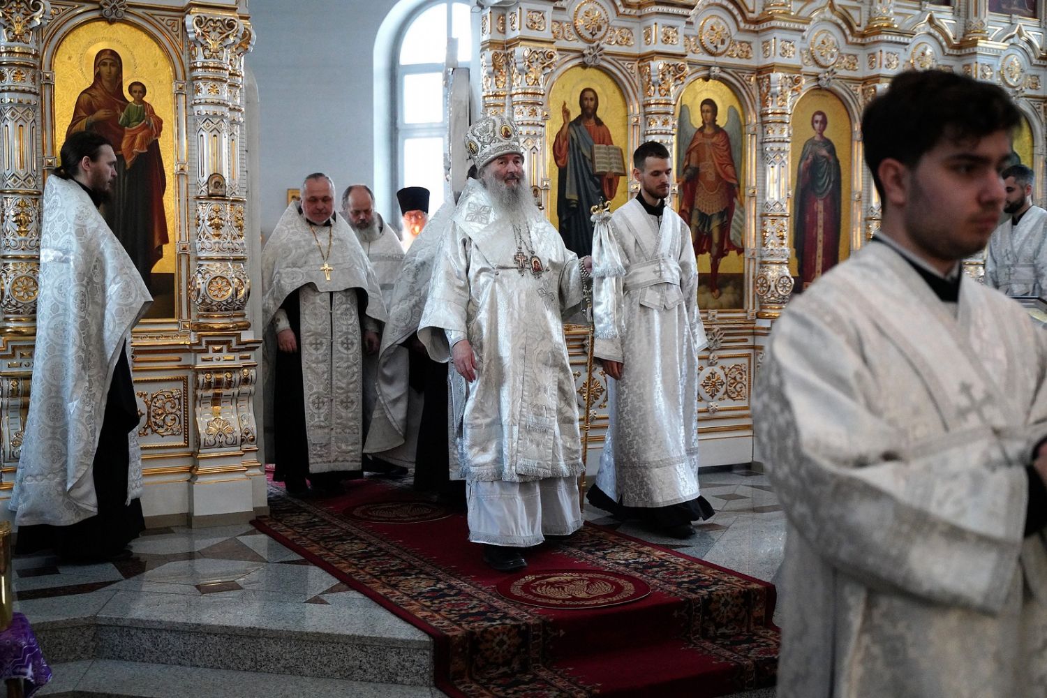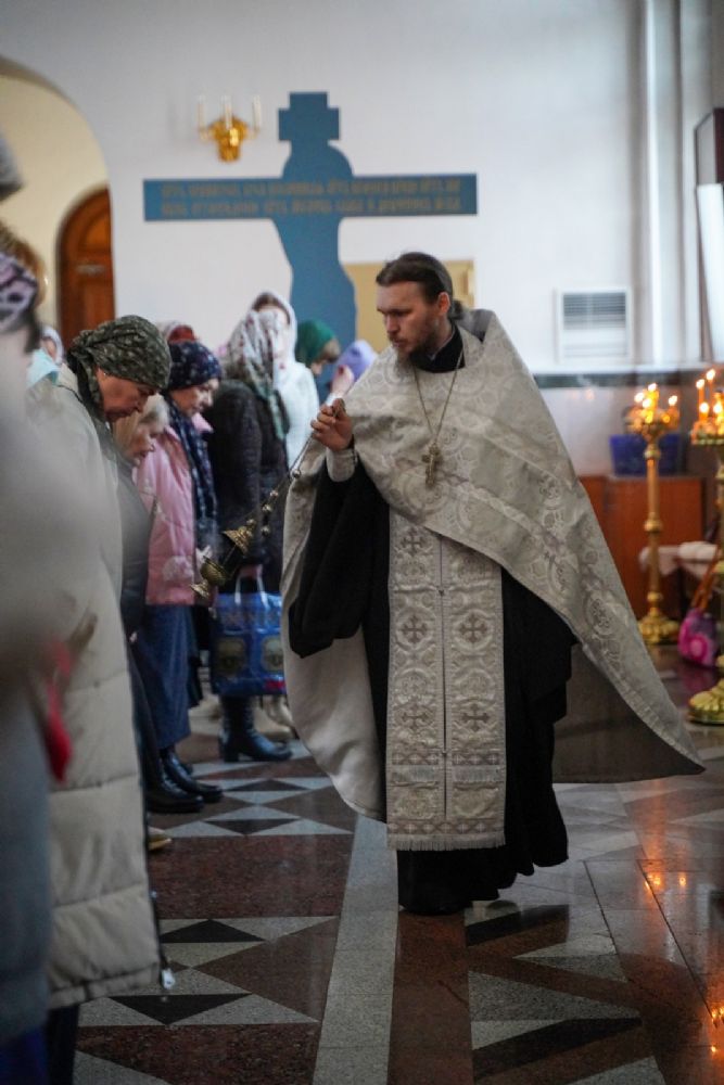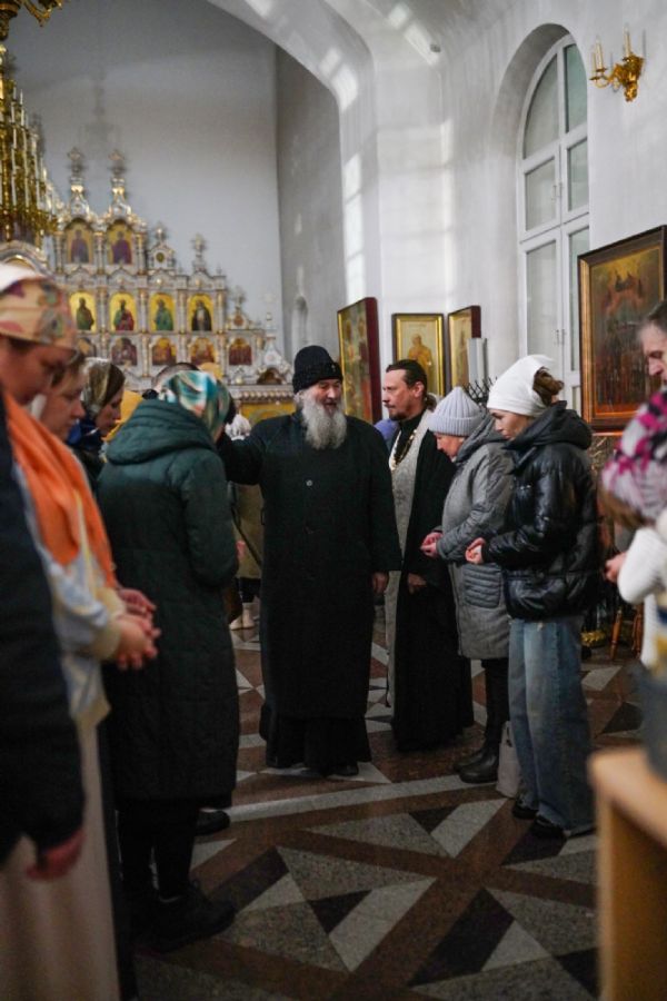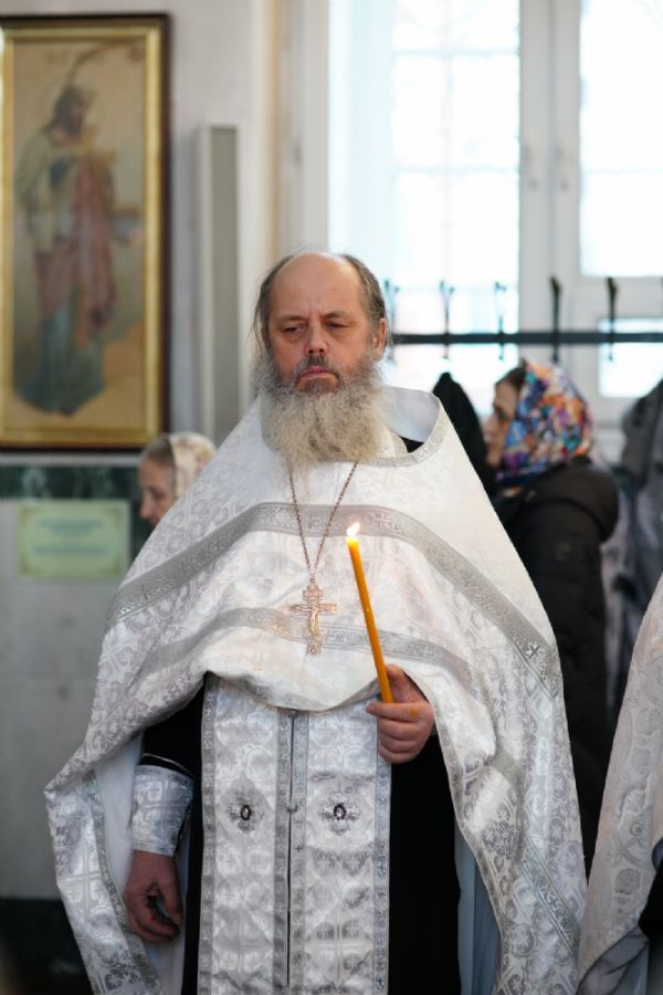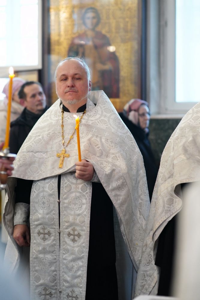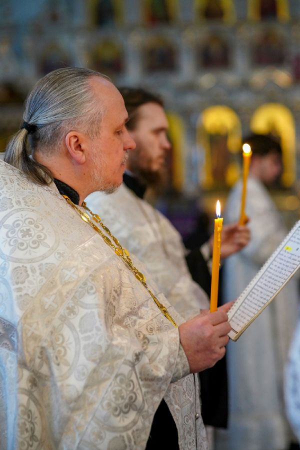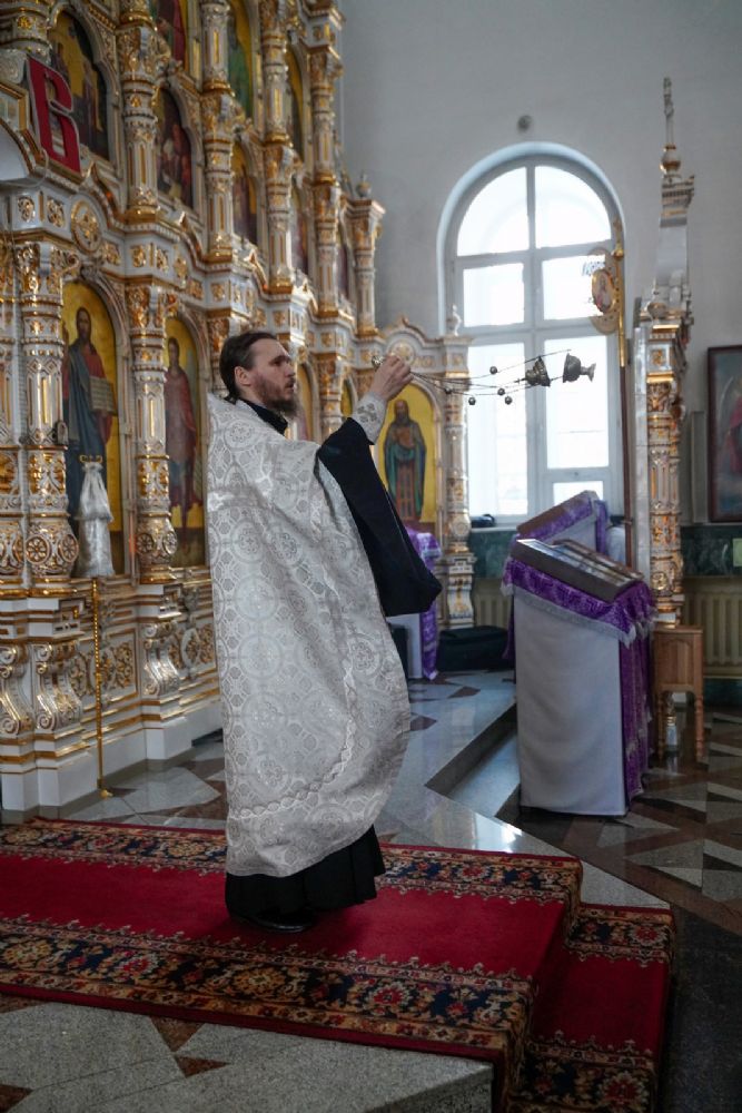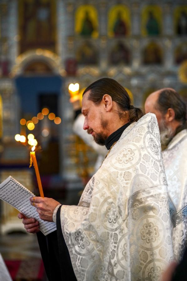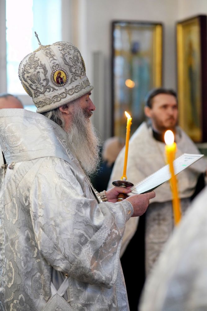 Владыке сослужили настоятель собора иерей Андрей Кочаков, клирики собора иерей Леонид Вылекжанин и иерей Димитрий Лукьянов, а также настоятель Сретенского храма с. Русский Кадам иерей Владимир Каплунов и протодиакон Михаил Козловский. Песнопения исполнял хор собора под управлением Елены Поглазовой.