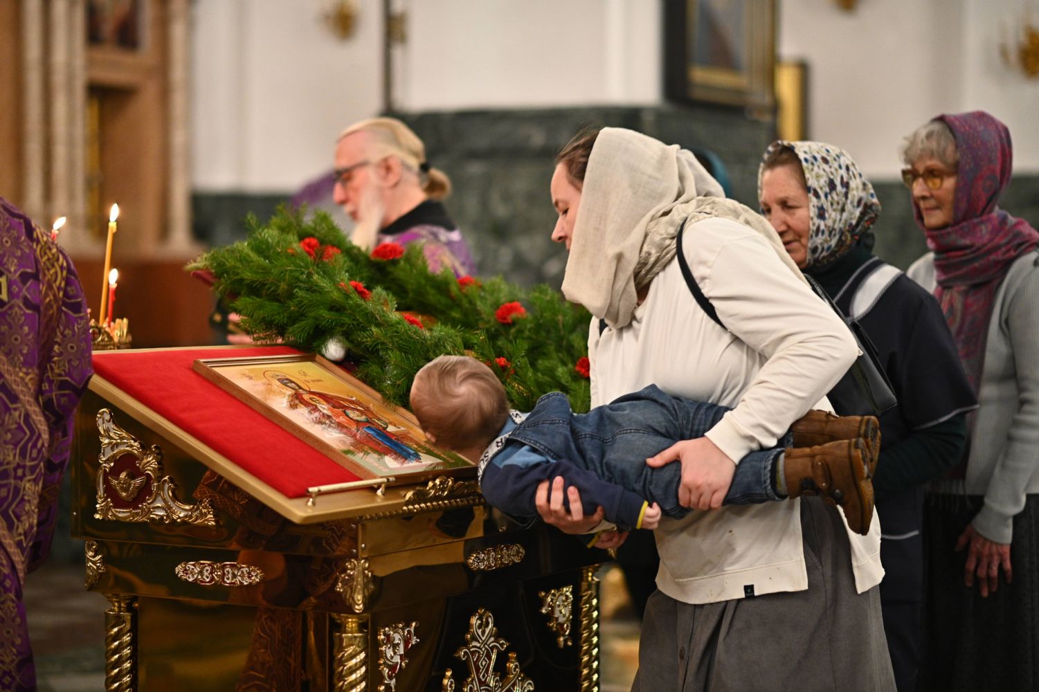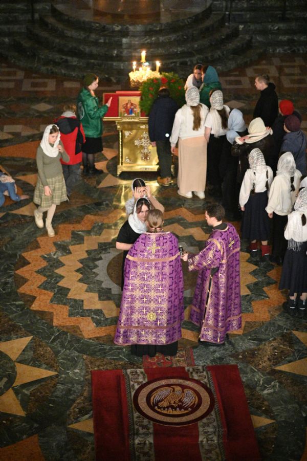 После великого славословия в конце службы в центр храма был торжественно вынесен украшенный Крест Господень. После поклонения Кресту верующие помазывались освященным елеем.