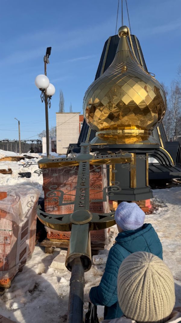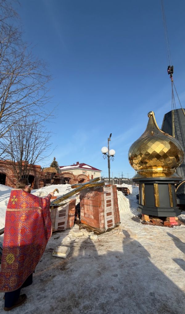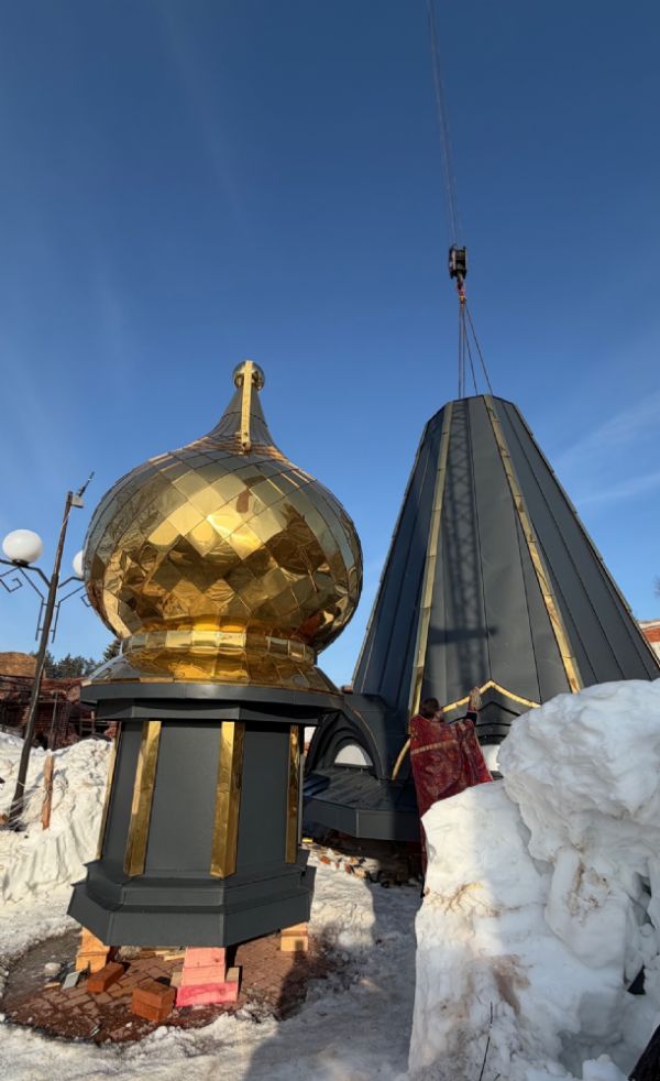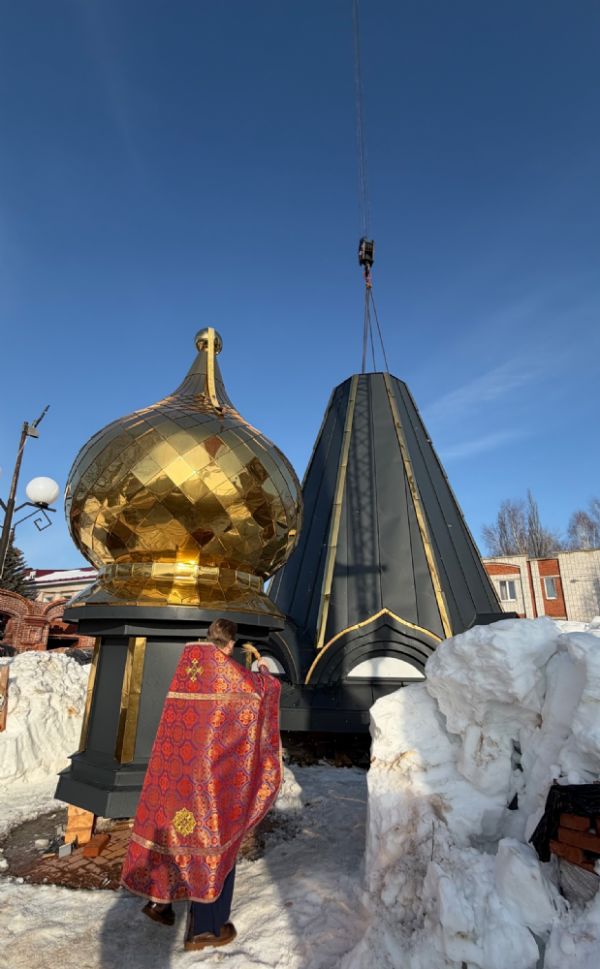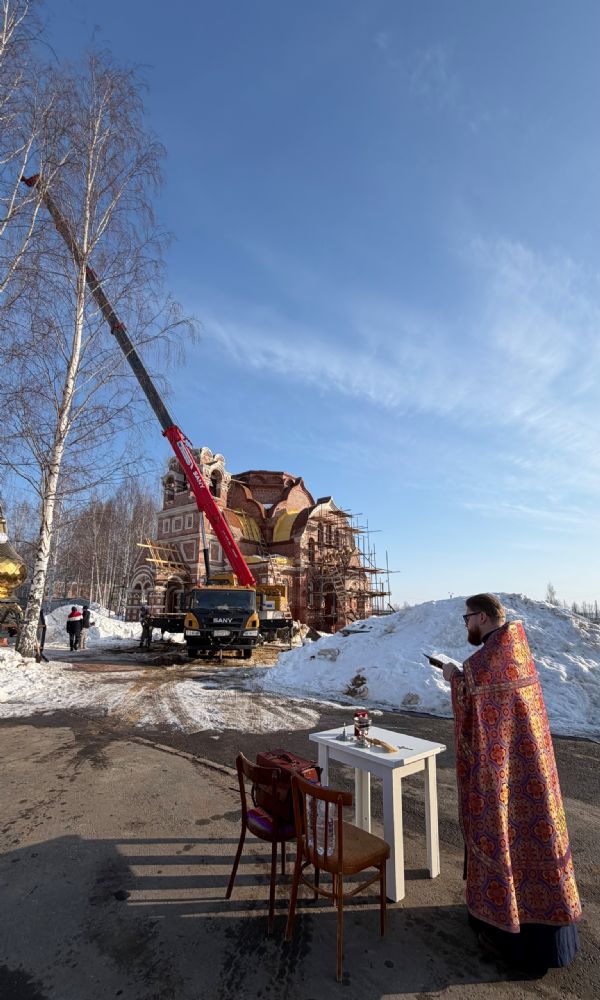 После совершения чина все собравшиеся приложились ко кресту, который будет установлен на главном куполе храма Божьего. И начались работы по установке кровли с куполом.