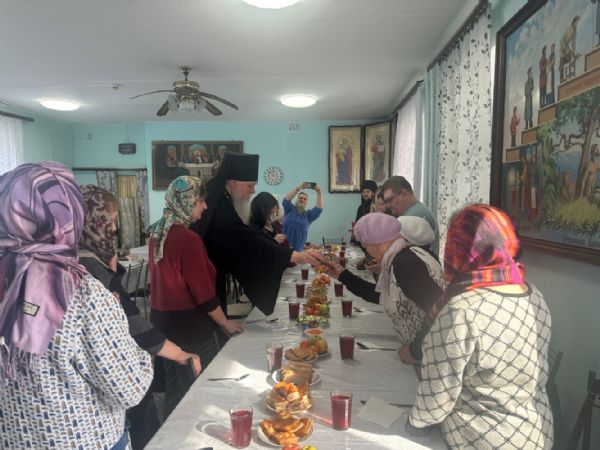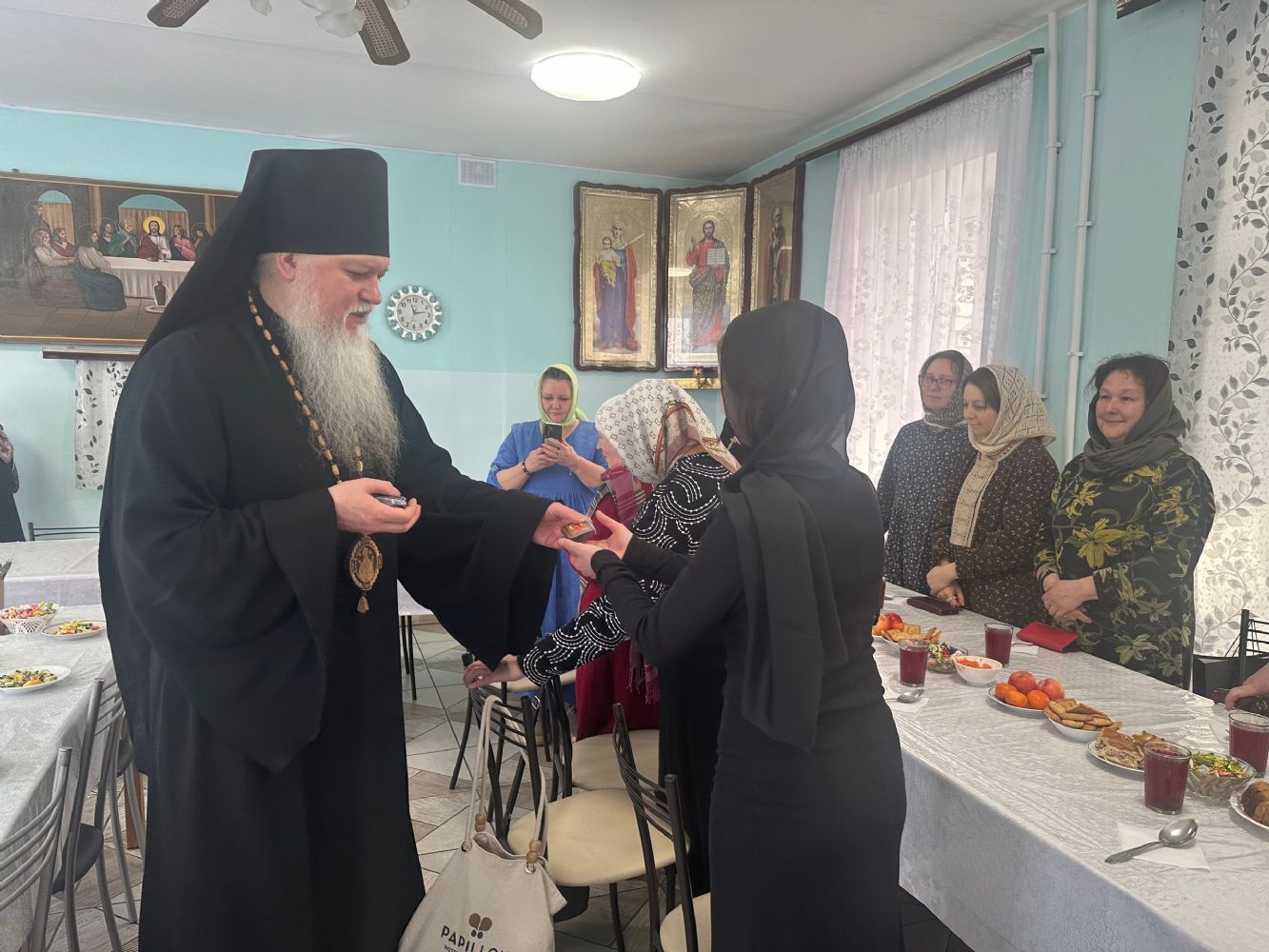 После молебна в трапезной собора состоялась встреча с владыкой Феофаном, в которой приняли участие представители социального отдела епархии, слушатели Школы сестёр милосердия, председатели местных отделений Всероссийских обществ слепых, глухих и инвалидов. Архипастырь поздравил присутствующих с днём памяти обретения мощей святителя Луки, пожелал Божией помощи в несении труда во благо ближних, подарил каждому иконки Божией Матери «Семистрельная» с благословением на дальнейшие труды.