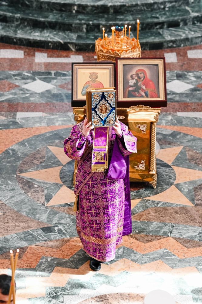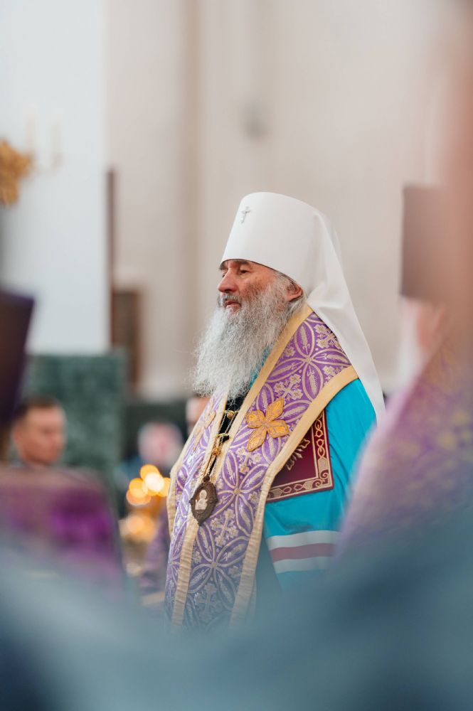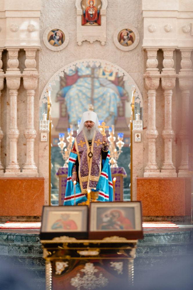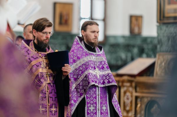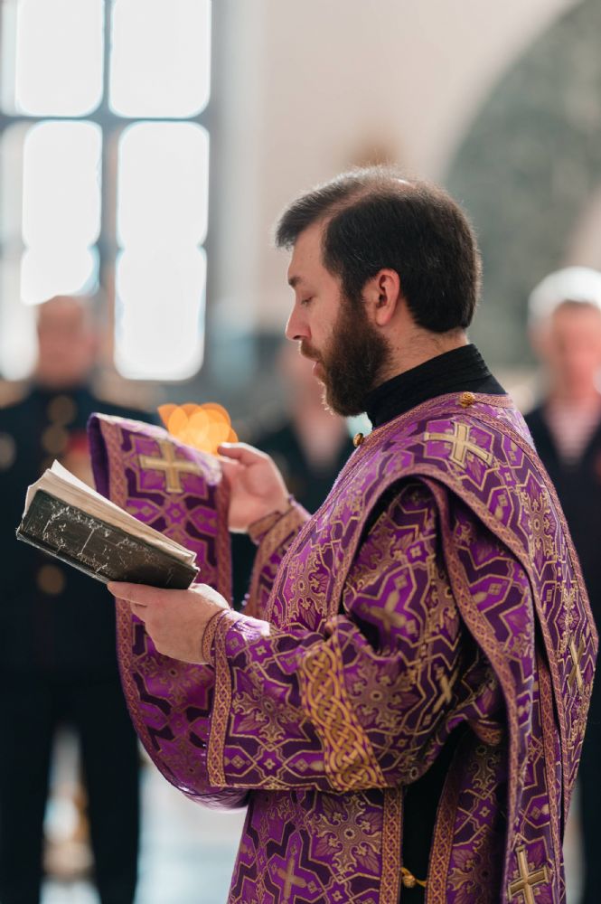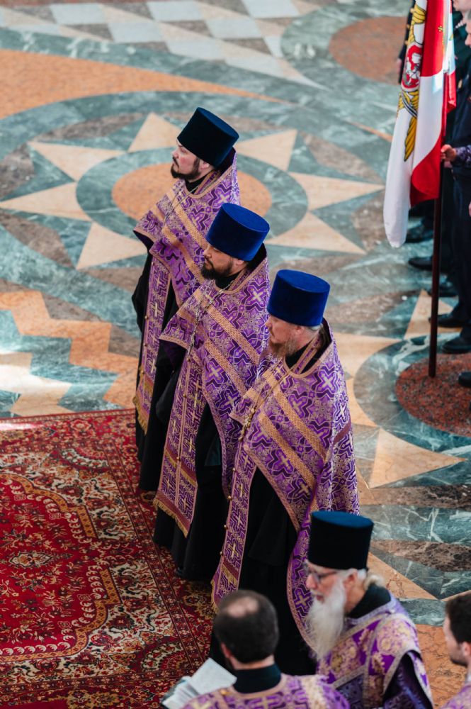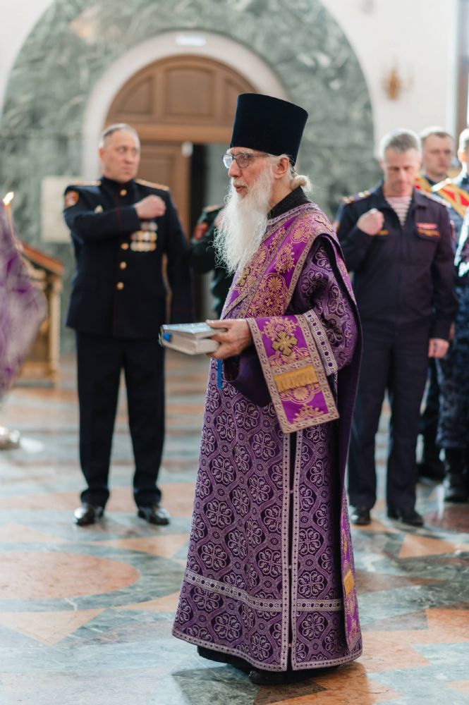 Богослужение возглавил митрополит Йошкар-Олинский и Марийский Иоанн. Владыке сослужили ключарь кафедрального собора протоиерей Сергий Поглазов, руководитель епархиального отдела по взаимодействию с правоохранительными органами и Вооруженными силами протоиерей Александр Бачурин, клирики собора иереи Никифор Захаров, Евгений Самойлов, Александр Староверов и диакон Артемий Бобоч, а также клирик Воскресенского собора иерей Димитрий Лукьянов и протодиакон Михаил Козловский. Песнопения исполнял архиерейский хор «Благовест» под управлением Татьяны Черновой.