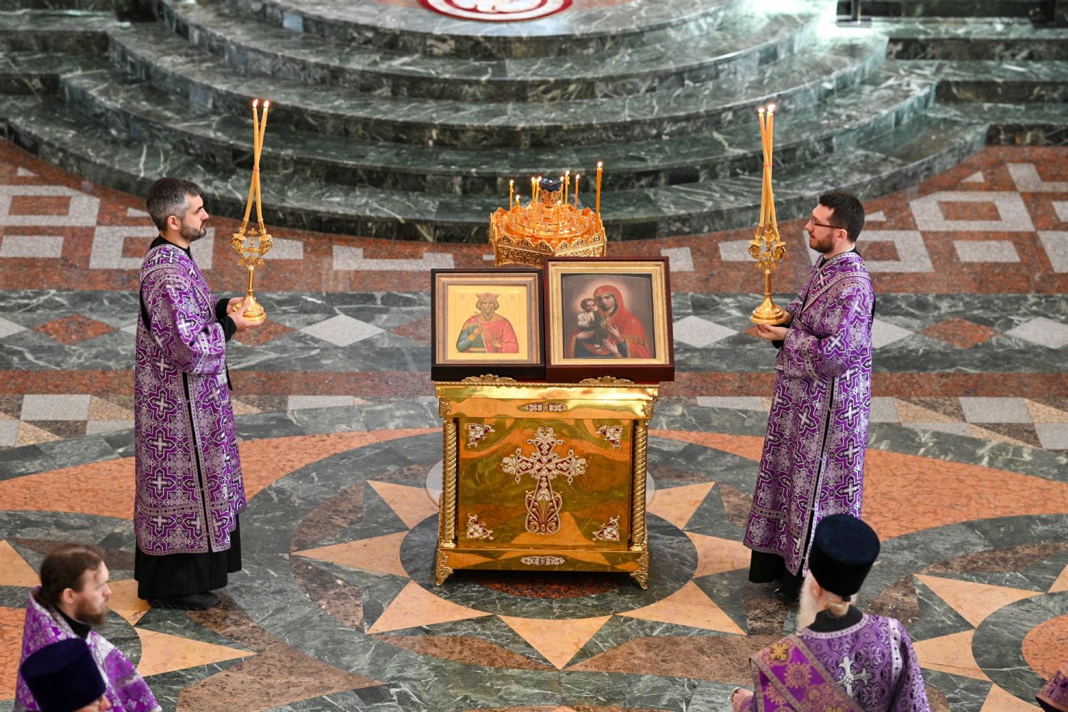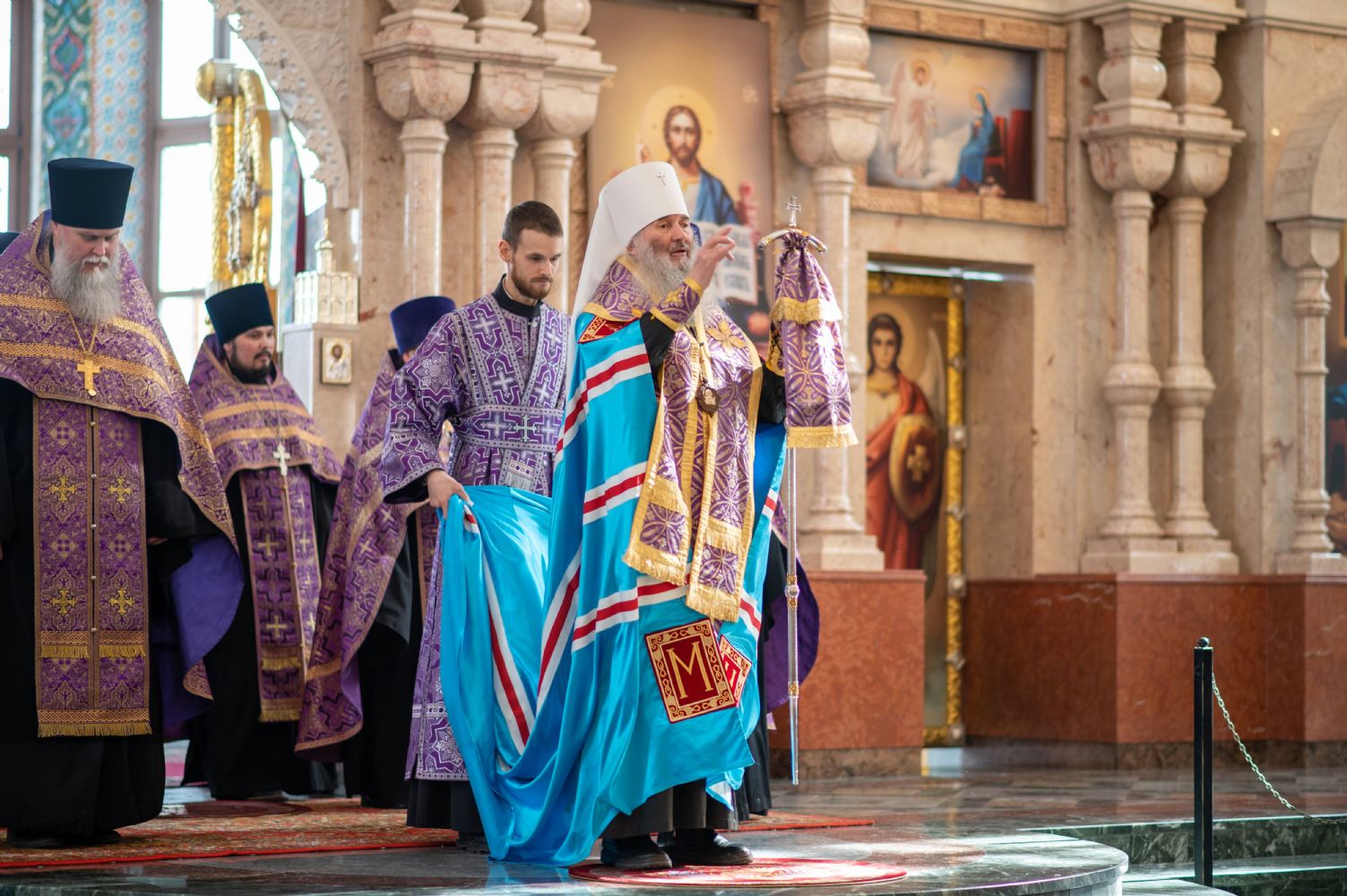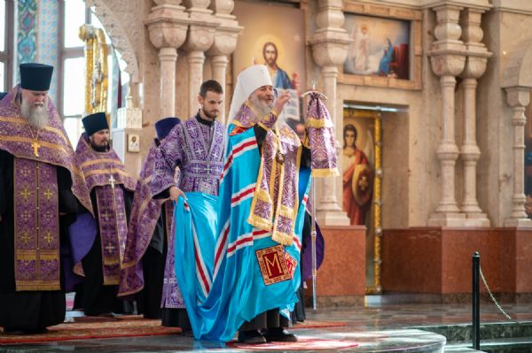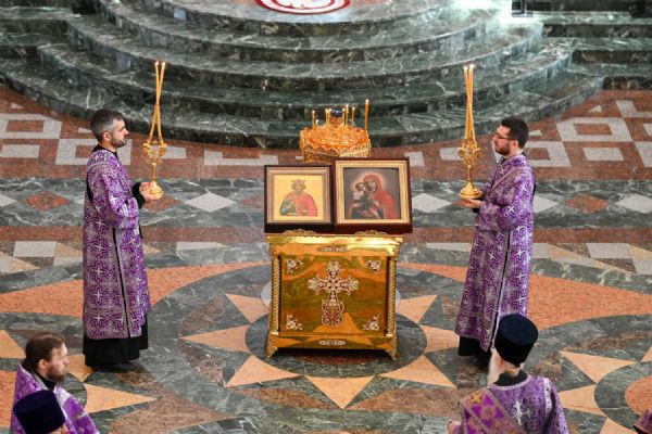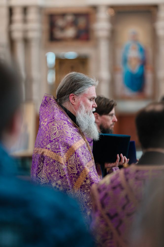 Богослужение возглавил митрополит Йошкар-Олинский и Марийский Иоанн. Владыке сослужили ключарь кафедрального собора протоиерей Сергий Поглазов, руководитель епархиального отдела по взаимодействию с правоохранительными органами и Вооруженными силами протоиерей Александр Бачурин, клирики собора иереи Никифор Захаров, Евгений Самойлов, Александр Староверов и диакон Артемий Бобоч, а также клирик Воскресенского собора иерей Димитрий Лукьянов и протодиакон Михаил Козловский. Песнопения исполнял архиерейский хор «Благовест» под управлением Татьяны Черновой.