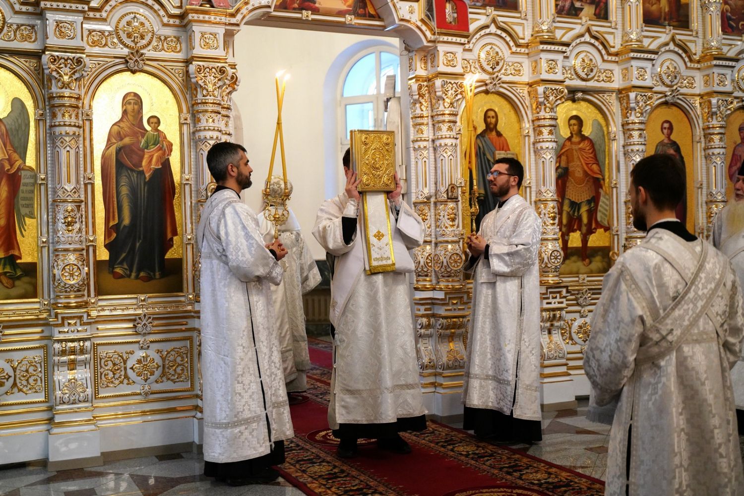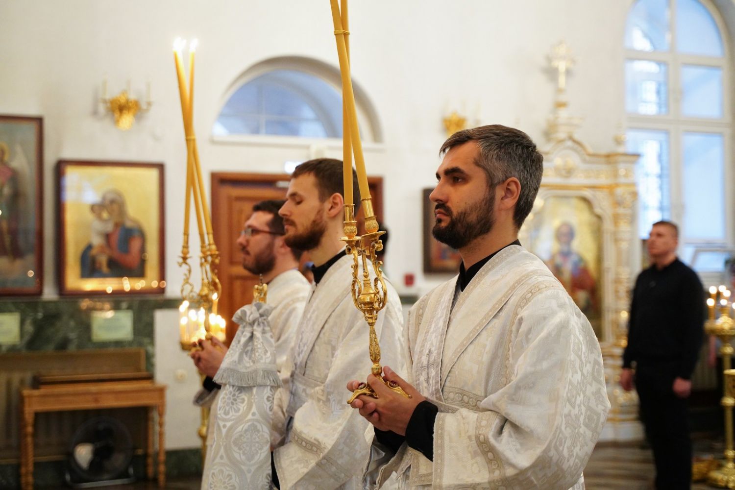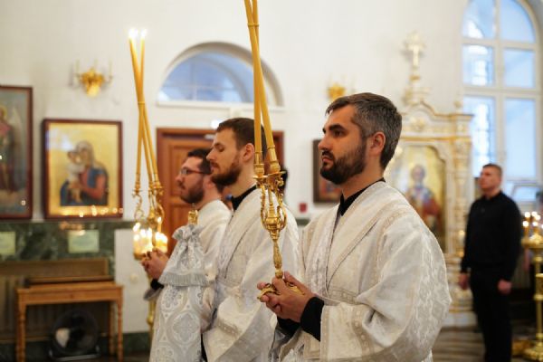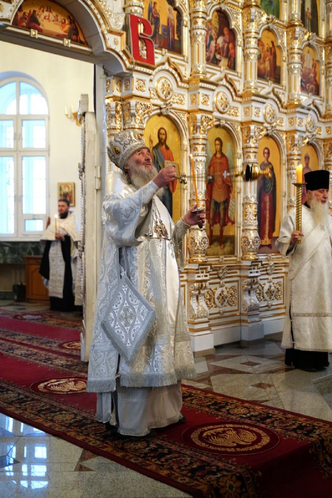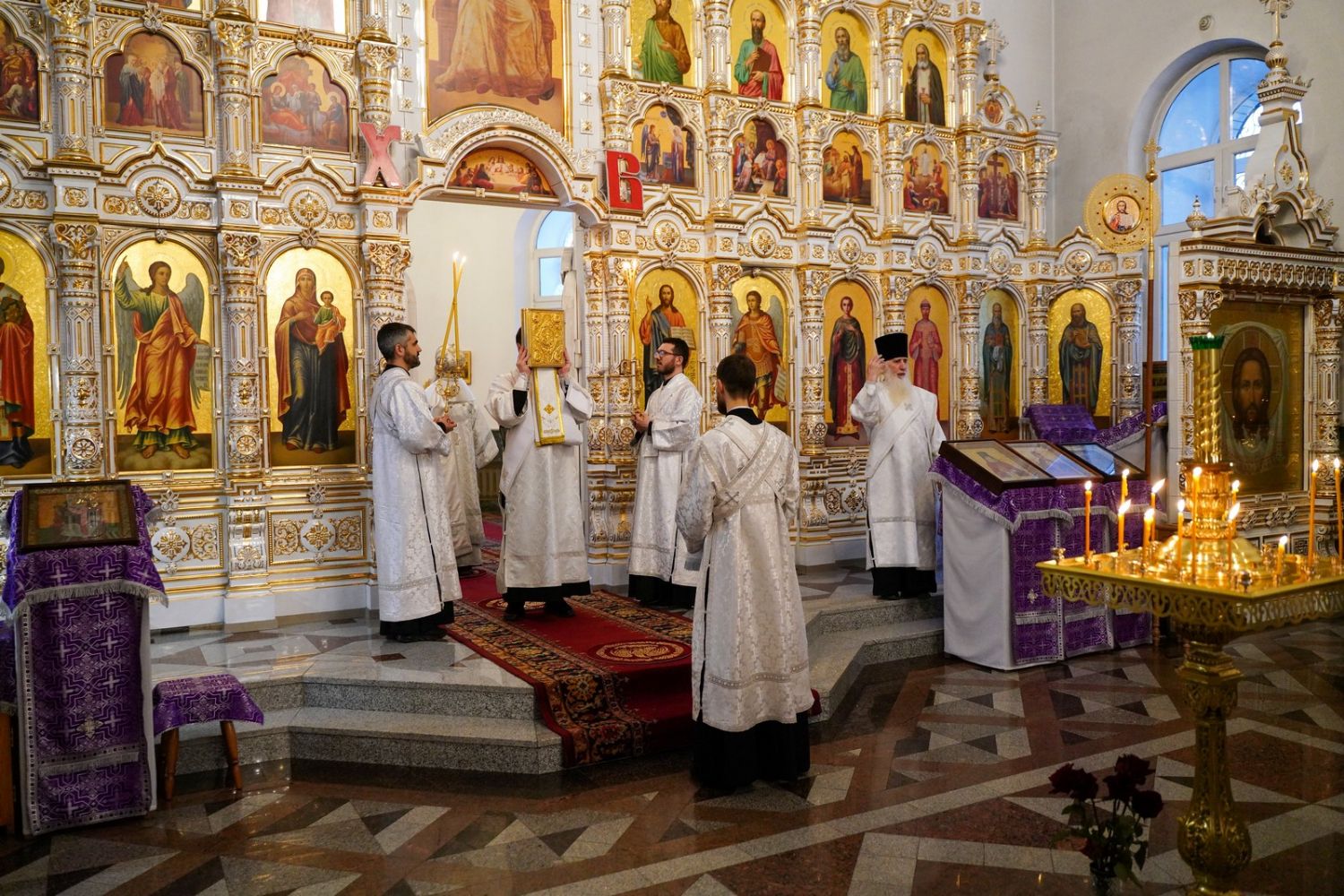 Владыке сослужили настоятель собора иерей Андрей Кочаков, клирики собора иерей Леонид Вылекжанин, иерей Димитрий Лукьянов и диакон Алексий Кузнецов, а также протодиакон Михаил Козловский. Песнопения исполнял хор собора под управлением регента Елены Поглазовой.