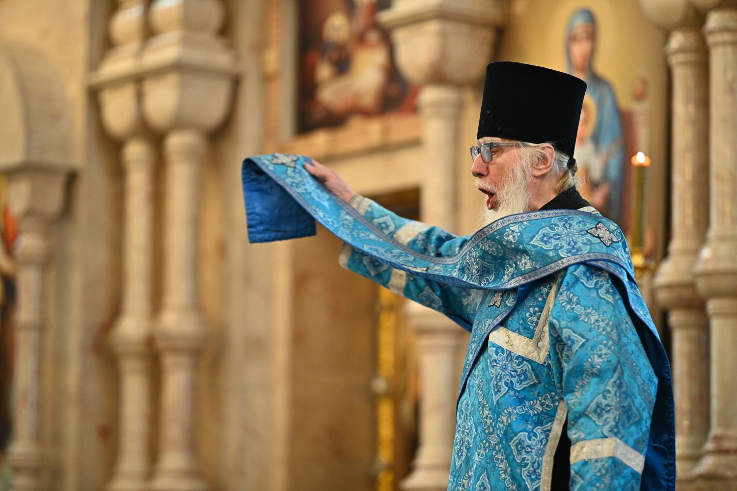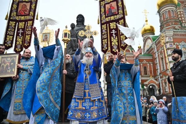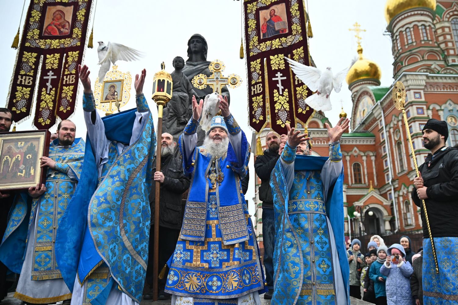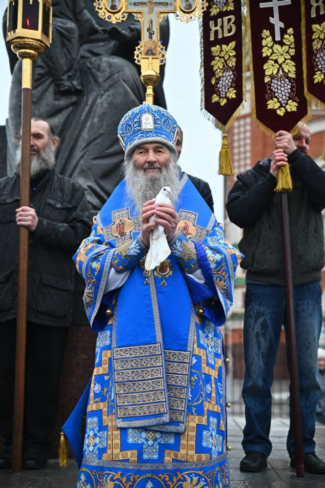 Под пение величания Деве Марии «Архангельский глас…» митрополит Иоанн, протоиерей Сергий Поглазов и иерей Никифор Захаров выпустили в небо белых голубей.