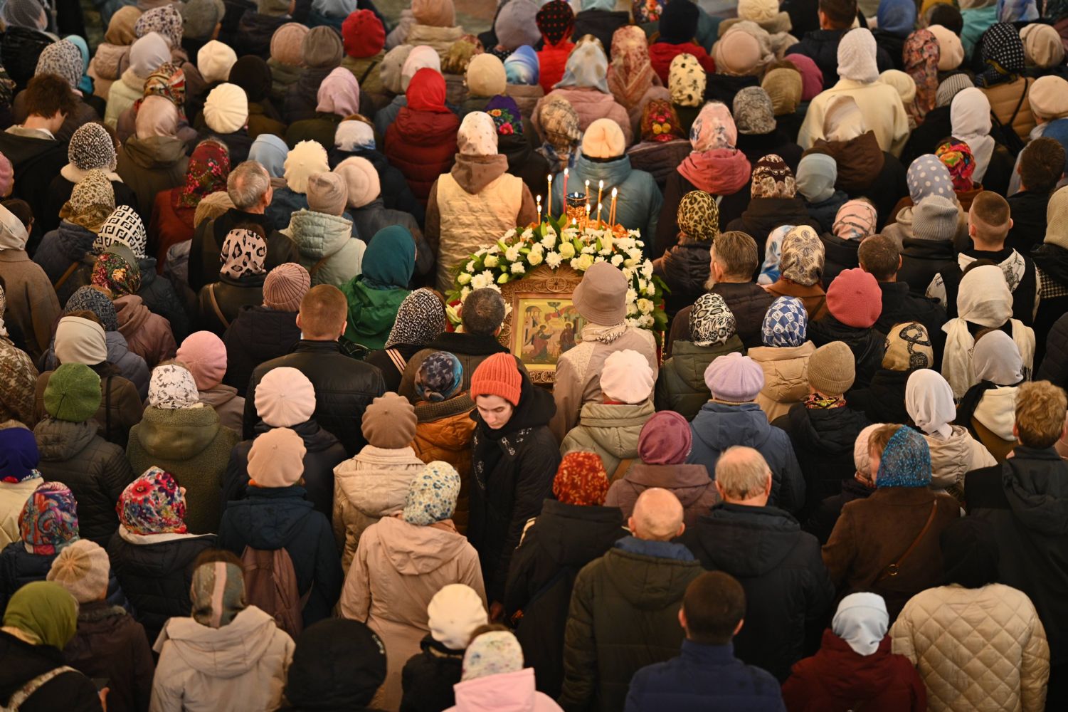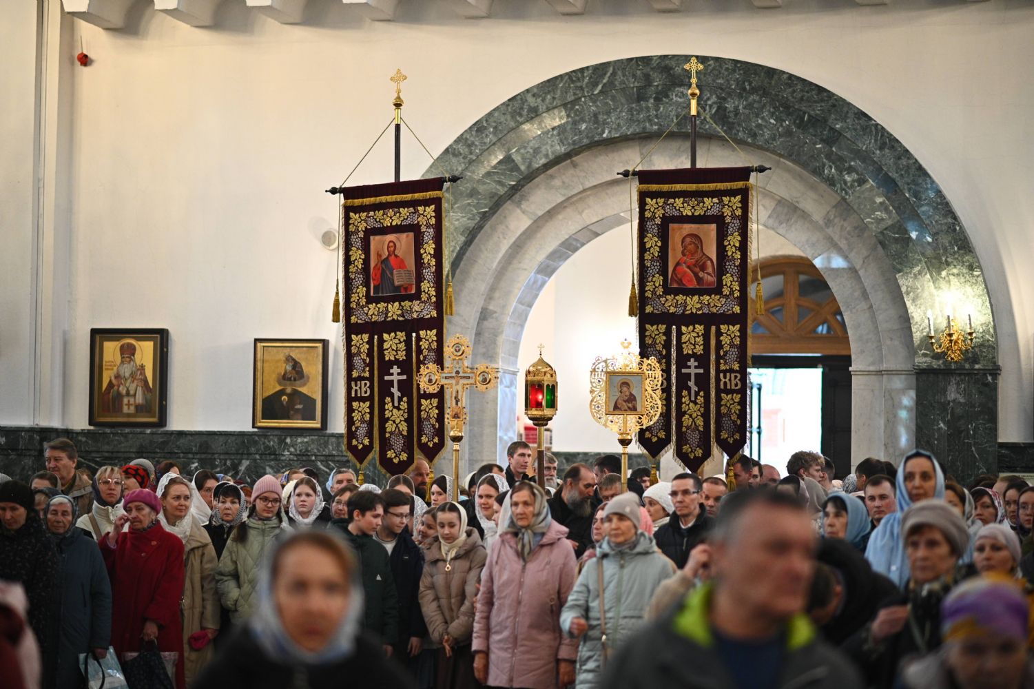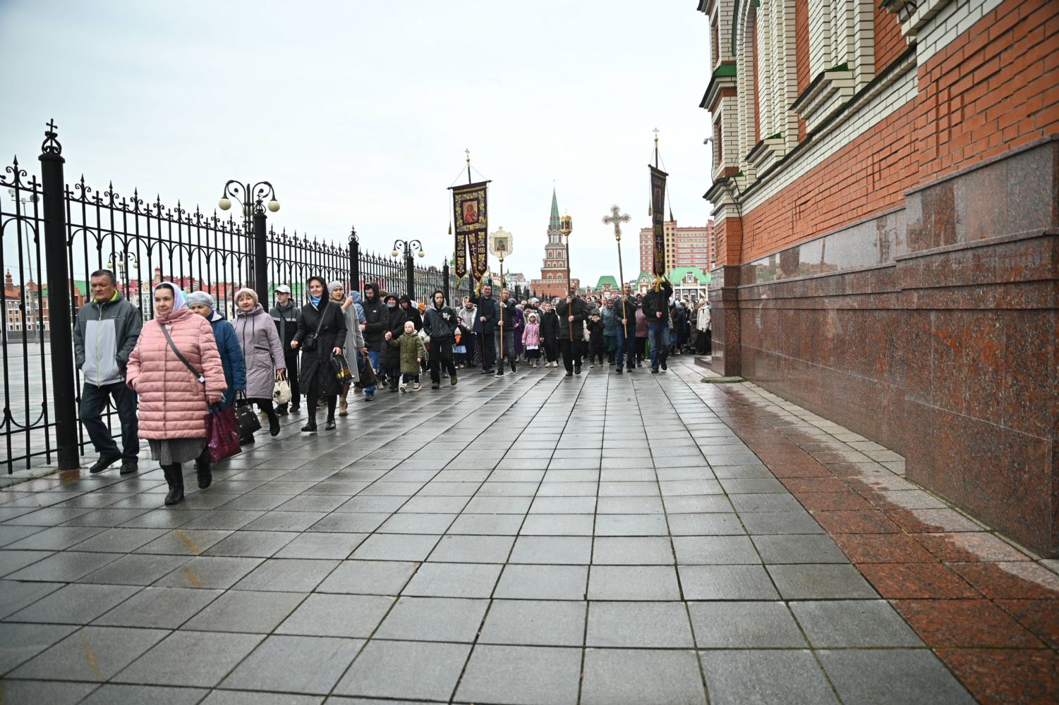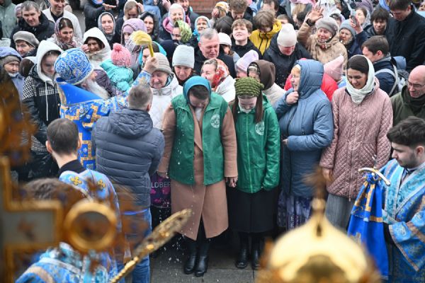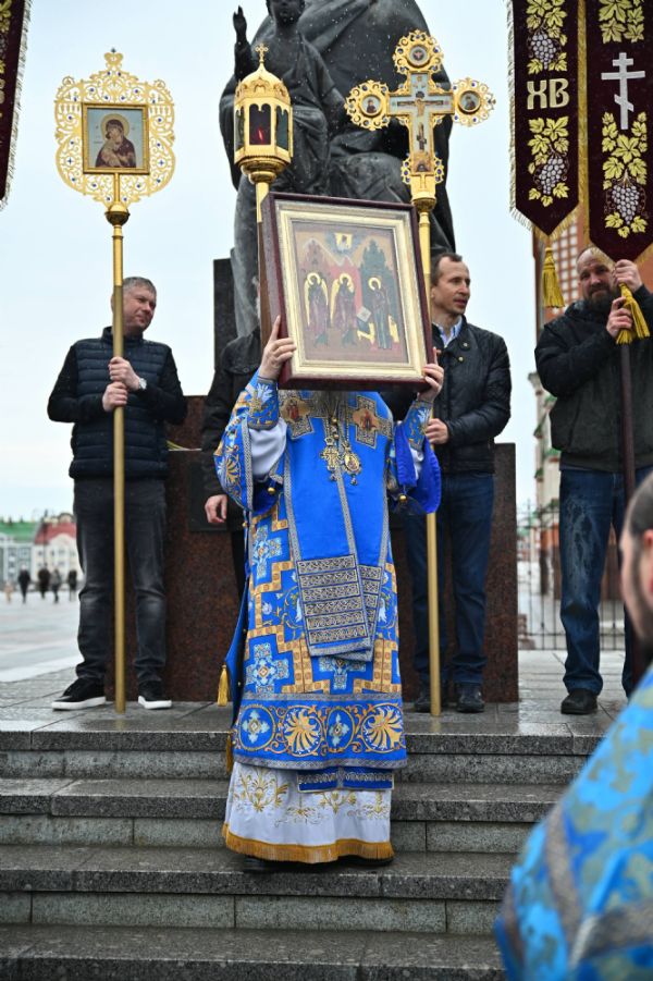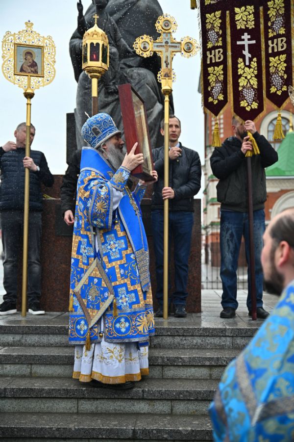 После Литургии в ознаменование престольного праздника состоялся крестный ход вокруг храма с чтением Евангелия и кроплением святой водой. По традиции, священство и миряне подошли к скульптурной композиции «Пресвятая Богородица с Младенцем Христом». Здесь верующие вознесли соборную молитву Покровительнице нашего края.