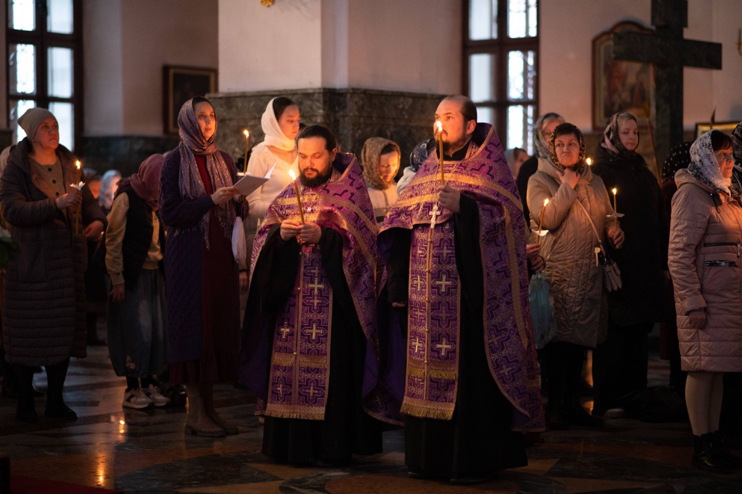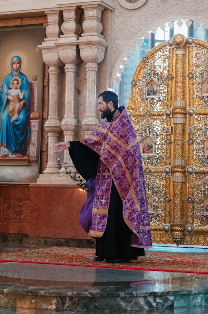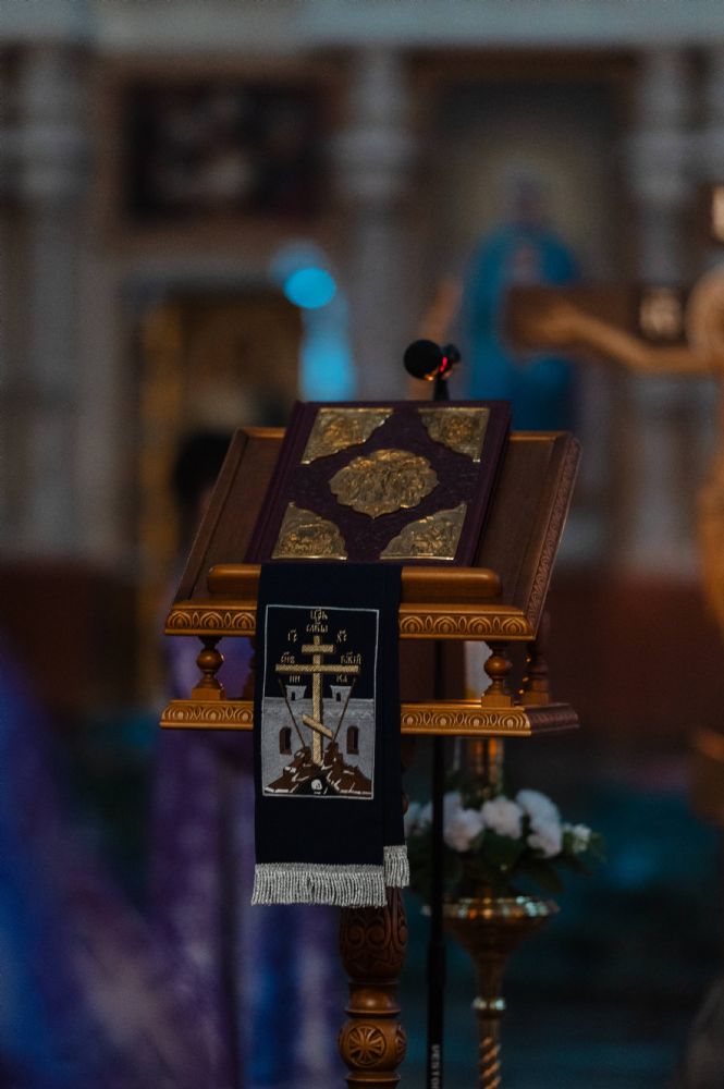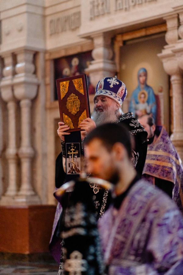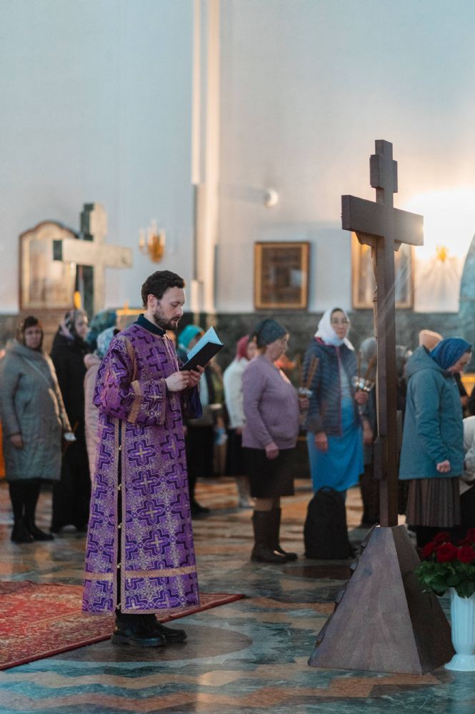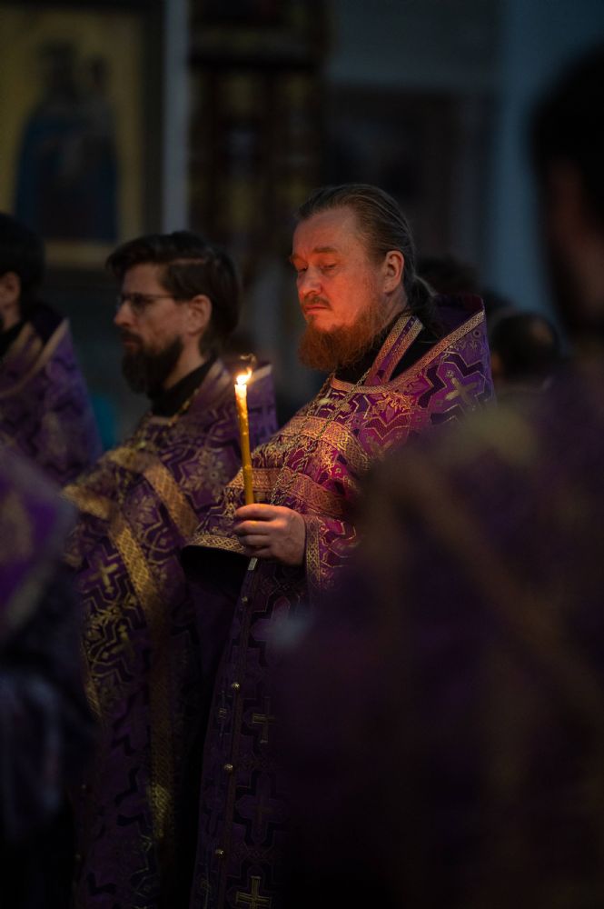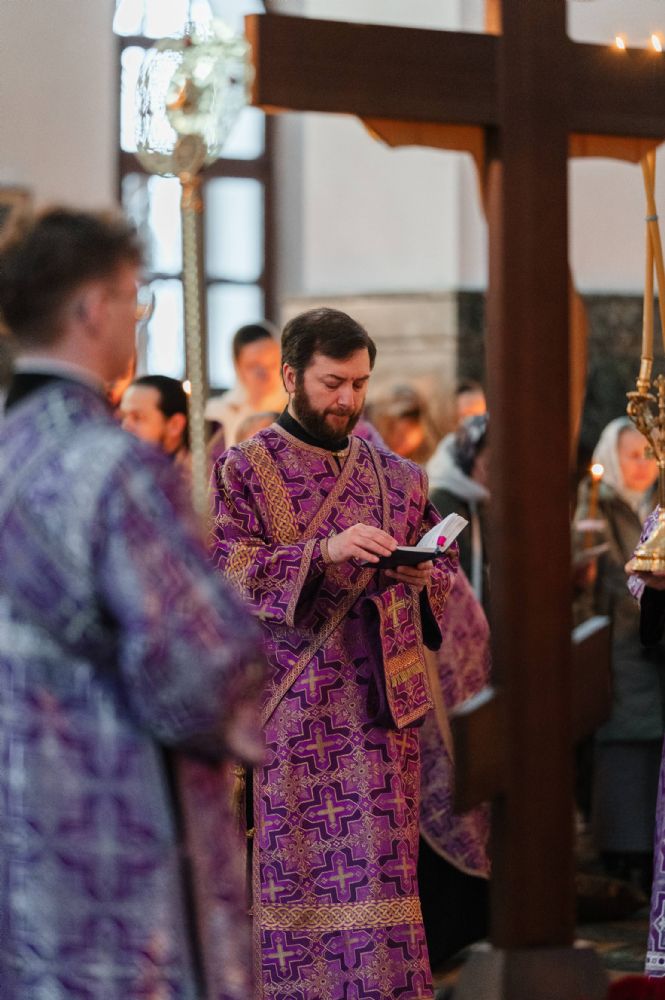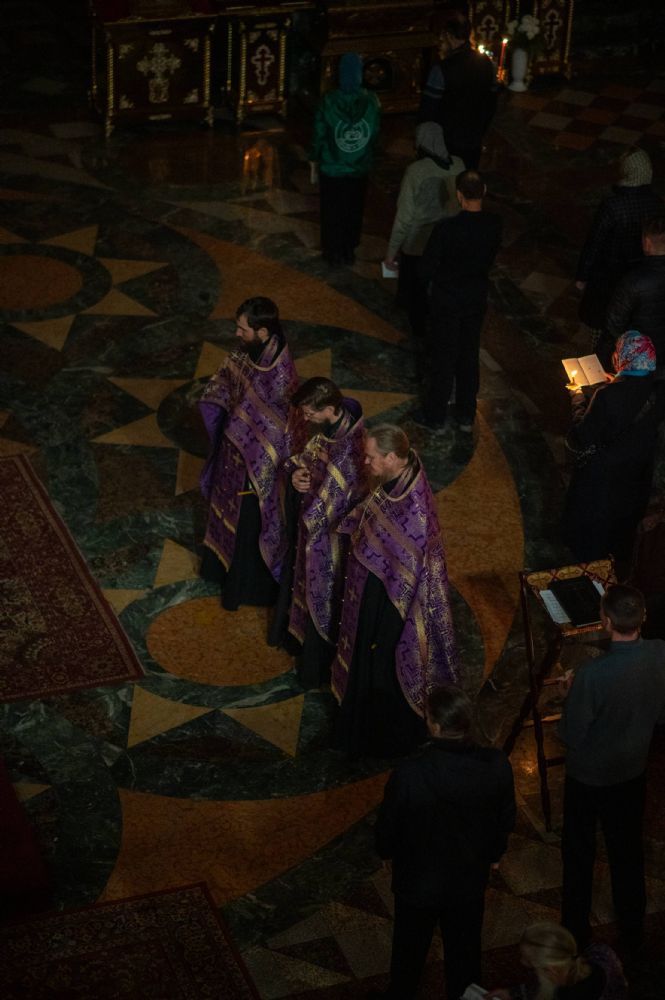 Все богослужение посвящено воспоминанию спасительных страданий и крестной смерти Господа нашего Иисуса Христа. Евангельские отрывки вместе с владыкой в центре храма поочередно читали сослужившие ему священники – ключарь собора протоиерей Сергий Поглазов, клирики собора Никифор Захаров, Евгений Самойлов, Александр Староверов и Иоанн Милютин.