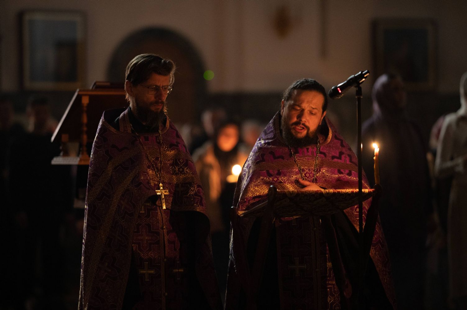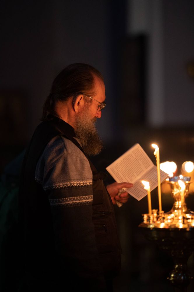 Трипеснец преподобного Космы Маюмского в центре храма перед Распятием читали иереи Никифор Захаров и Евгений Самойлов.