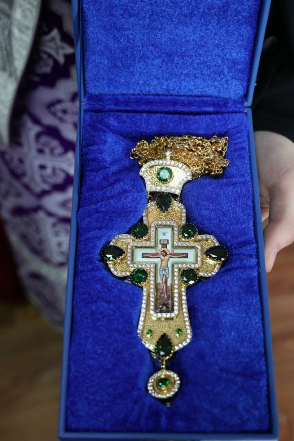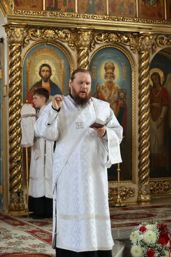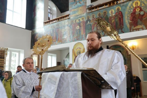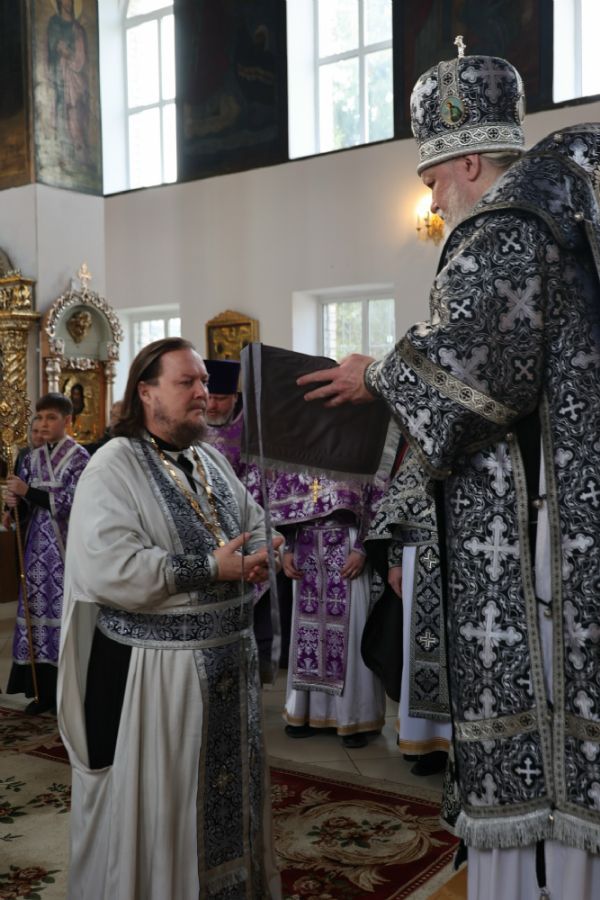 На малом входе епископ Феофан вручил богослужебно-иерархические награды: Указом Святейшего Патриарха Московского и всея Руси Кирилла за усердное и многолетнее служение Святой Церкви протоиерей Виталий Михеев удостоен права ношения наперсного креста с украшениями; иерей Николай Аникин – права ношения палицы.