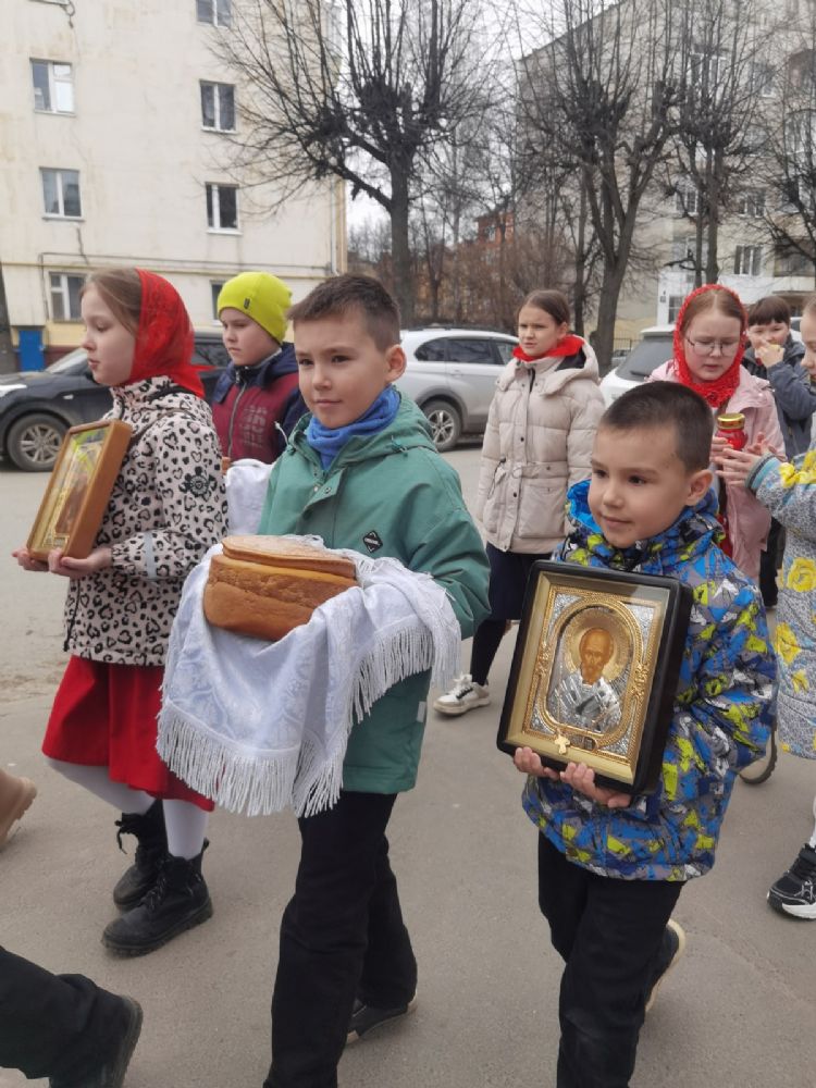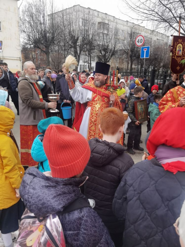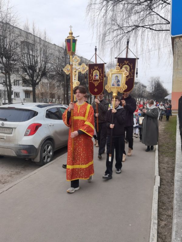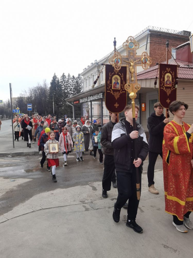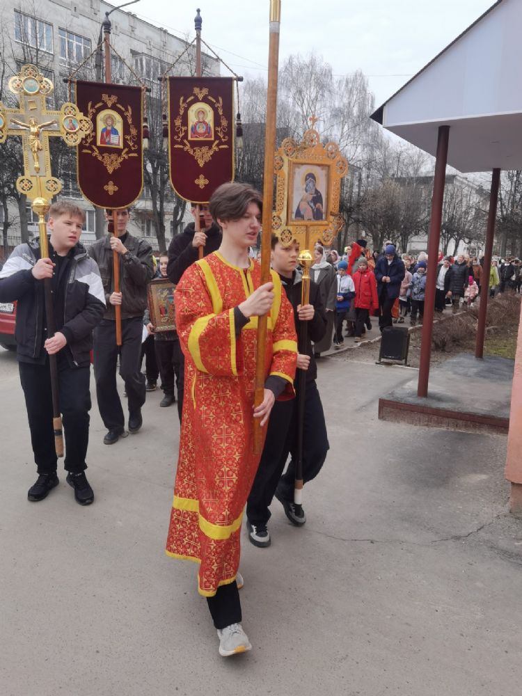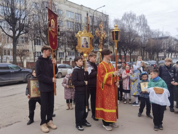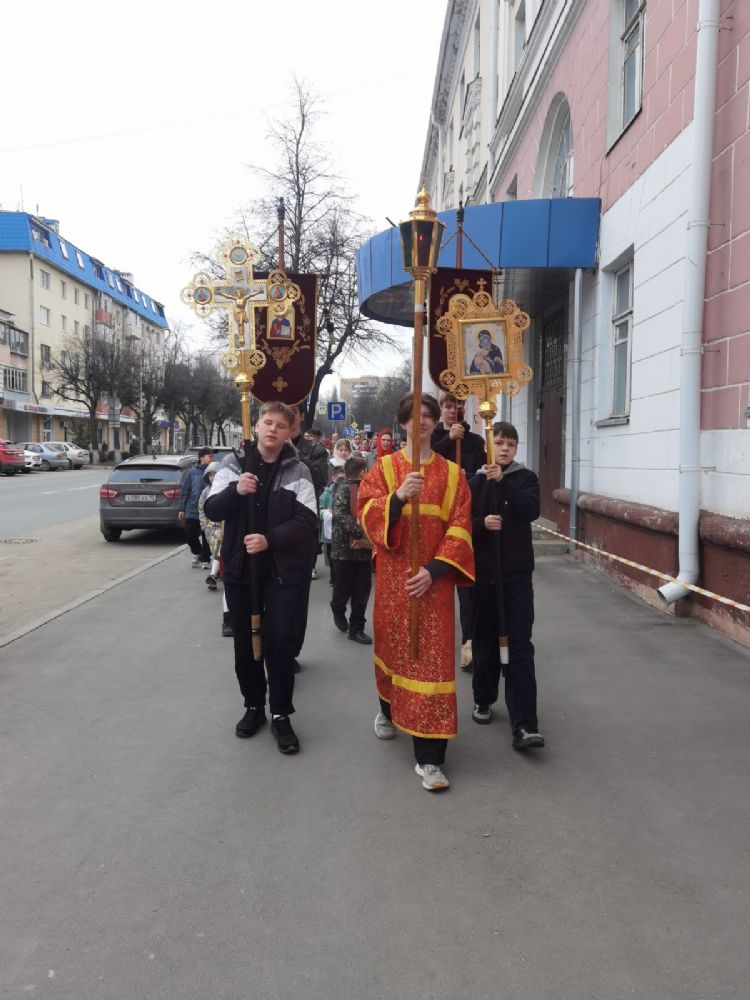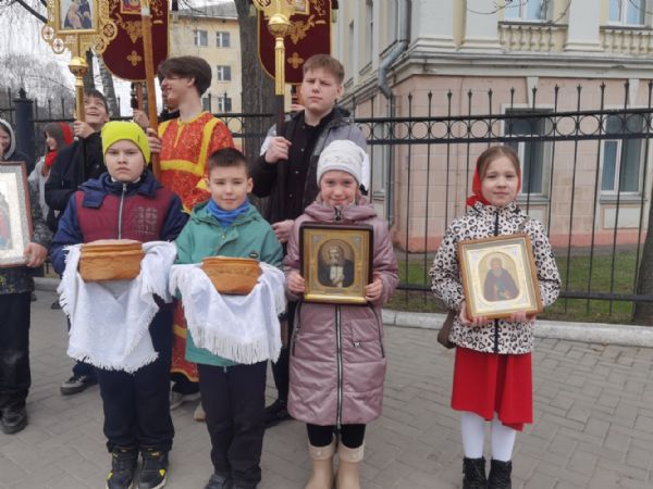 После Литургии прошел крестный ход, большинство участников которого были гимназисты — ребята несли хоругви, артосы, иконы Воскресения Христова, небесного покровителя гимназии — преподобного Сергия Радонежского и других чтимых святых. Звучали пасхальные песнопения, на возгласы священников «Христос Воскресе!» дети весело и звонко кричали «Воистину Воскресе!» Радостное настроение ребят передавалось прохожим — ведь крестный ход, по традиции, двигался поквартально по четырем улицам Йошкар-Олы! Многие останавливались, осеняли себя крестным знамением, поздравляли крестоходцев с праздником Пасхи. На остановках батюшка щедро кропил всех святой водой, а дети радовались и смеялись.