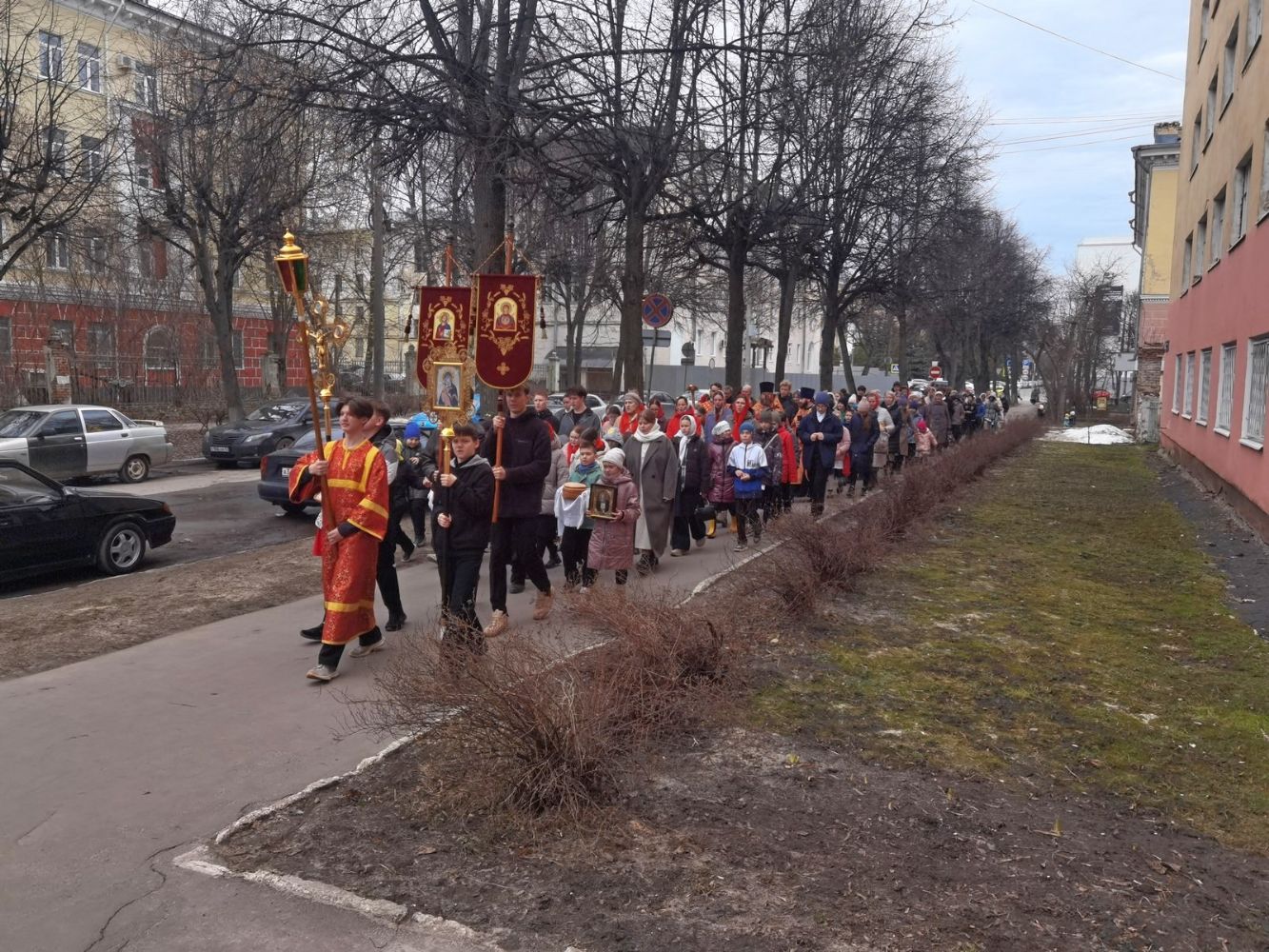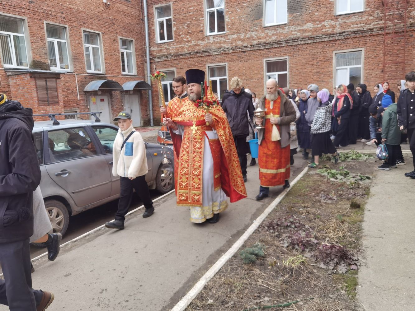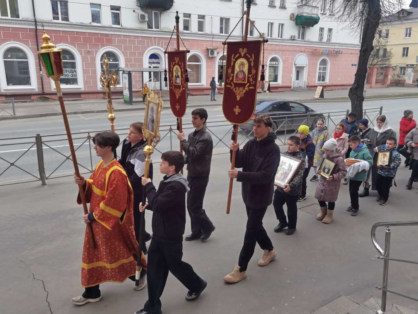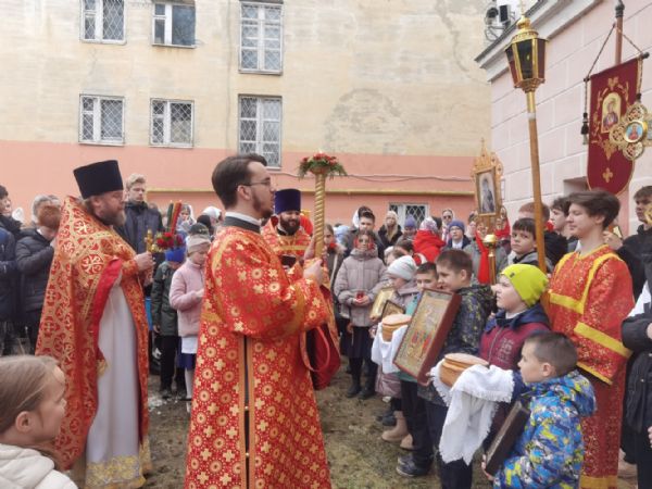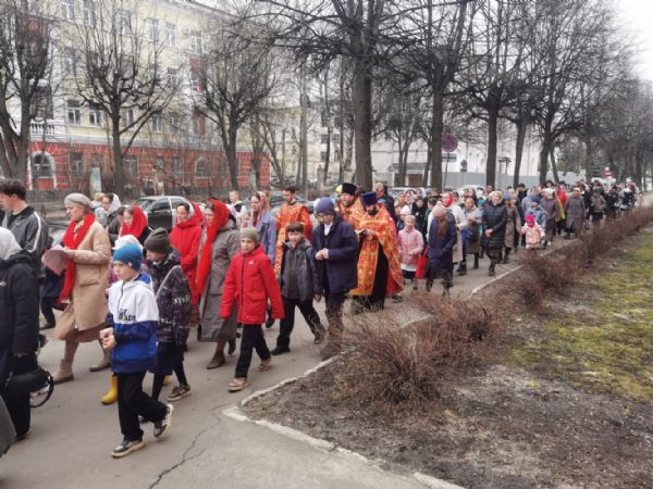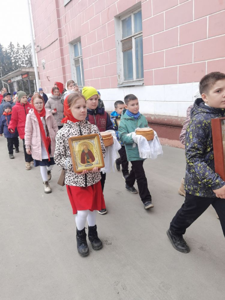 После Литургии прошел крестный ход, большинство участников которого были гимназисты — ребята несли хоругви, артосы, иконы Воскресения Христова, небесного покровителя гимназии — преподобного Сергия Радонежского и других чтимых святых. Звучали пасхальные песнопения, на возгласы священников «Христос Воскресе!» дети весело и звонко кричали «Воистину Воскресе!» Радостное настроение ребят передавалось прохожим — ведь крестный ход, по традиции, двигался поквартально по четырем улицам Йошкар-Олы! Многие останавливались, осеняли себя крестным знамением, поздравляли крестоходцев с праздником Пасхи. На остановках батюшка щедро кропил всех святой водой, а дети радовались и смеялись.