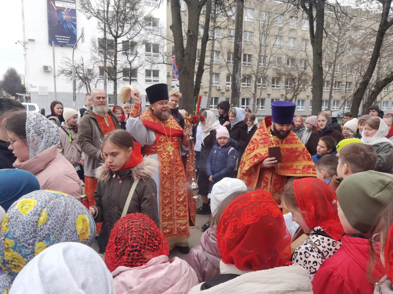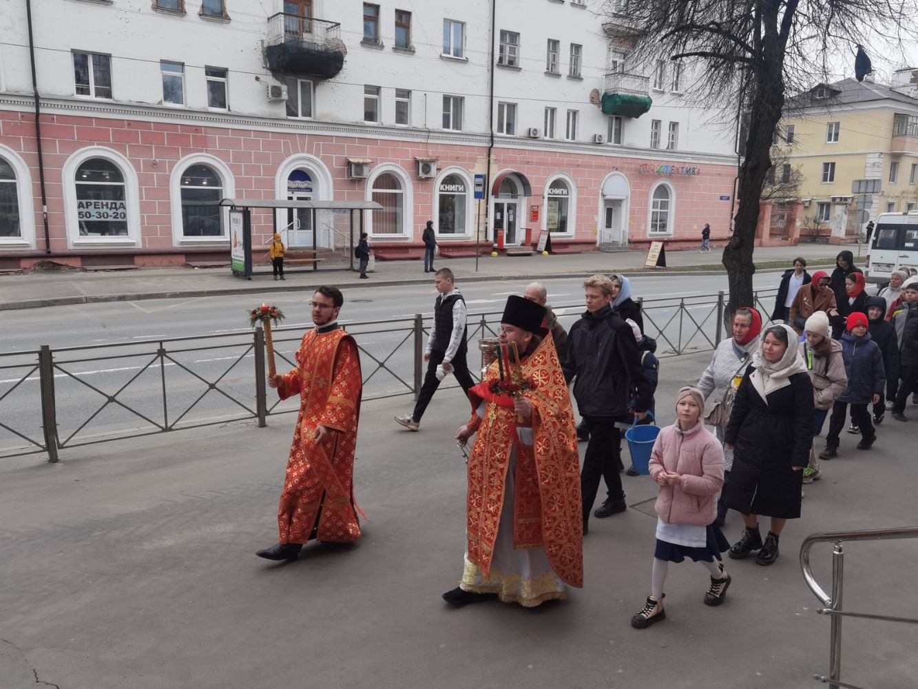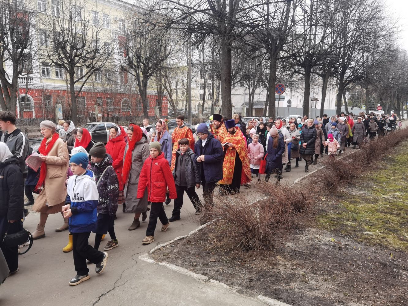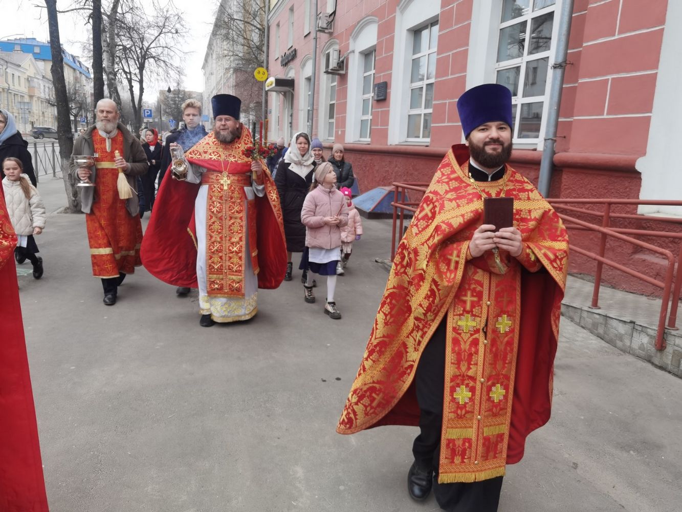 После Литургии прошел крестный ход, большинство участников которого были гимназисты — ребята несли хоругви, артосы, иконы Воскресения Христова, небесного покровителя гимназии — преподобного Сергия Радонежского и других чтимых святых. Звучали пасхальные песнопения, на возгласы священников «Христос Воскресе!» дети весело и звонко кричали «Воистину Воскресе!» Радостное настроение ребят передавалось прохожим — ведь крестный ход, по традиции, двигался поквартально по четырем улицам Йошкар-Олы! Многие останавливались, осеняли себя крестным знамением, поздравляли крестоходцев с праздником Пасхи. На остановках батюшка щедро кропил всех святой водой, а дети радовались и смеялись.
