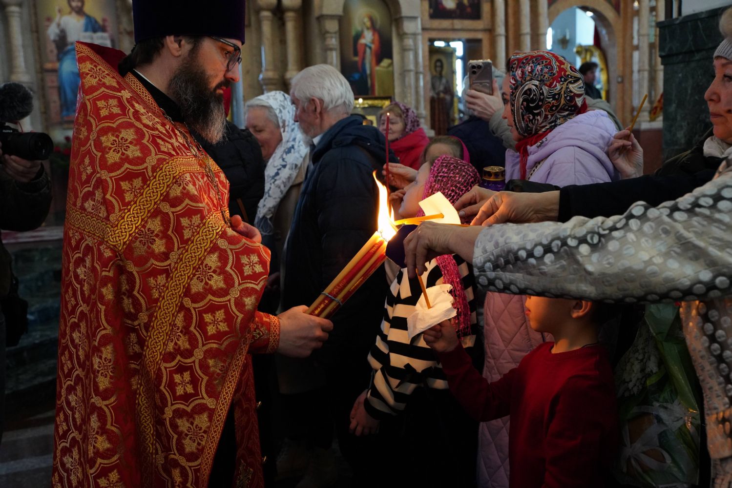 Перед началом богослужения духовенство и верующие встретили Благодатный огонь, который был доставлен на самолете из Храма Воскресения Христова (Гроба Господня) г. Иерусалима в Чебоксары, а оттуда привезен в Йошкар-Олинскую епархию. Владыка Иоанн внес зажженную лампаду в алтарь, а священники раздали огонь прихожанам, которые молились, держа горящие свечи в руках.