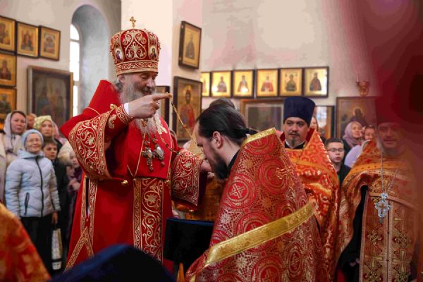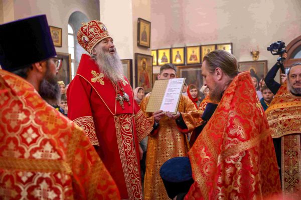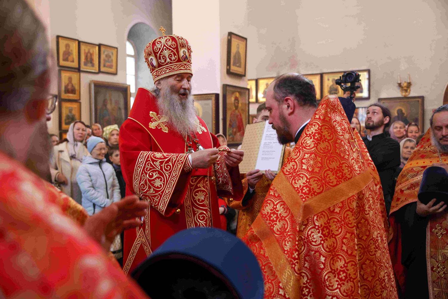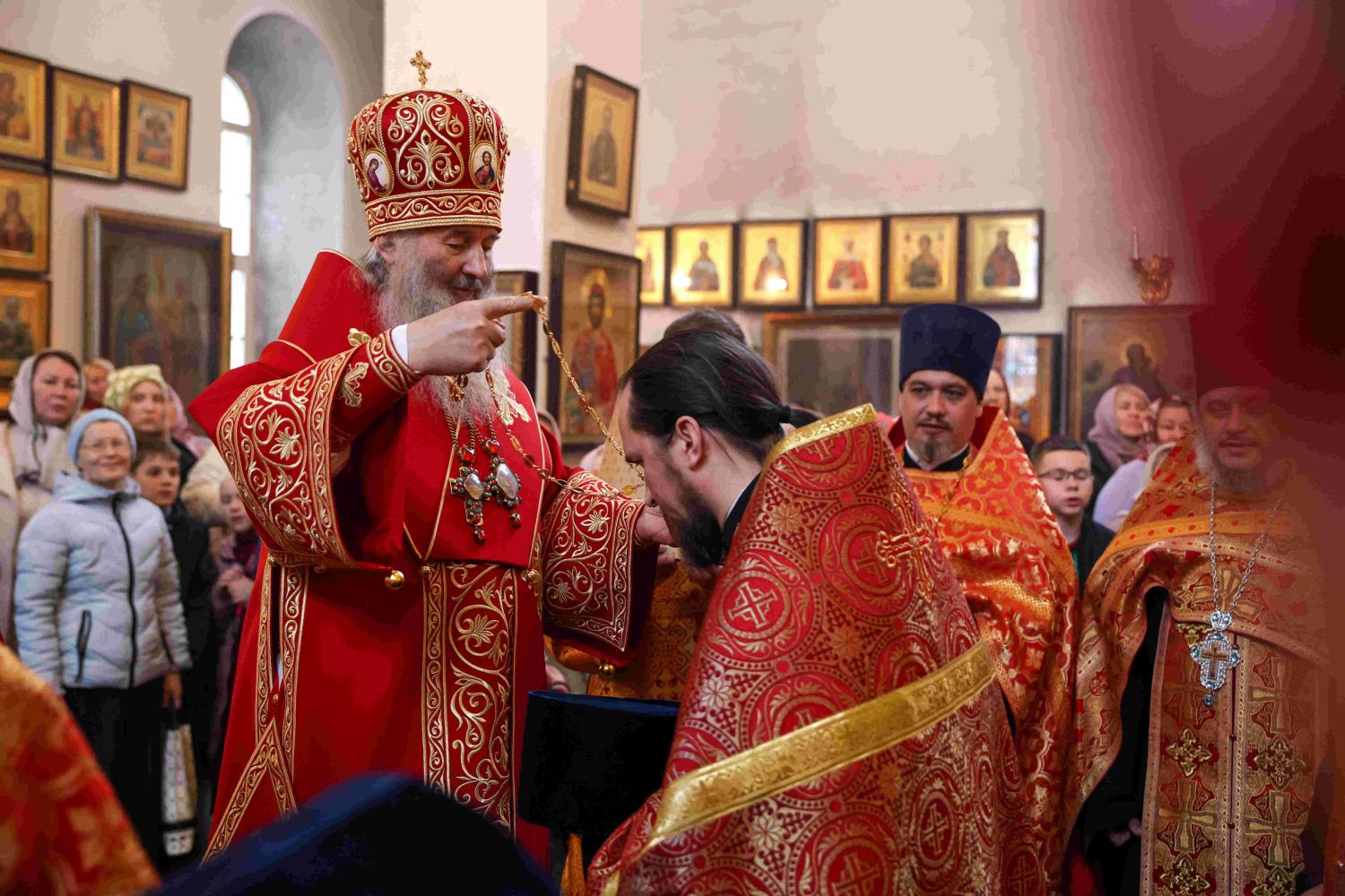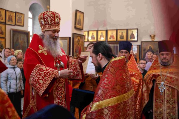 На малом входе митрополит Иоанн вручил богослужебно-иерархические награды: ключарь Благовещенского кафедрального собора протоиерей Сергий Поглазов удостоен права служения Божественной литургии с отверстыми царскими вратами по «Отче наш…»; настоятель Покровского храма с. Кокшайск иерей Алексий Леонов и настоятель Никольского храма г. Звенигово иерей Антоний Блинов – права ношения наперсного креста с украшениями; клирик Успенского храма г. Йошкар-Олы иерей Вячеслав Булычев и настоятель Никольского храма с. Нежнур иерей Димитрий Васенёв – права ношения наперсного креста золотого цвета; клирик храма иконы «Всех скорбящих Радость» г. Йошкар-Олы иерей Василий Пряморуков и клирик храма Всех святых в земле Российской просиявших п. Советский иерей Димитрий Кудряшов – права ношения набедренника; клирик храма Державной иконы Божией Матери п. Медведево диакон Игорь Кочуев – права ношения двойного ораря.