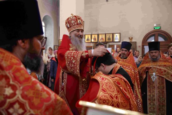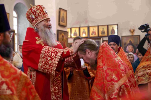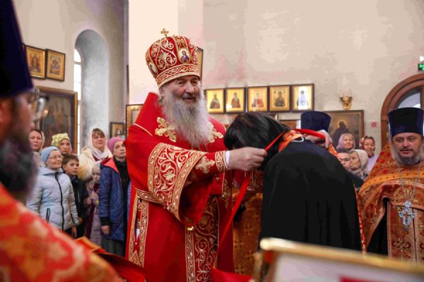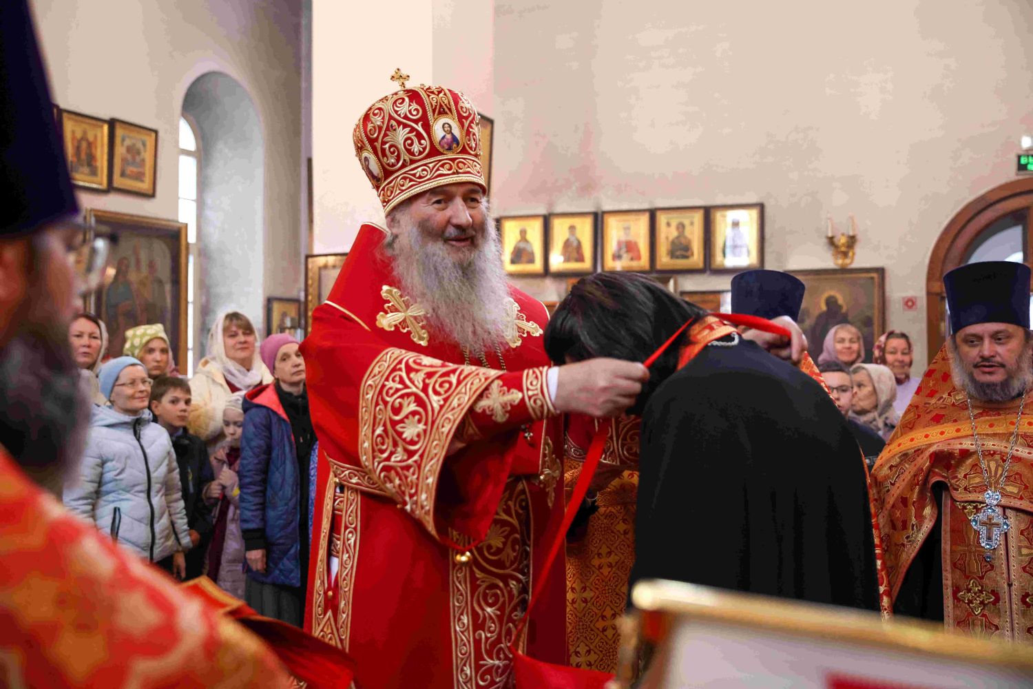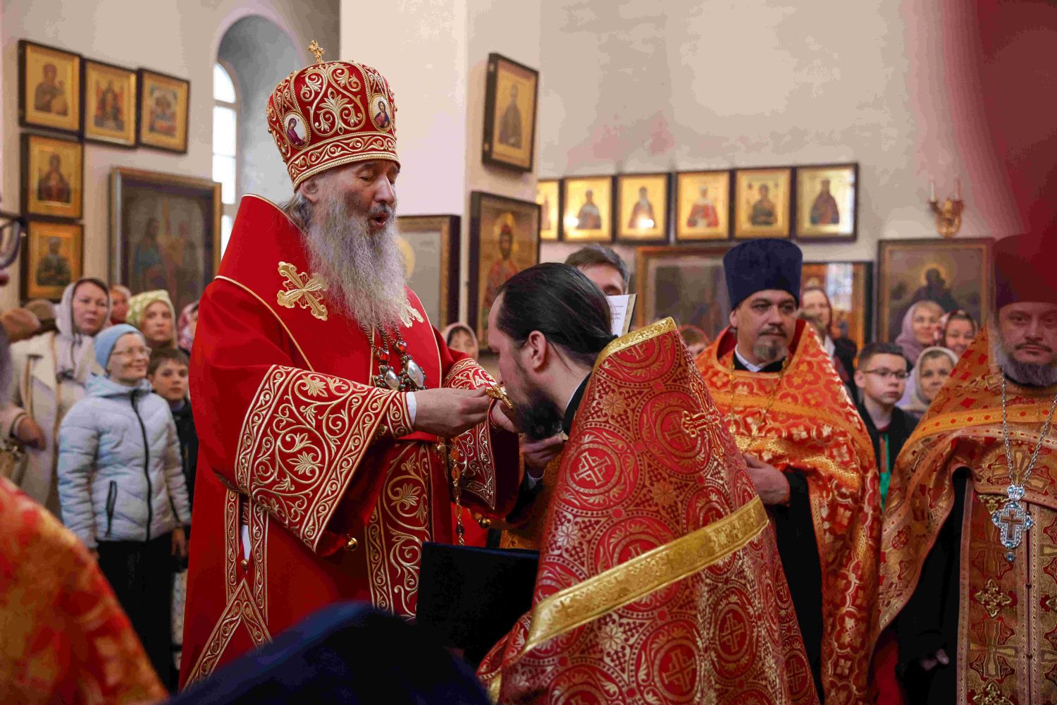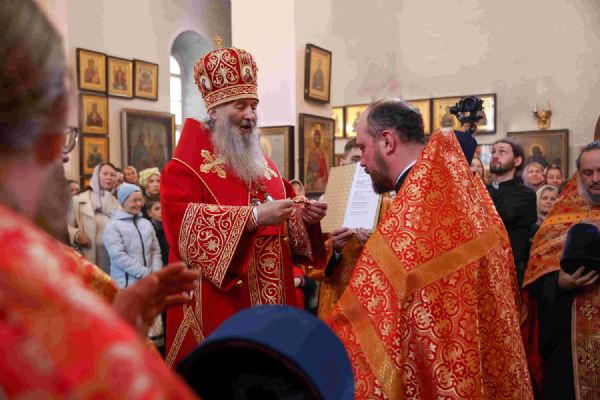 На малом входе митрополит Иоанн вручил богослужебно-иерархические награды: ключарь Благовещенского кафедрального собора протоиерей Сергий Поглазов удостоен права служения Божественной литургии с отверстыми царскими вратами по «Отче наш…»; настоятель Покровского храма с. Кокшайск иерей Алексий Леонов и настоятель Никольского храма г. Звенигово иерей Антоний Блинов – права ношения наперсного креста с украшениями; клирик Успенского храма г. Йошкар-Олы иерей Вячеслав Булычев и настоятель Никольского храма с. Нежнур иерей Димитрий Васенёв – права ношения наперсного креста золотого цвета; клирик храма иконы «Всех скорбящих Радость» г. Йошкар-Олы иерей Василий Пряморуков и клирик храма Всех святых в земле Российской просиявших п. Советский иерей Димитрий Кудряшов – права ношения набедренника; клирик храма Державной иконы Божией Матери п. Медведево диакон Игорь Кочуев – права ношения двойного ораря.