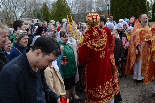 После Литургии прошел крестный ход пасхальным чином с чтением Евангелия и кроплением святой водой. Затем владыка обратился к собравшимся с проповедью о пасхальной радости, которую в эти светлые дни ощущает каждый человек.