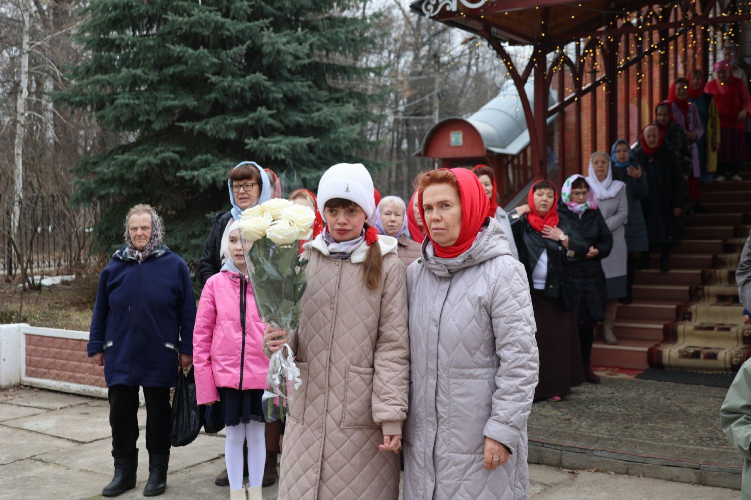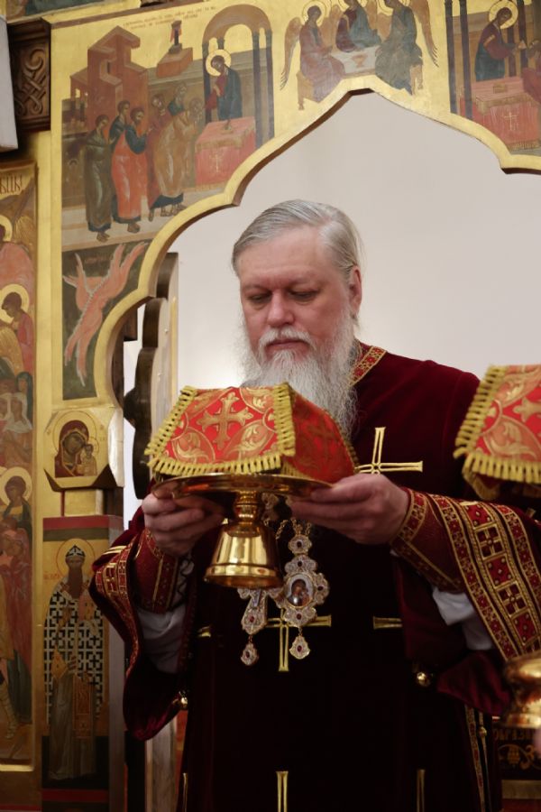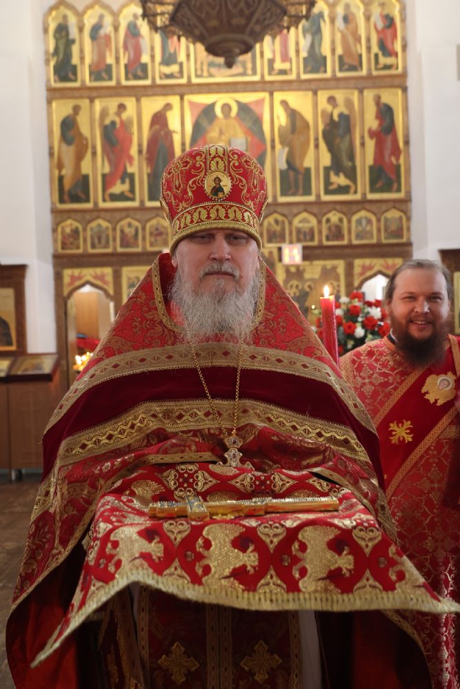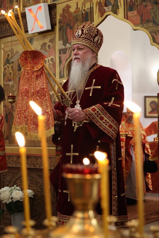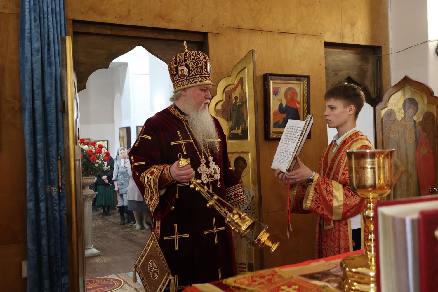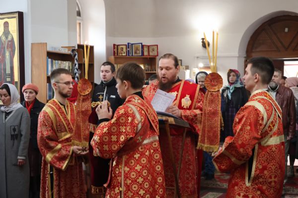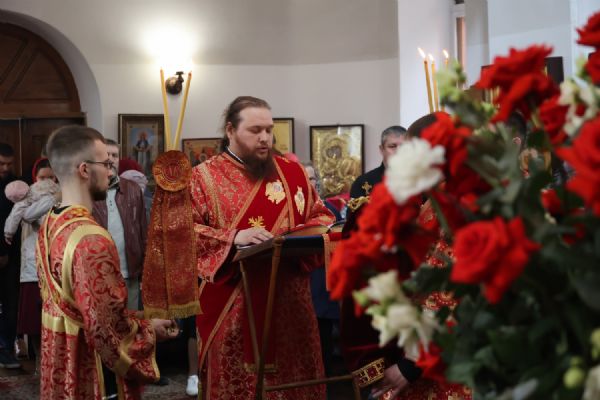 Его Преосвященству сослужили настоятель храма протоиерей Александр Михайлов, настоятель храма иконы Божией Матери «Умягчение злых сердец» д. Полевая иеромонах Амвросий (Ульянов), клирик Скорбященского храма иерей Александр Тимофеев, а также клирики Никольского кафедрального собора иеромонах Питирим (Мосякин) и диакон Иоанн Захаров. Песнопения исполнял хор храма под управлением Ирины Канашиной.