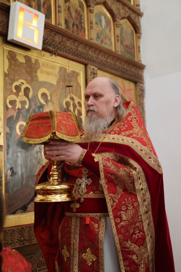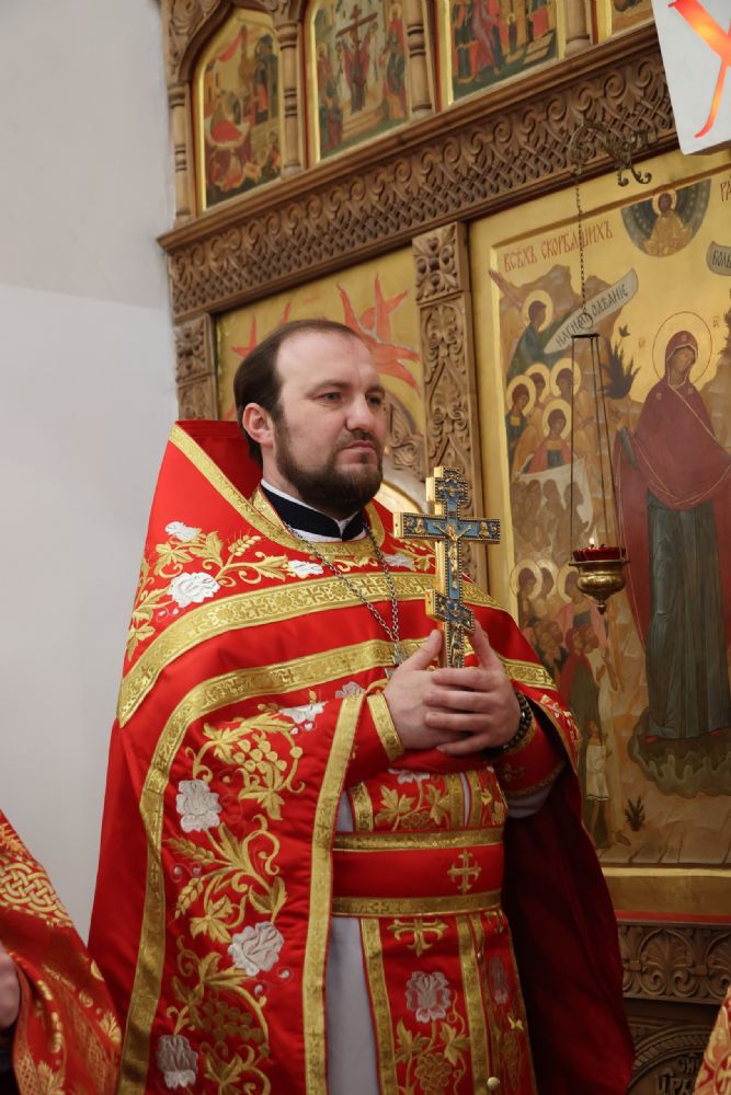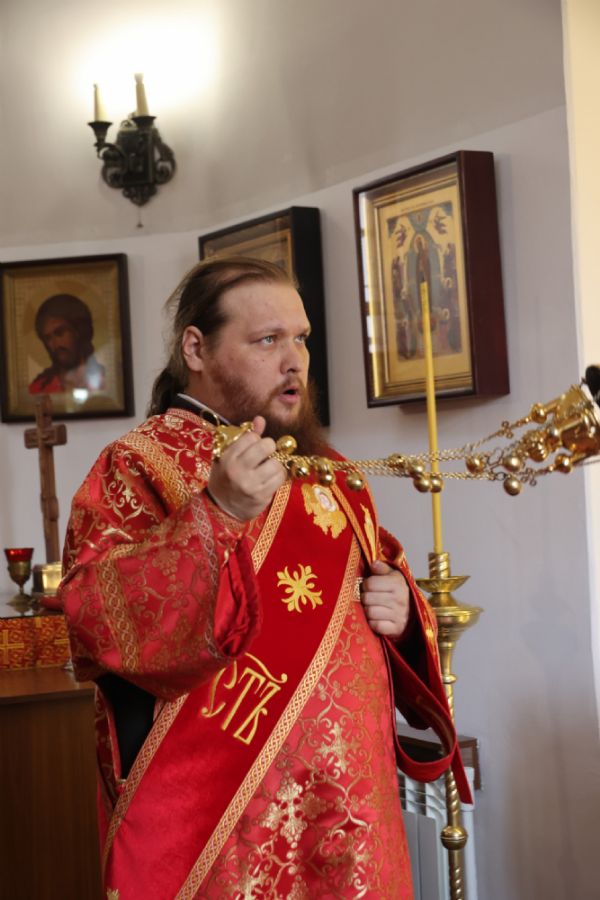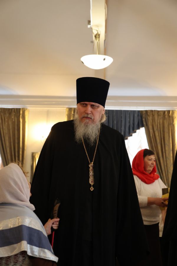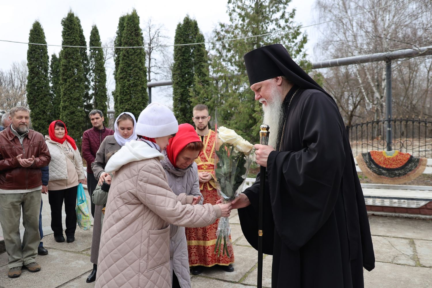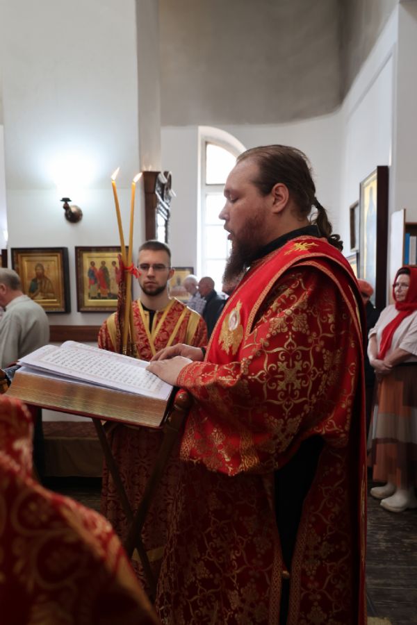 Его Преосвященству сослужили настоятель храма протоиерей Александр Михайлов, настоятель храма иконы Божией Матери «Умягчение злых сердец» д. Полевая иеромонах Амвросий (Ульянов), клирик Скорбященского храма иерей Александр Тимофеев, а также клирики Никольского кафедрального собора иеромонах Питирим (Мосякин) и диакон Иоанн Захаров. Песнопения исполнял хор храма под управлением Ирины Канашиной.