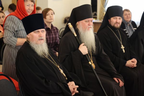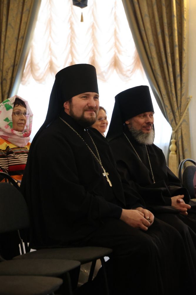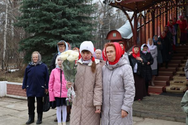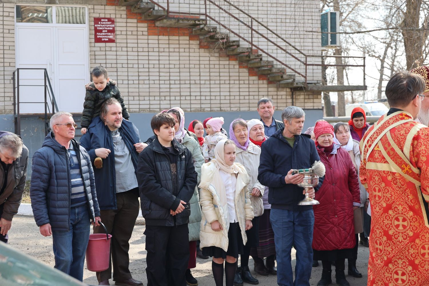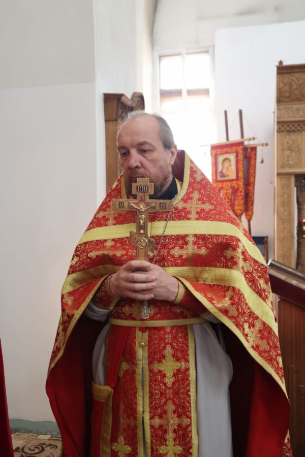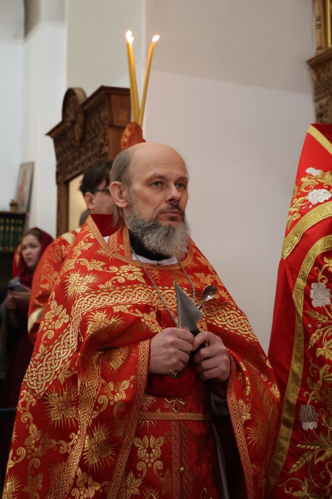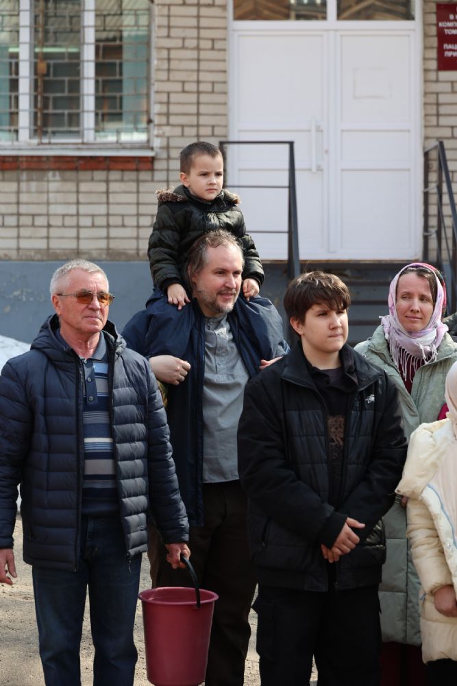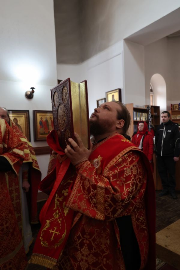 Его Преосвященству сослужили настоятель храма протоиерей Александр Михайлов, настоятель храма иконы Божией Матери «Умягчение злых сердец» д. Полевая иеромонах Амвросий (Ульянов), клирик Скорбященского храма иерей Александр Тимофеев, а также клирики Никольского кафедрального собора иеромонах Питирим (Мосякин) и диакон Иоанн Захаров. Песнопения исполнял хор храма под управлением Ирины Канашиной.