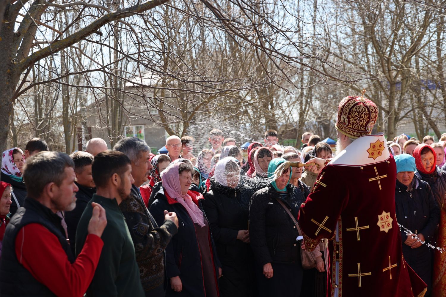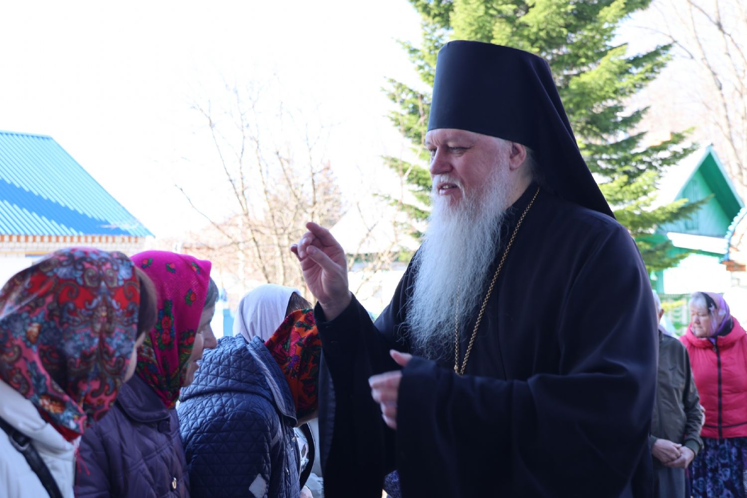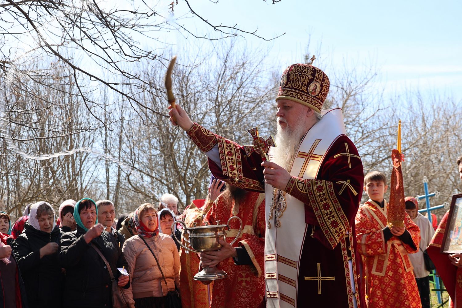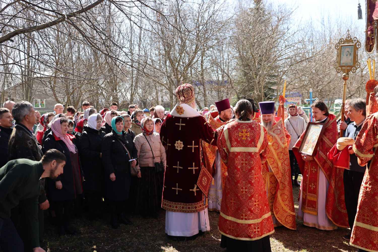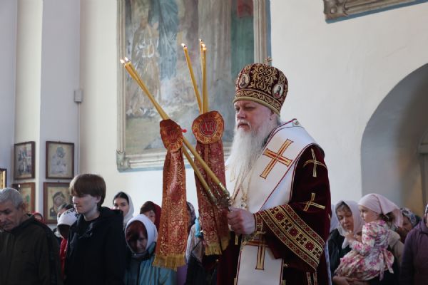 После Литургии прошел пасхальный крестный ход вокруг храма, затем епископ Феофан обратился к верующим с архипастырским словом. Владыка поздравил верующих с праздником Светлого Воскресения Христова и рассказал о сошествии во ад Господа нашего Иисуса Христа после Своей крестной смерти, а также о радостных событиях, произошедших после славного Воскресения Спасителя. Смерть побеждена, и рай вновь открыт для душ человеческих. Владыка дал почувствовать собравшимся ту радость, которую испытали жены-мироносицы и апостолы от ангельского известия о Воскресшем Спасителе. Архипастырь также напомнил о чудесном многократном явлении Спасителя в течение 40 дней Своим ученикам и женам-мироносицам.