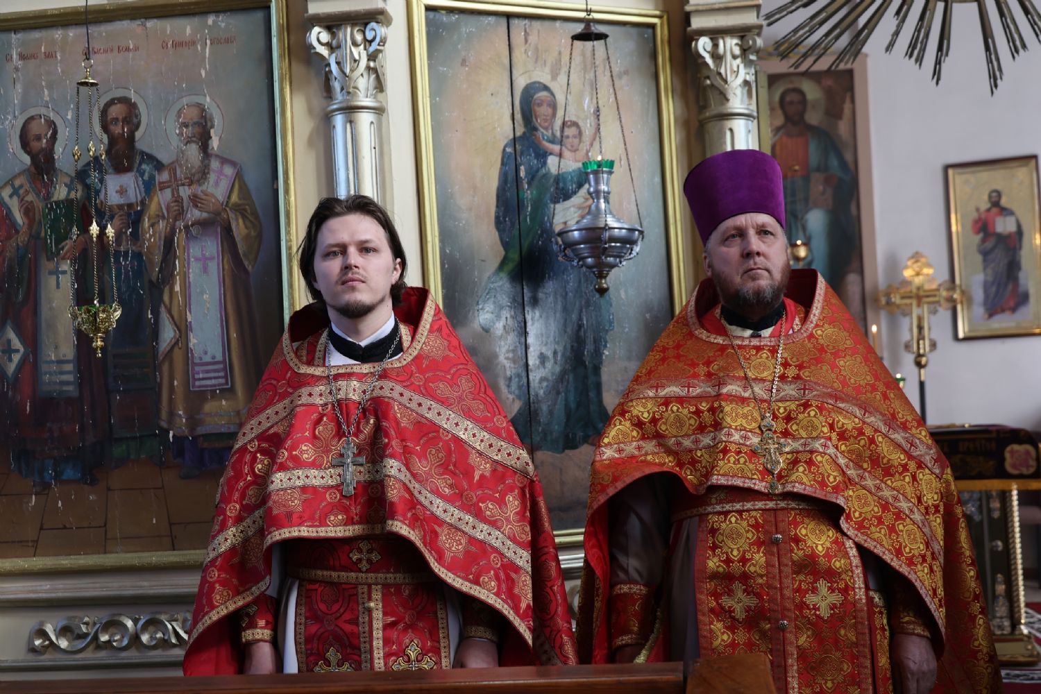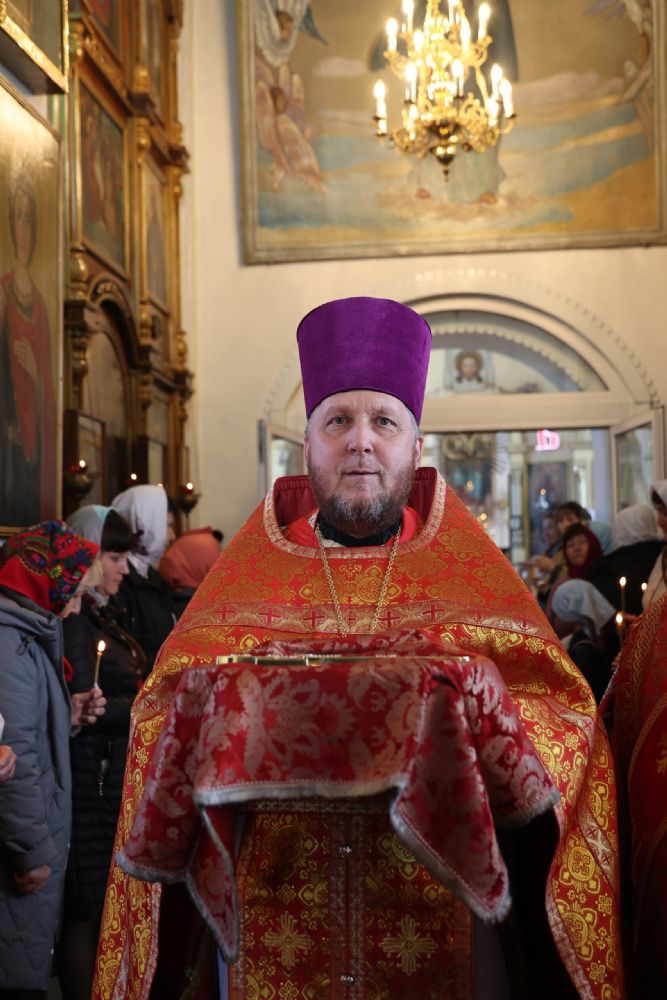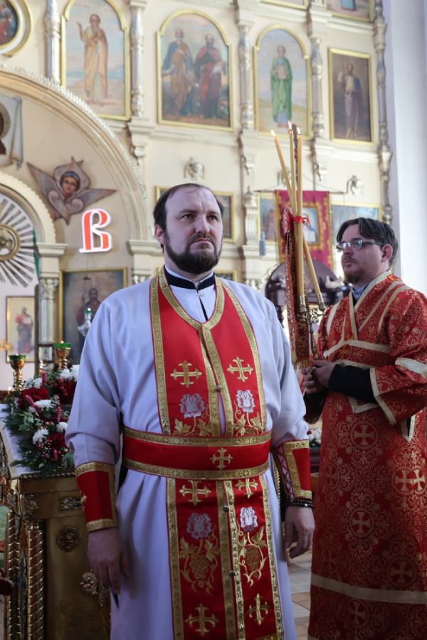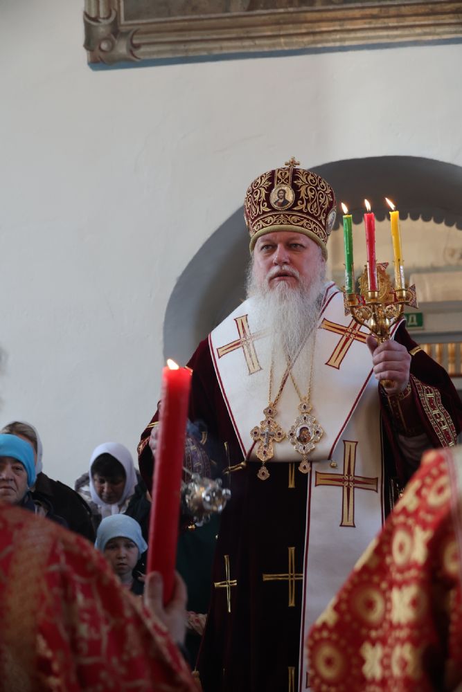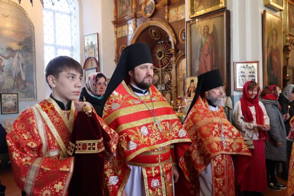 Его Преосвященству сослужили благочинный Волжского церковного округа иерей Алексий Скрябин, настоятель храма протоиерей Евгений Бакутов, настоятель храма иконы Божией Матери «Умягчение злых сердец» д. Полевая иеромонах Амвросий (Ульянов), клирик Иоанновского храма г. Волжска иерей Герман Михайлов, клирики Никольского кафедрального собора г. Волжска иеромонах Питирим (Мосякин) и диакон Иоанн Захаров. Песнопения исполнял хоре под управлением Ирины Канашиной.