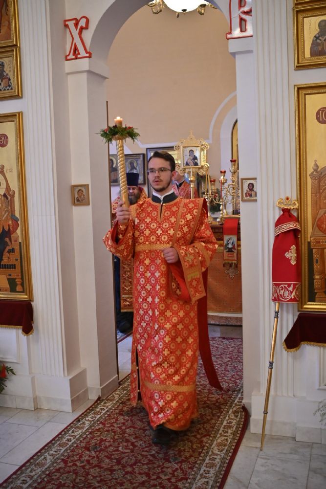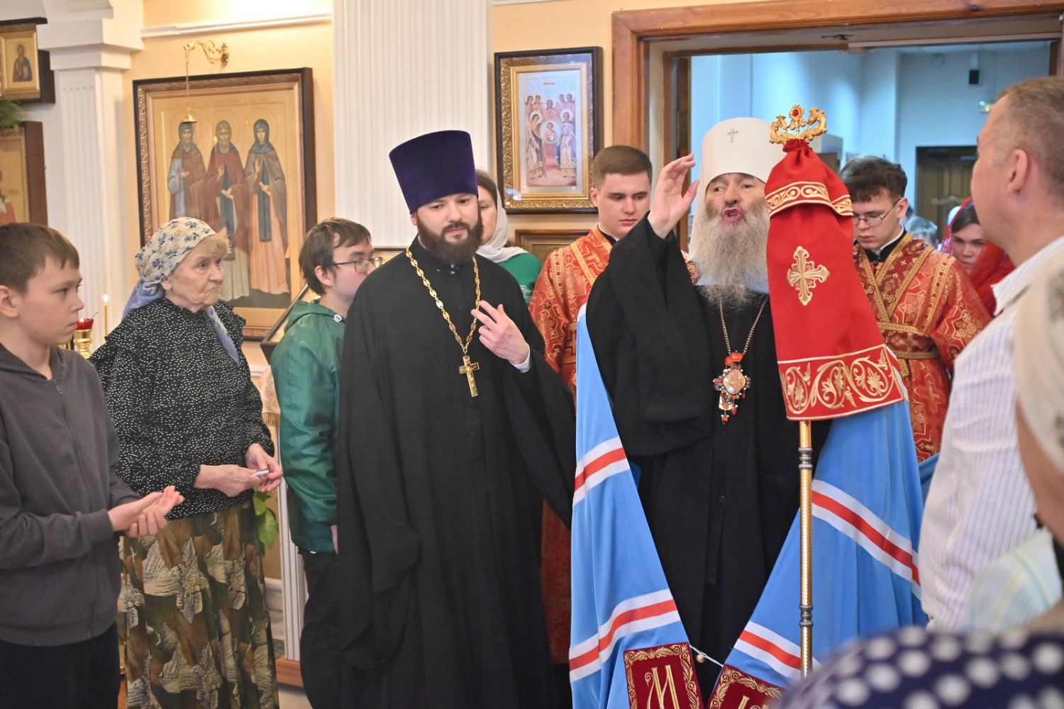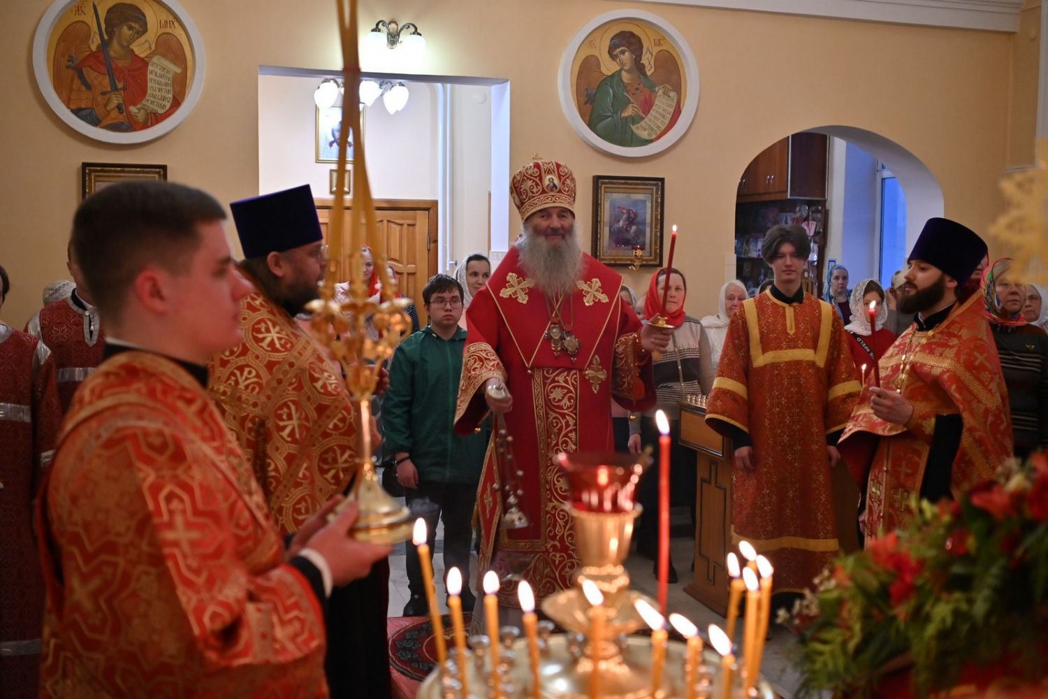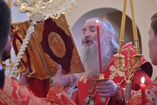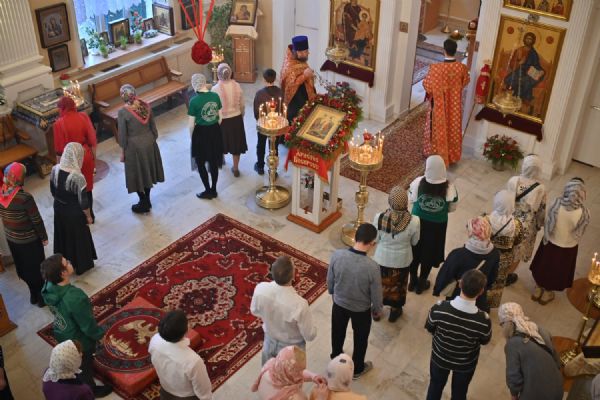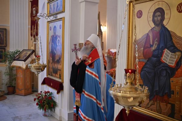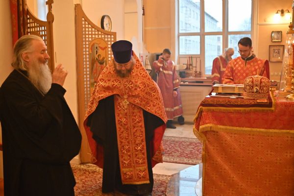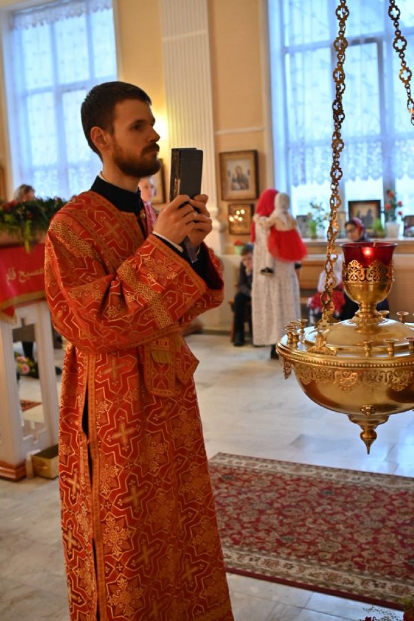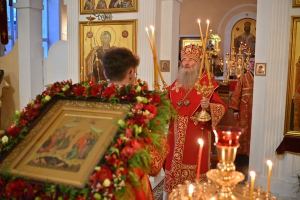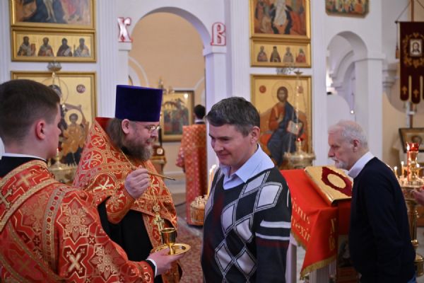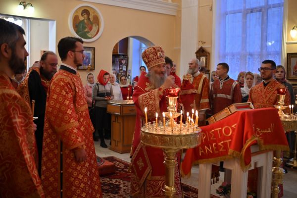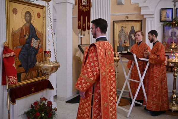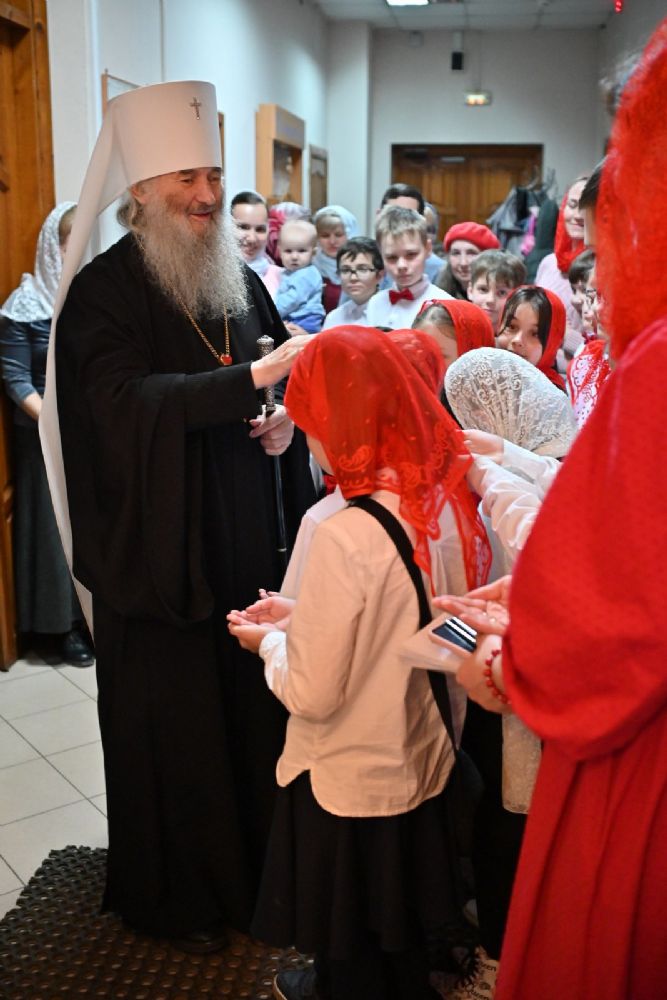Архипастырю сослужили настоятель храма протоиерей Евгений Сурков, клирики храма иерей Андрей Иванов и диакон Никита Сурков. Песнопения исполняли хор храма под управлением Аллы Симаковой и детский хор гимназии имени Сергия Радонежского.
