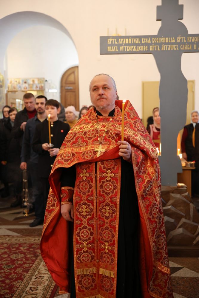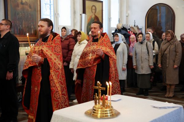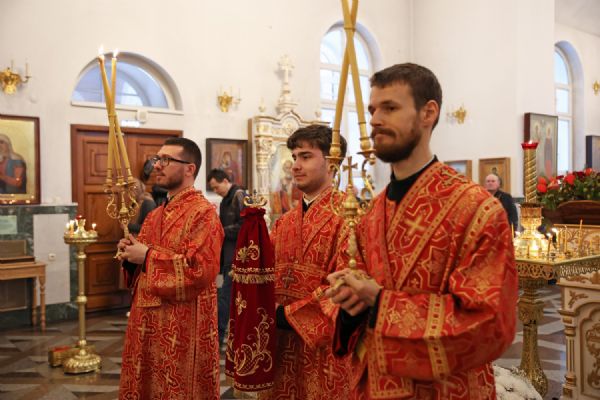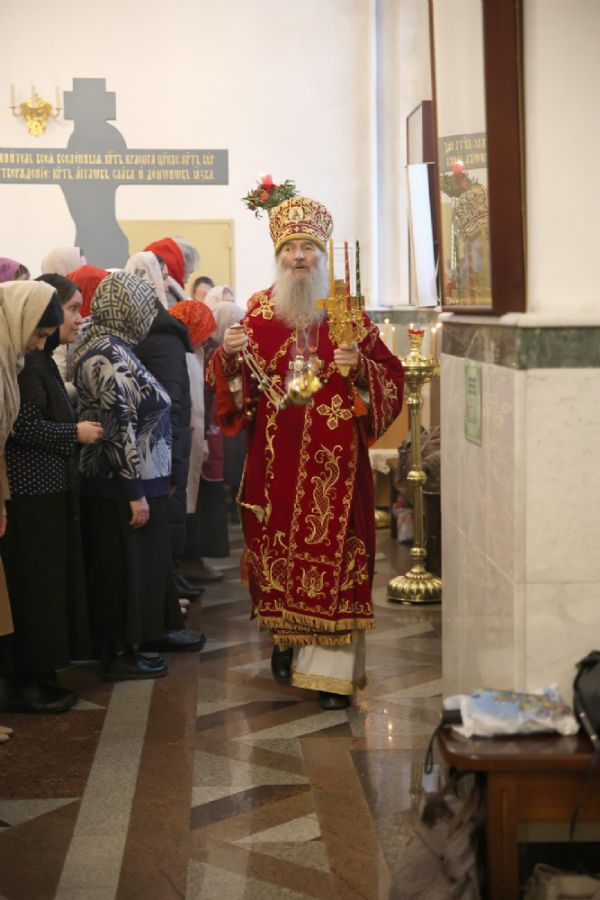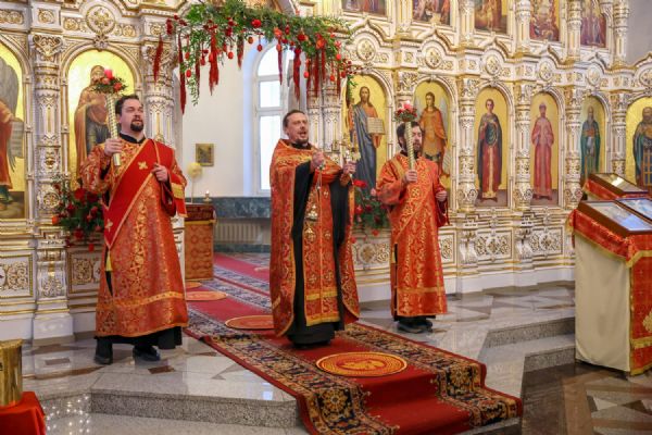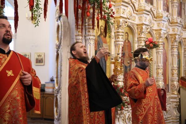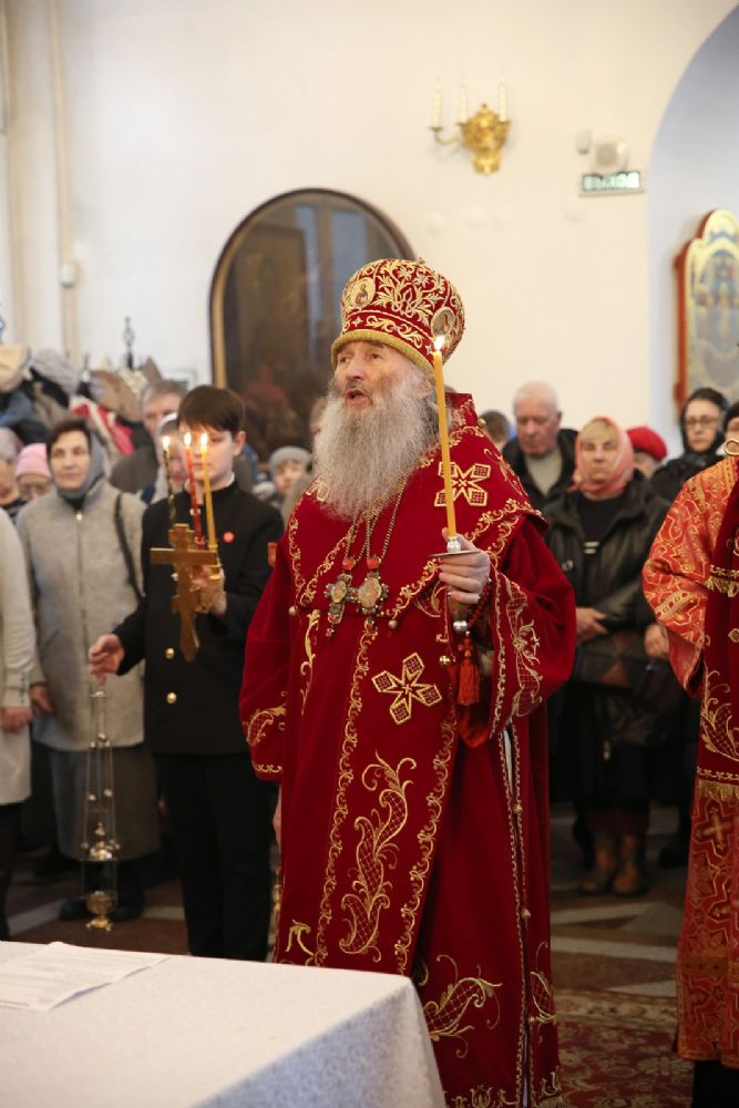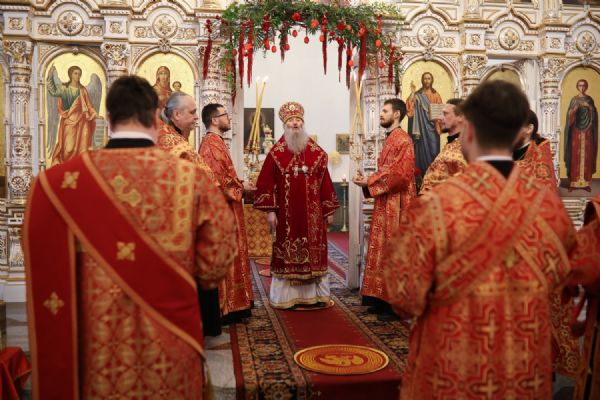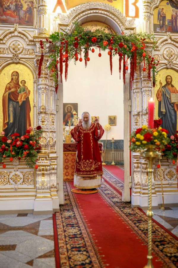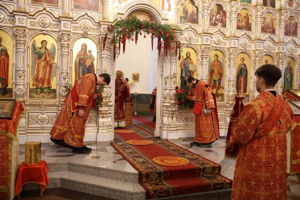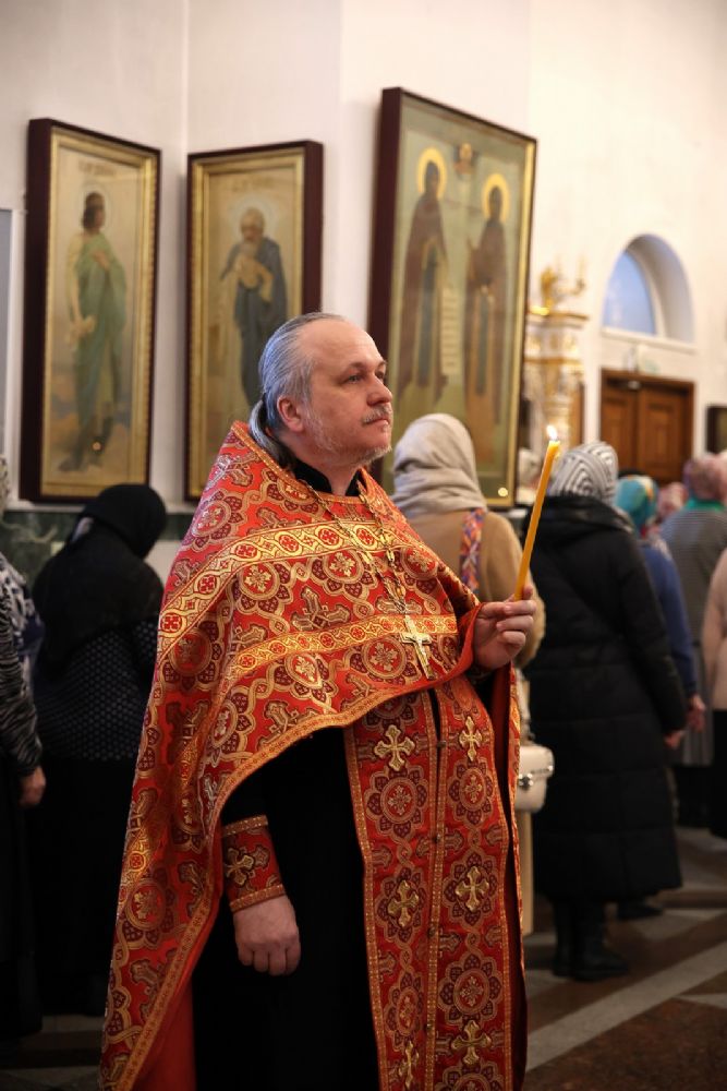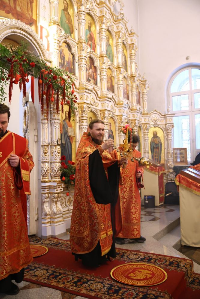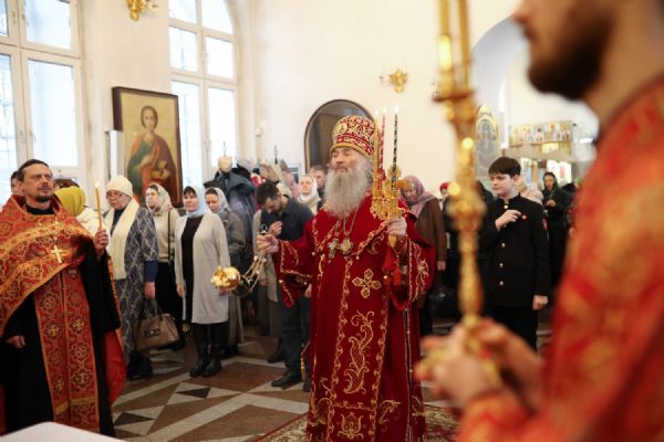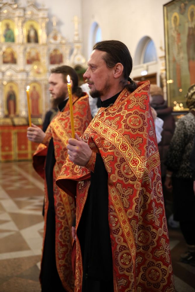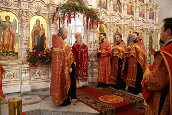 Архипастырю сослужили настоятель собора иерей Андрей Кочаков, клирики собора иерей Леонид Вылекжанин, иерей Димитрий Лукьянов и диакон Алексий Кузнецов, а также клирик Благовещенского кафедрального собора диакон Артемий Бобоч. Песнопения исполнял хор собора под управлением Алисы Вылегжаниной.