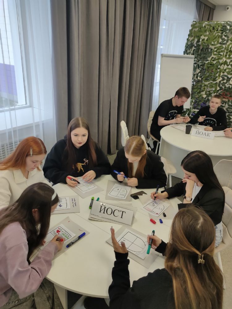 Далее слово предоставили Анне Ларкиной — заместителю директора центра «Доверие», психологу. Она провела короткий тренинг на тему «Герб»: участники создавали индивидуальные гербы, а затем — общий командный герб.