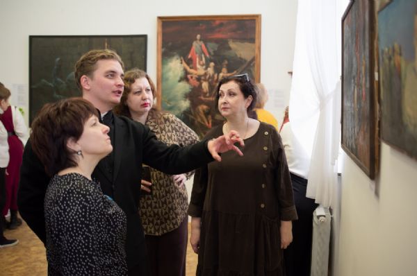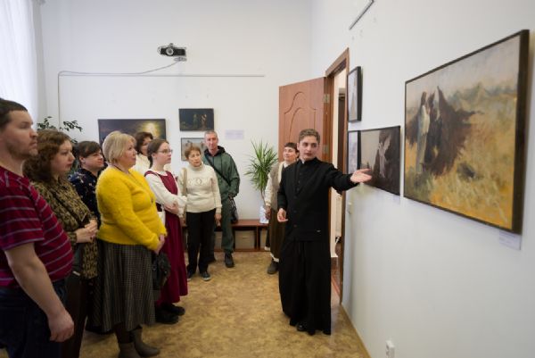 Директор «Шукшанской богатырской заставы» с. Елембаево Андрей Бажанов провел для собравшихся экскурсию по выставке, разъяснив смысл библейских сюжетов, изображенных на картинах.