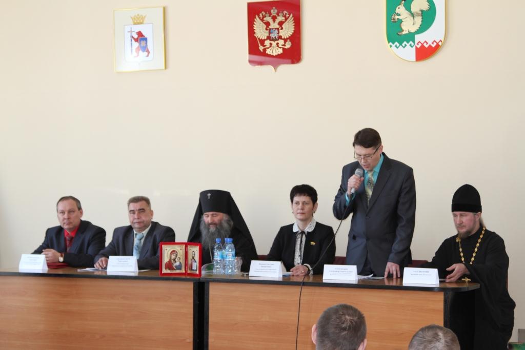 Высокопреосвященнейший Иоанн, архиепископ Йошкар-Олинский и Марийский, совершил Божественную Литургию в Богоявленской церкви пос. Морки. По окончании её все присутствующие последовали в актовый зал Администрации района на научно-практическую конференцию.