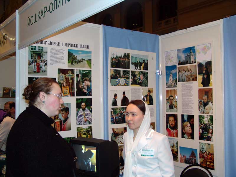 Стенд Йошкар-Олинской и Марийской епархии украсиил фотоработы, рассказывающие о возрождении духовной жизни, восстановлении храмов и монастырей в нашем крае. Посетители смогли познакомиться с работой иконописцев, переводчиков, катехизаторов, мысленно принять участие в проводимых в нашей епархии торжественных праздничных богослужениях, крестных ходах и культурно-массовых мероприятиях. Отдельная панель стенда была посвящена новомученикам марийским — епископу Леониду, священникам Адриану и Михаилу.
