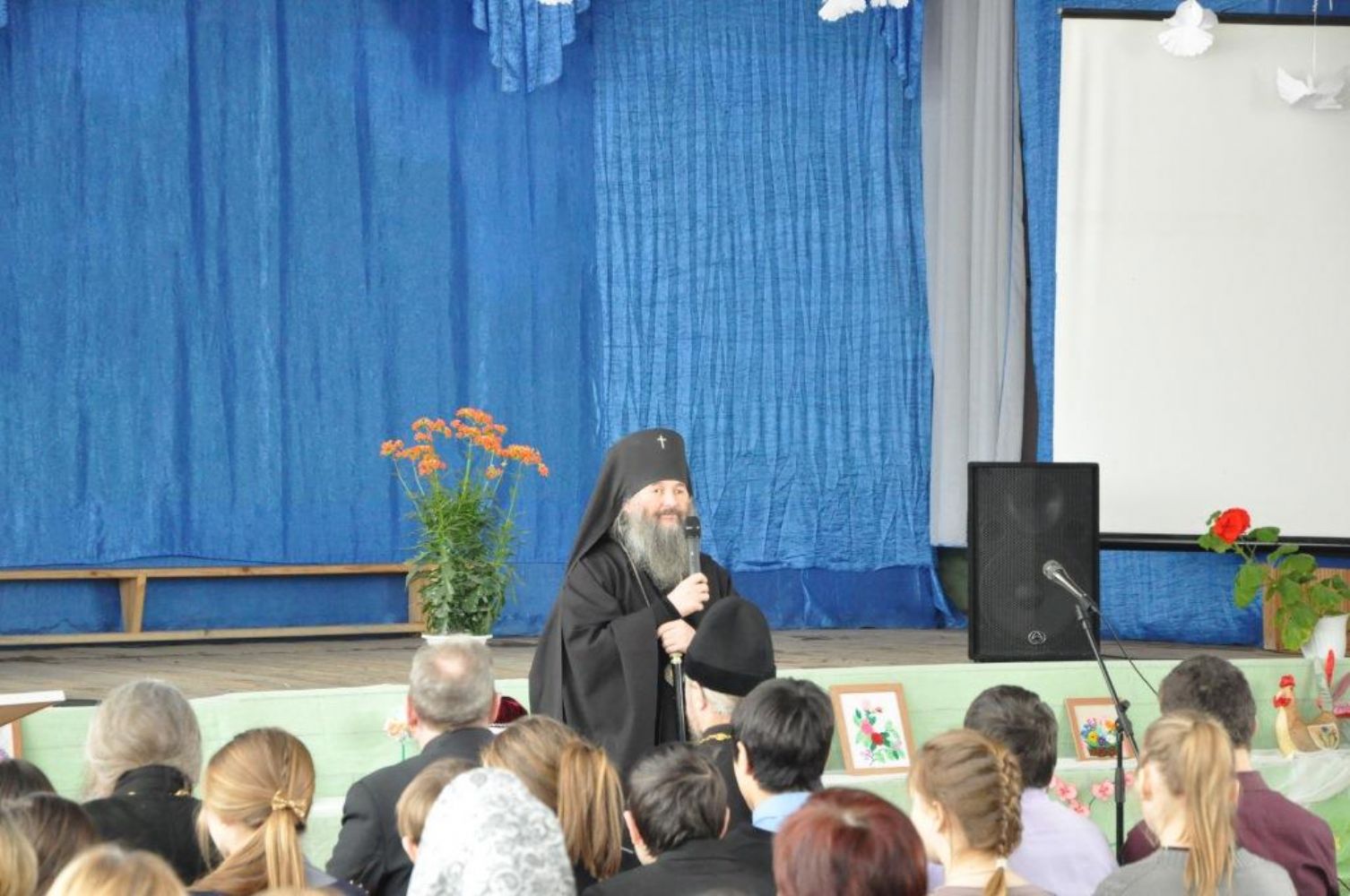 После Божественной литургии владыка Иоанн посетил общеобразовательную школу №1 п. Морки. В актовом зале Его Высокопреосвященство встретился с учащимися и учителями, провел беседу, ответил на насущные вопросы. После чего гостям был показан концерт.