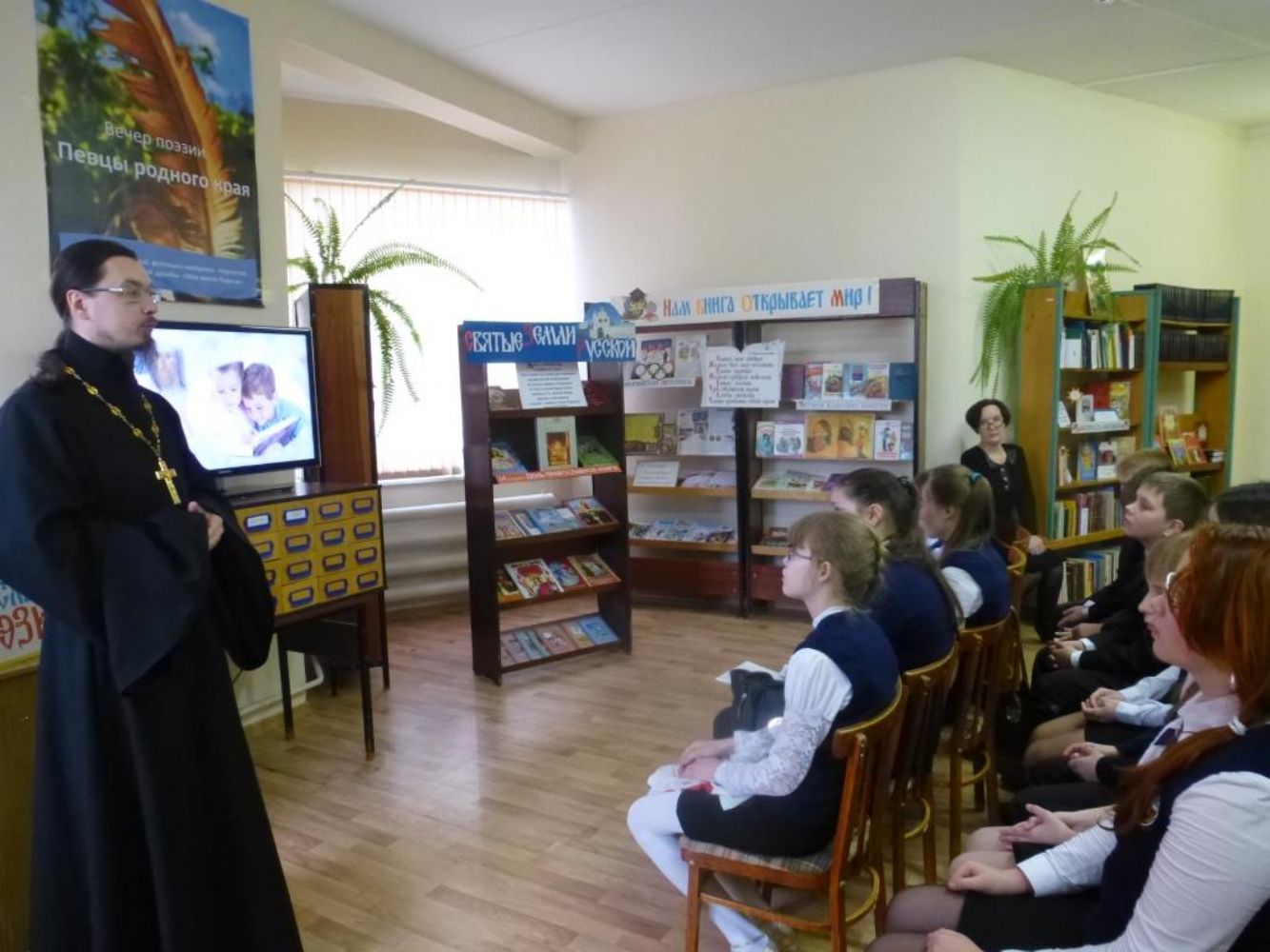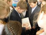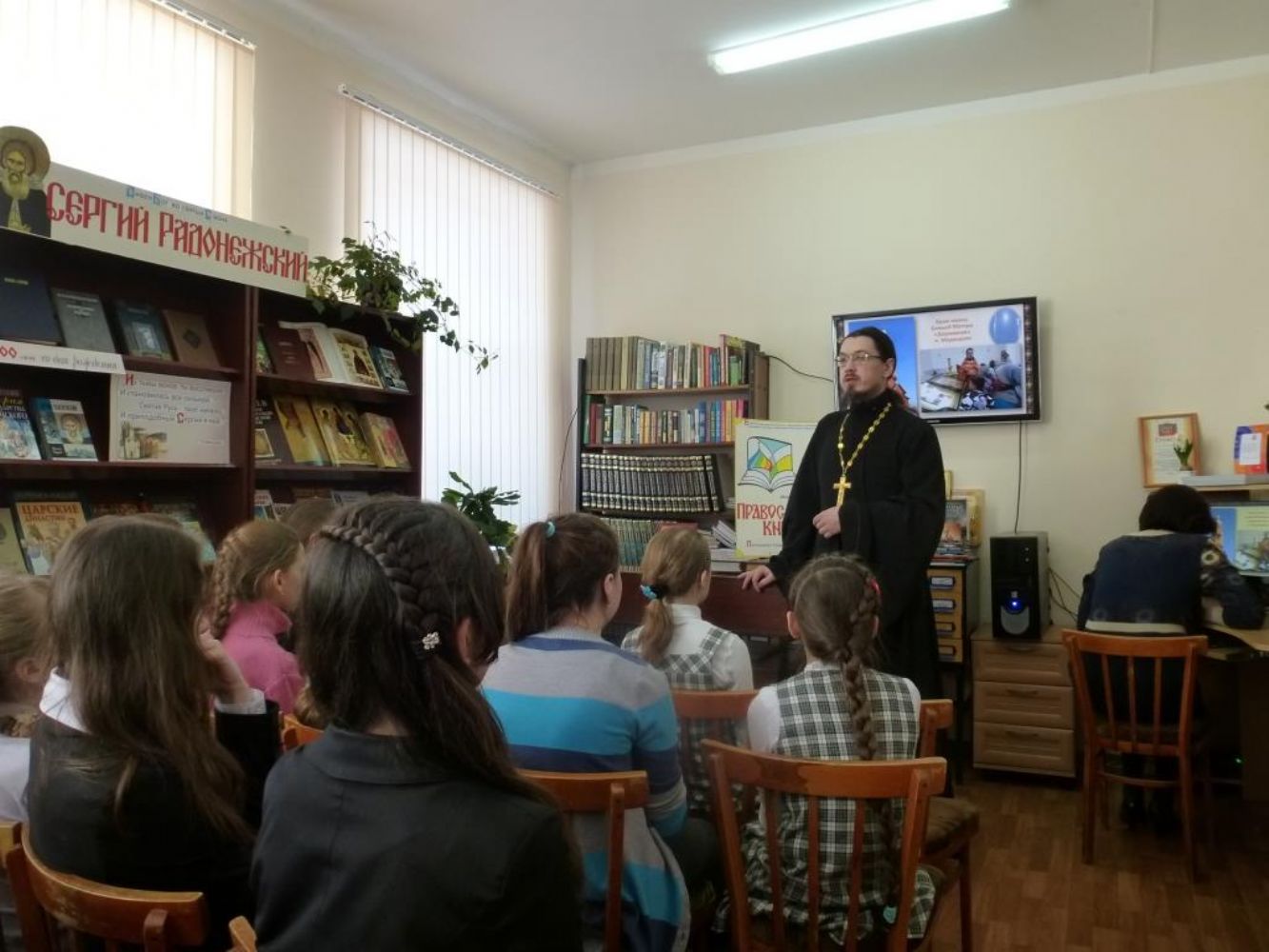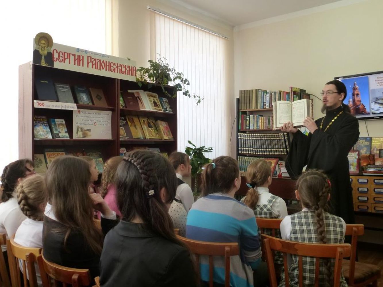 Он рассказал школьникам о значении праздника и о роли книг в культуре человечества, о личности преподобного Сергия Радонежского, 700-летний юбилей которого празднуется в этом году. Заведующая абонентским отделом библиотеки Н.Е. Костылева рассказала об истории развития книжного дела и о востребованности духовной литературы и в наши дни. Дети могли познакомиться с выставкой книг, посвященной прп. Сергию и подборкой новых православных книг, незадолго до праздника переданной приходом в дар районной библиотеке.