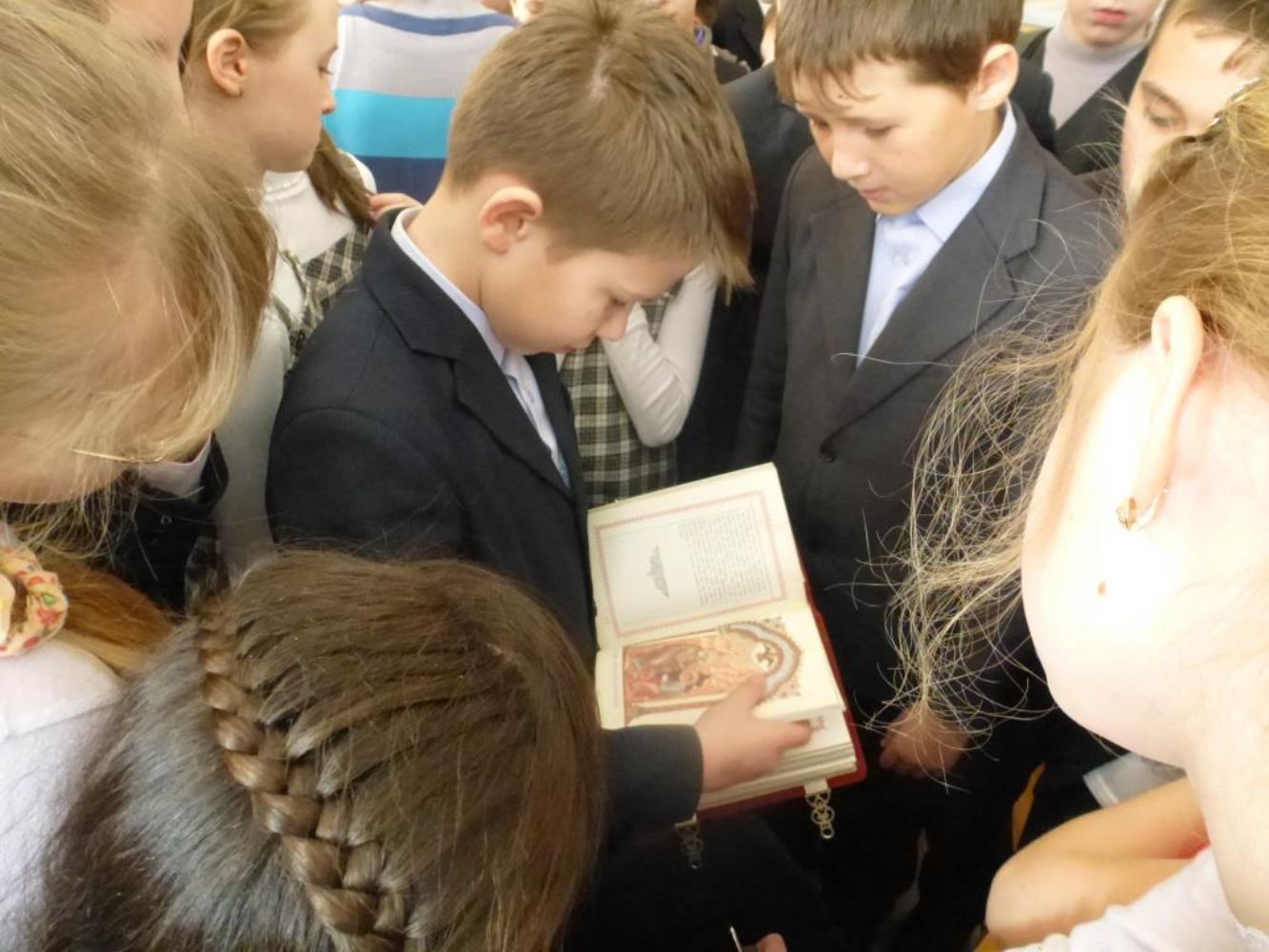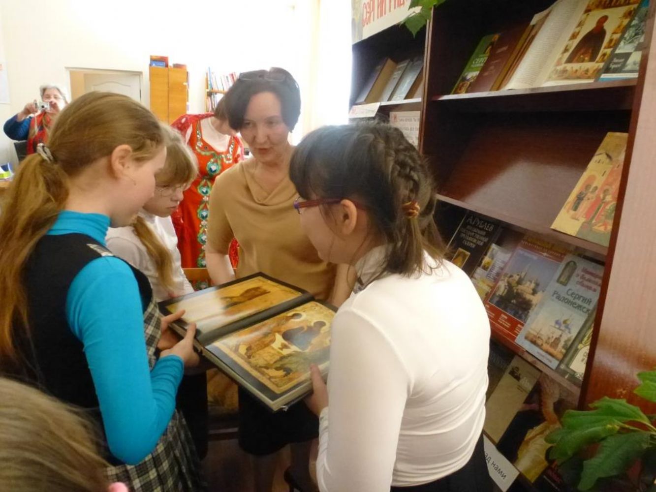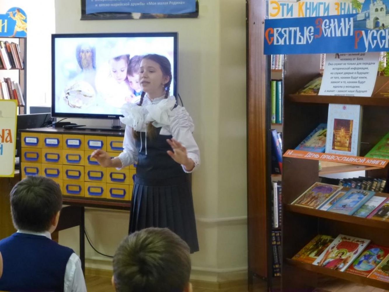 Он рассказал школьникам о значении праздника и о роли книг в культуре человечества, о личности преподобного Сергия Радонежского, 700-летний юбилей которого празднуется в этом году. Заведующая абонентским отделом библиотеки Н.Е. Костылева рассказала об истории развития книжного дела и о востребованности духовной литературы и в наши дни. Дети могли познакомиться с выставкой книг, посвященной прп. Сергию и подборкой новых православных книг, незадолго до праздника переданной приходом в дар районной библиотеке.