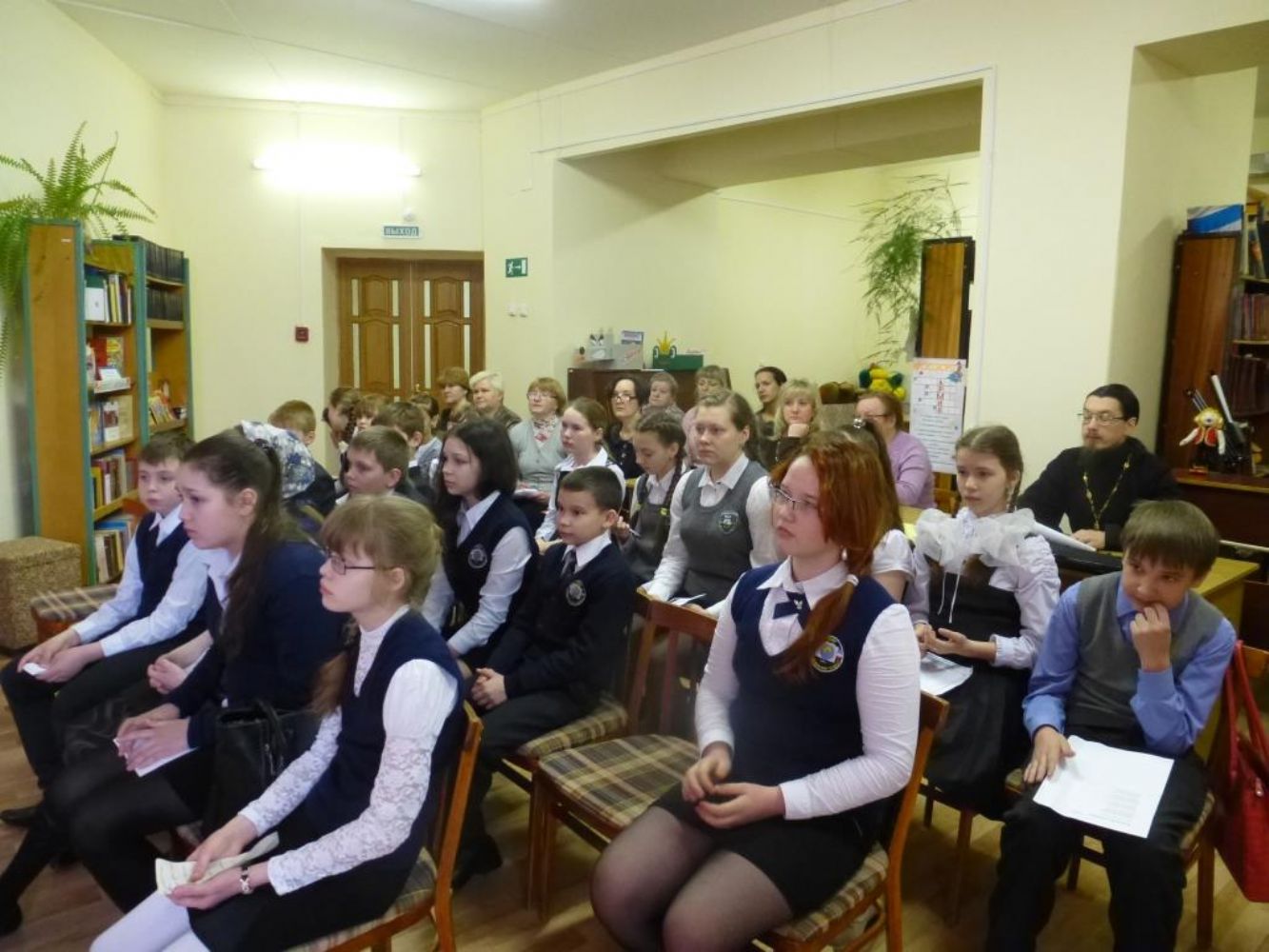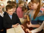 В последующие дни настоятель храма иерей Алексей Михайлов и педагог-катехизатор прихода И.Л. Рыжова посетили с беседами среднюю общеобразовательную школу № 2. Священник выступил перед учащимися 8 и 10 классов, побеседовав с ними о даре слова, который человек получил от Бога, и о грехе сквернословия, весьма распространенном в наши дни, о тех последствиях, которые он приносит. Ираида Леонидовна побеседовала с учащимися 4-х классов на тему «Книга в нашей жизни», используя в качестве иллюстрации старинные книги из приходского фонда.