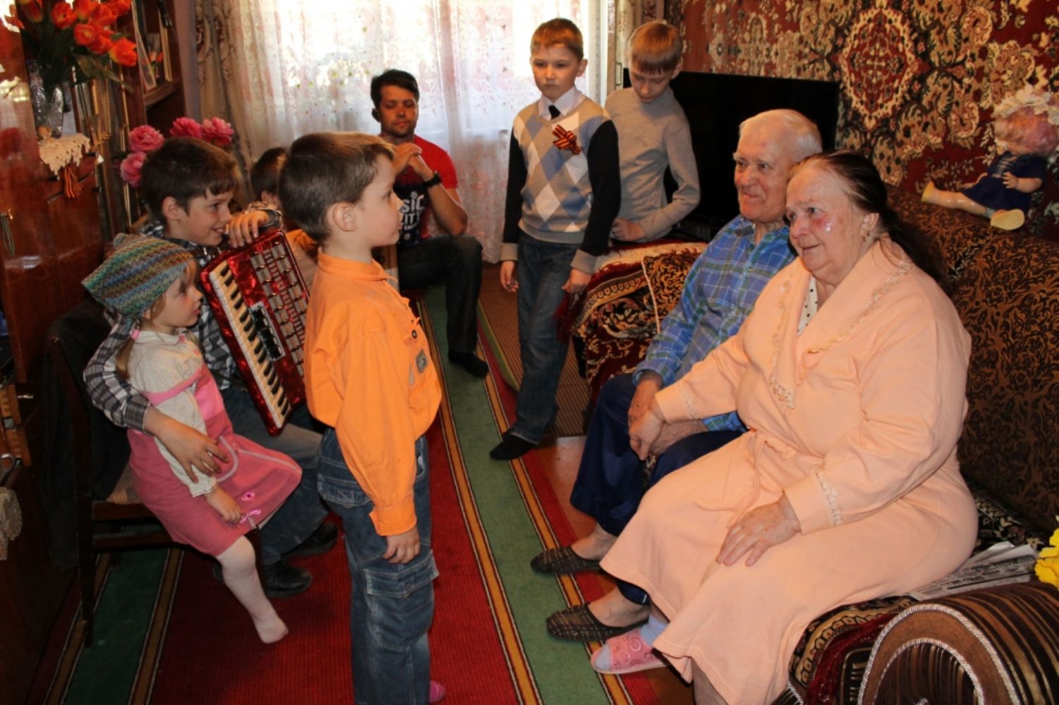 Дети выступили с небольшим концертом: читали стихотворения, играли на аккордеоне, баяне, вместе с ветеранами пели песни фронтовых лет. Ребята своими руками сделали поздравительные открытки, нарисовали рисунки к празднику. Они были подарены ветеранам вместе с букетами цветов.