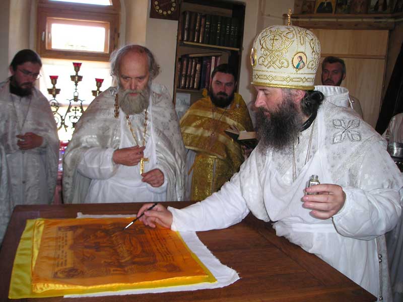 В семь часов утра, еще до приезда архиерея, в храме начался водосвятный молебен. После прибытия Владыки за закрытыми Царскими вратами началось освящение престола, завершившееся окроплением храма святой водой, помазанием стен святым миром и торжественным крестным ходом.